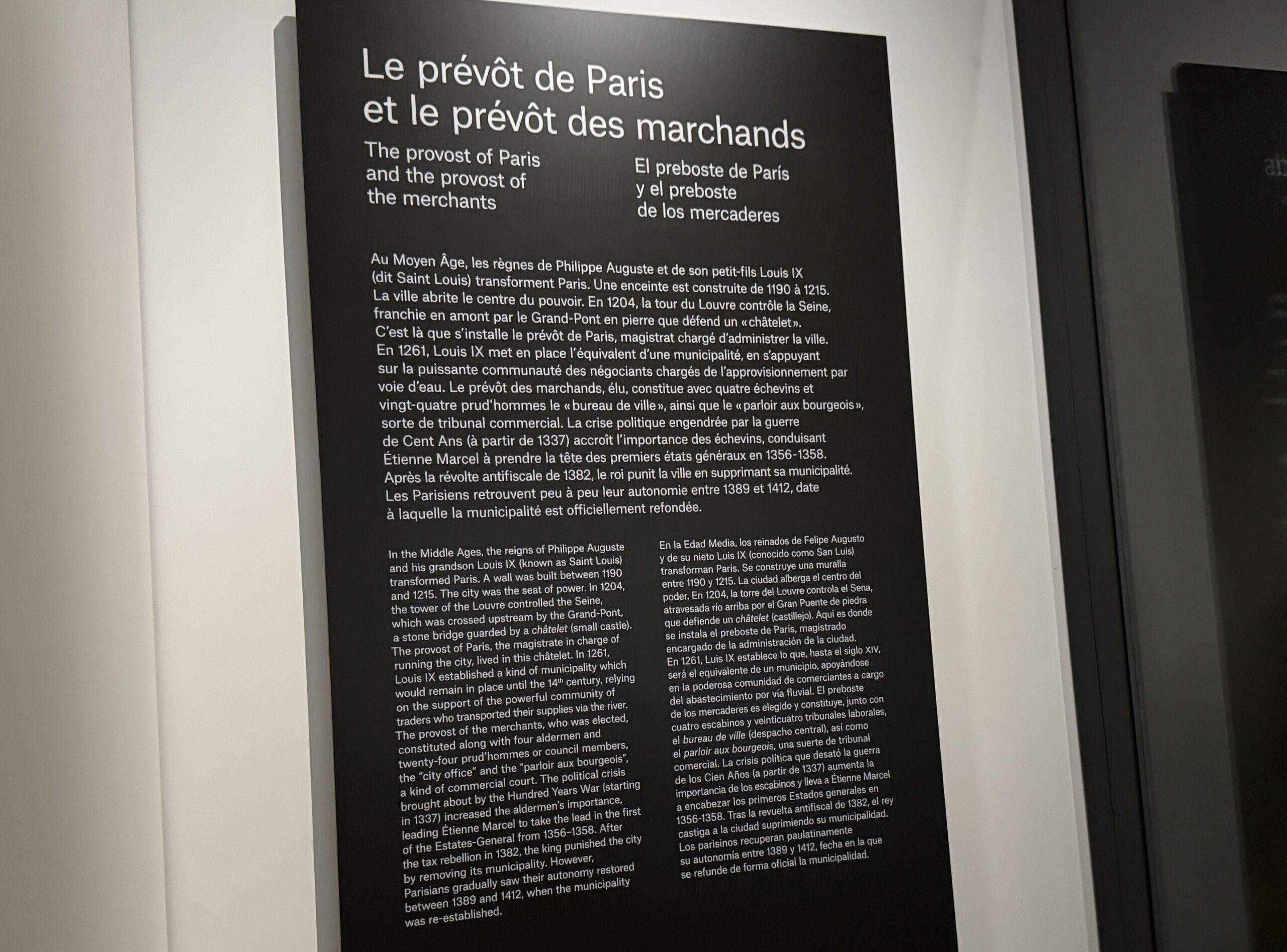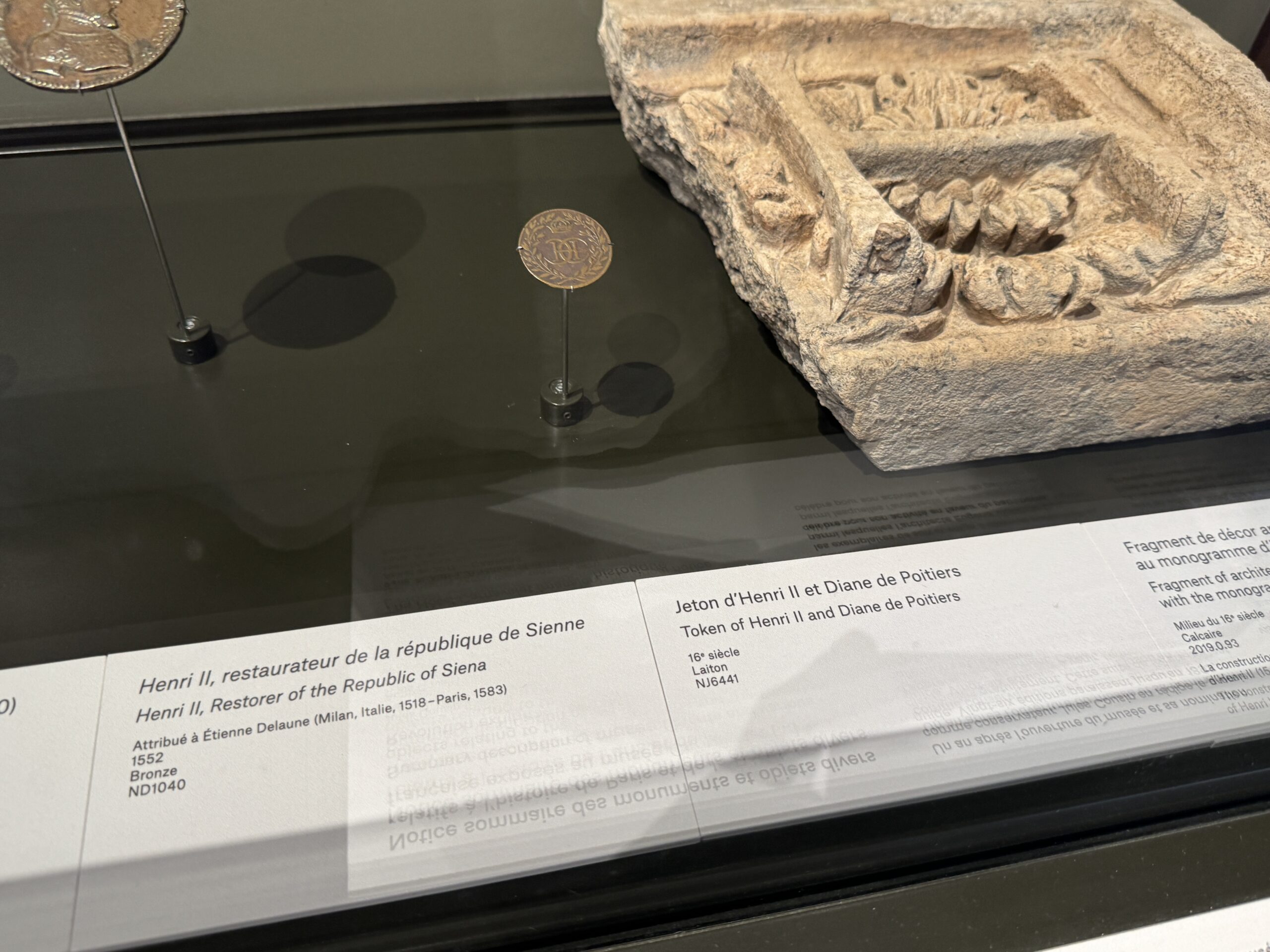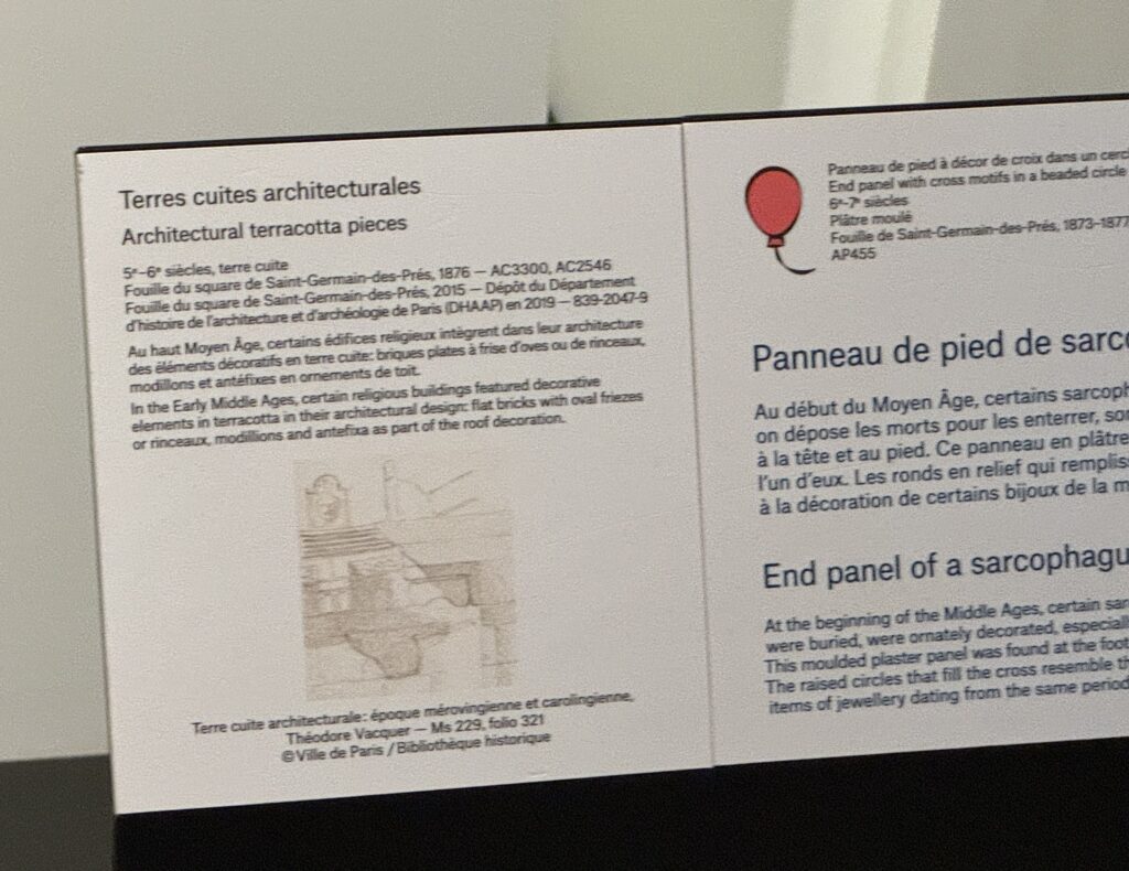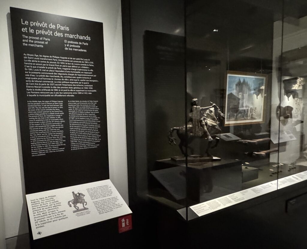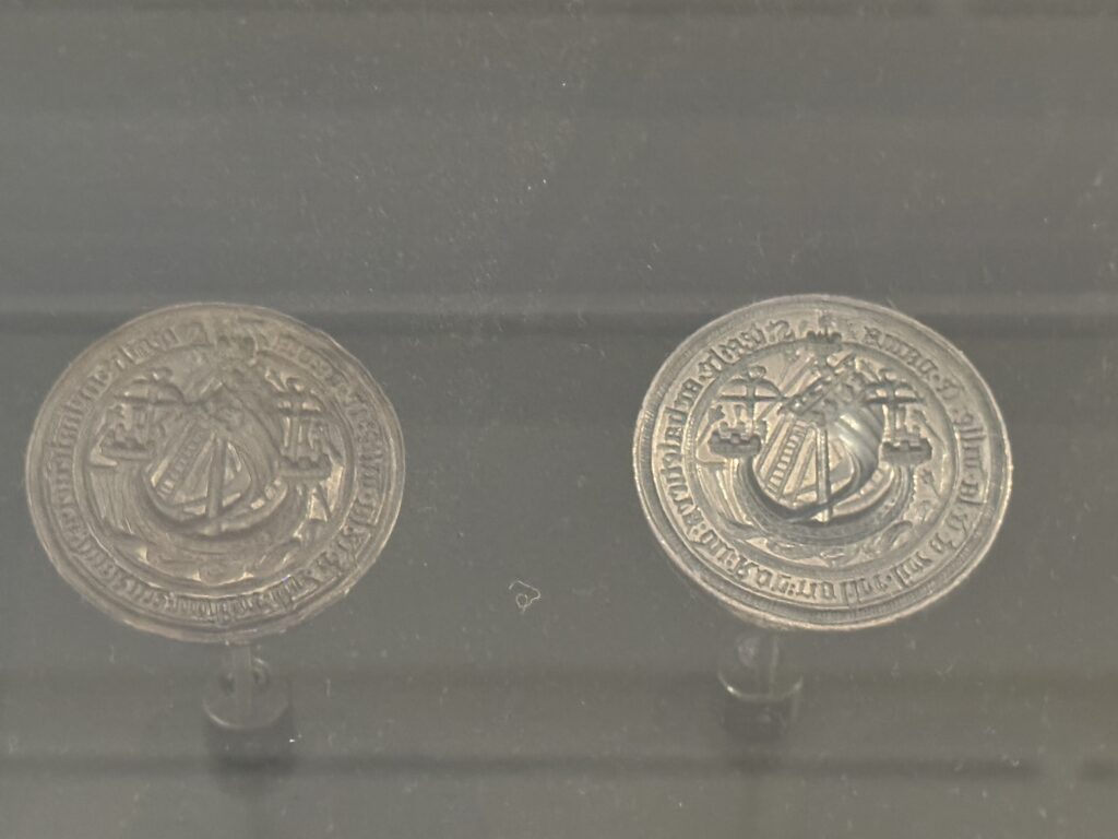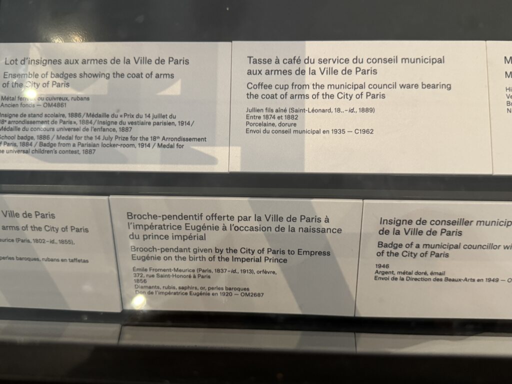 На табличке написано, что в витрине есть муниципальные разменные монеты 16  века и Печать королевских арбалетчиков и города Парижа (репродукции из бронзы и серебра).