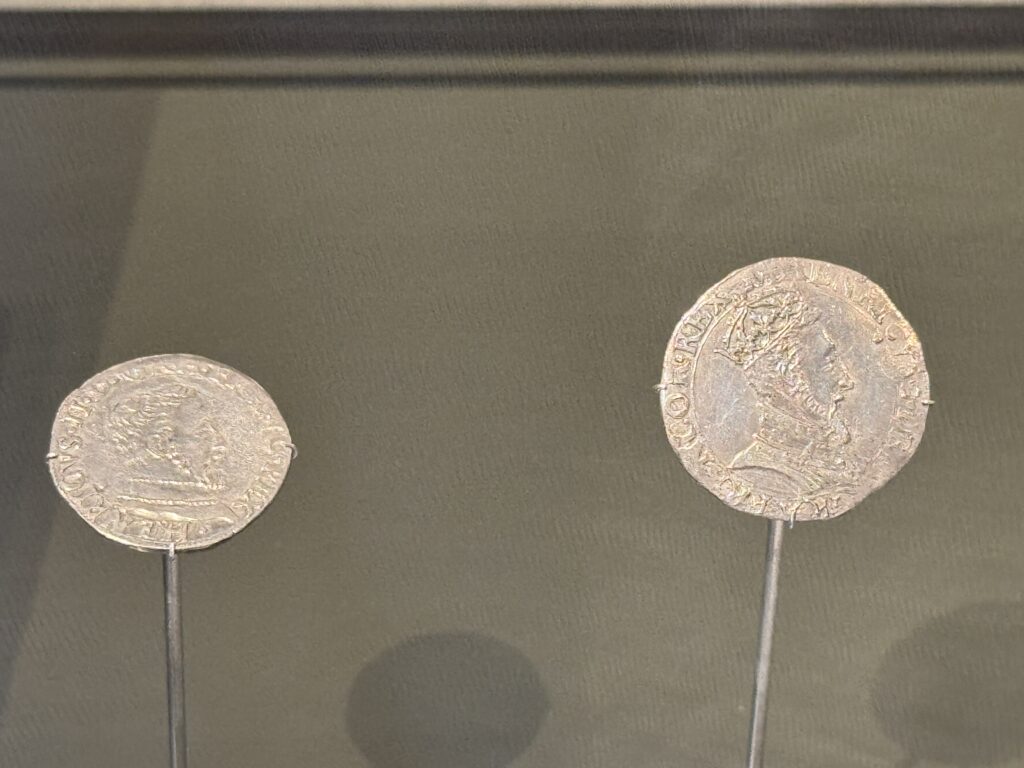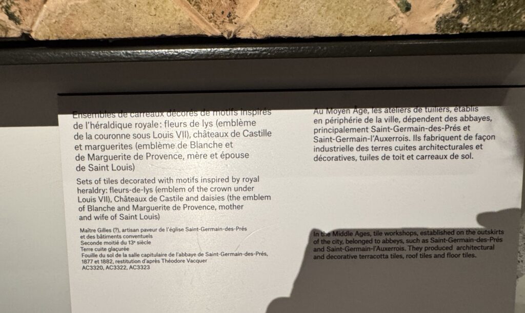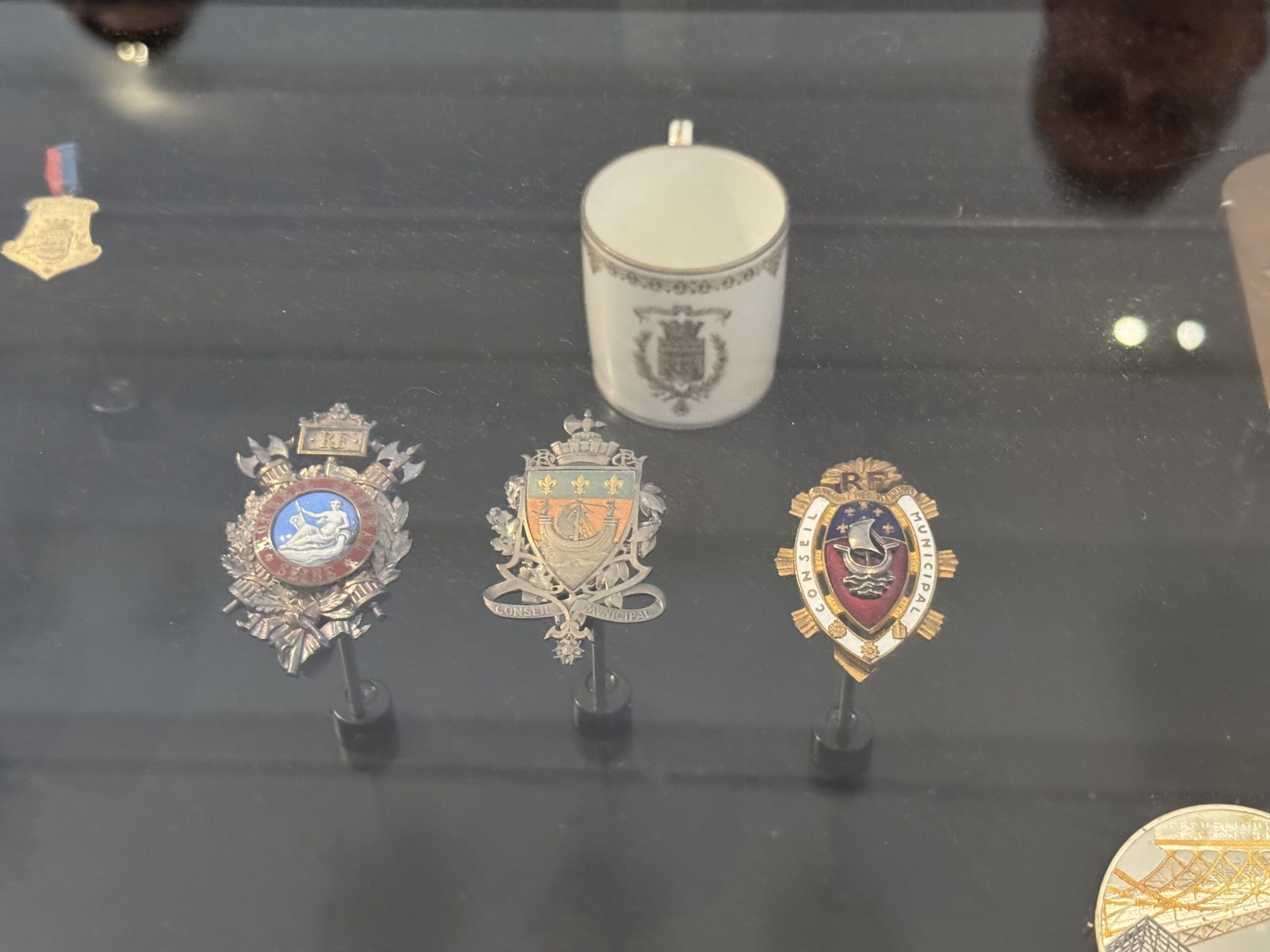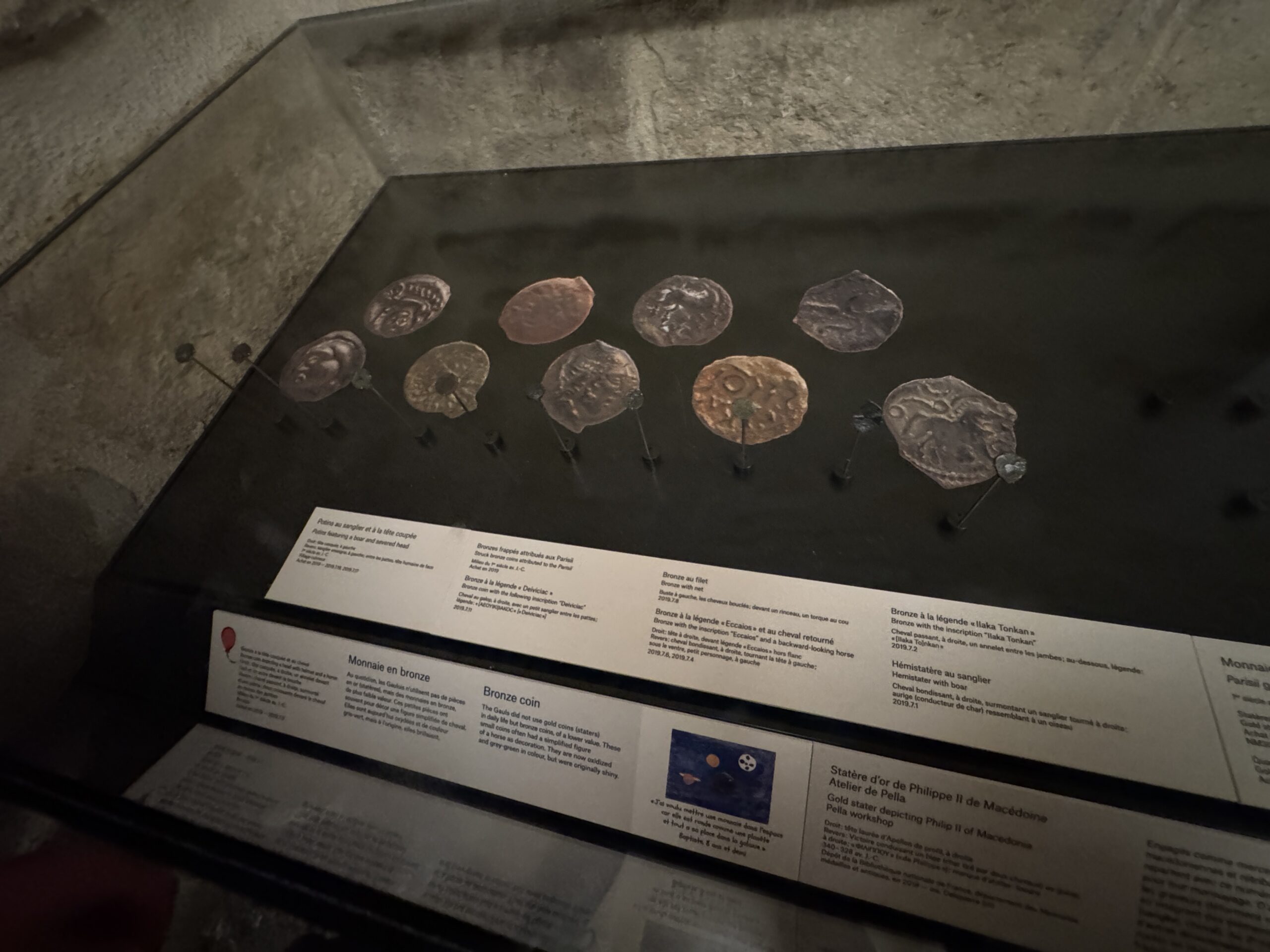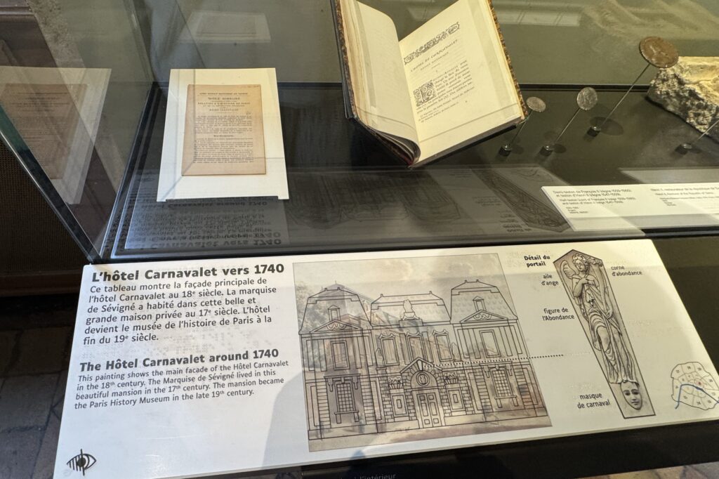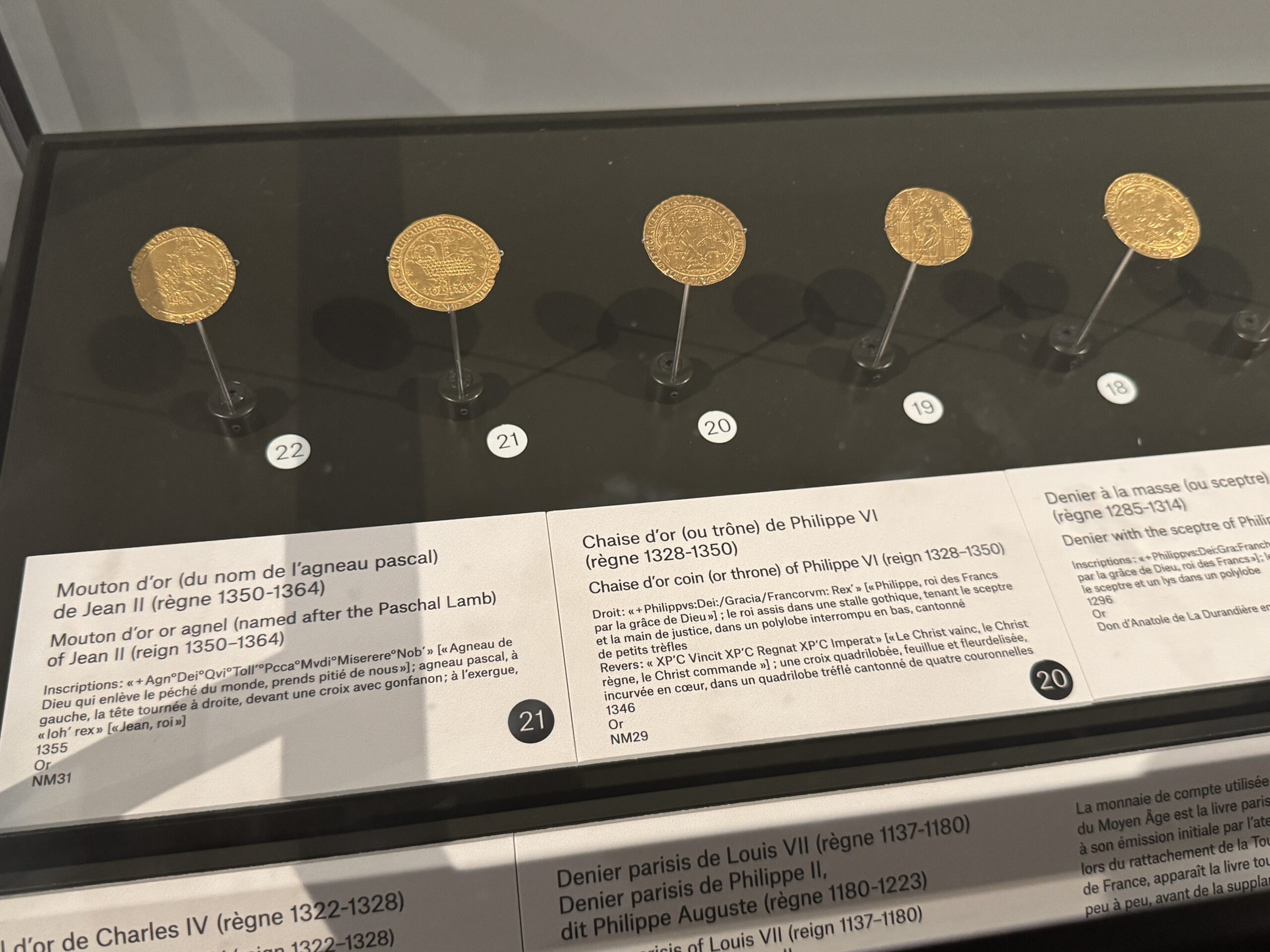 На табличке написано, что в витрине есть муниципальные разменные монеты 16  века и Печать королевских арбалетчиков и города Парижа (репродукции из бронзы и серебра).