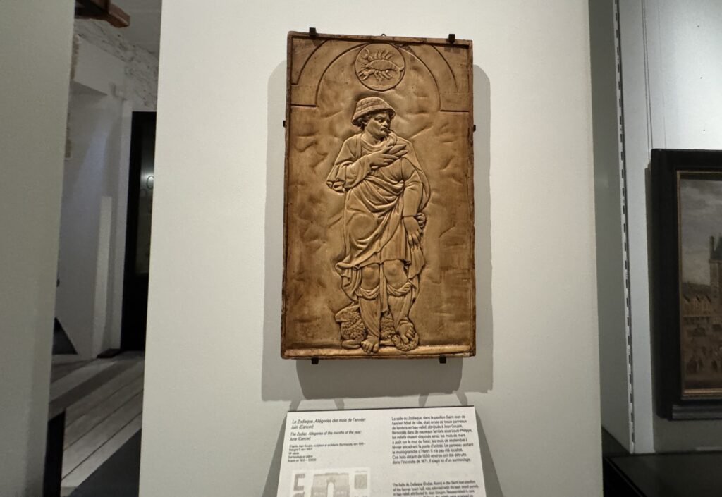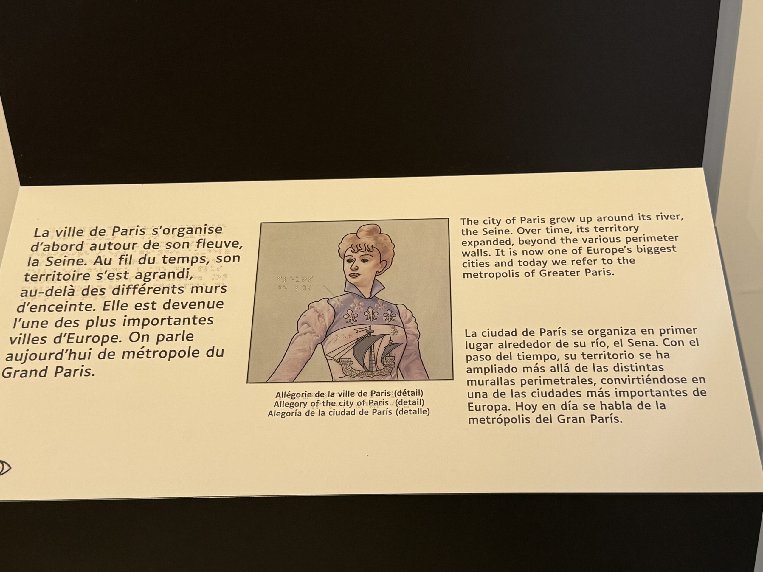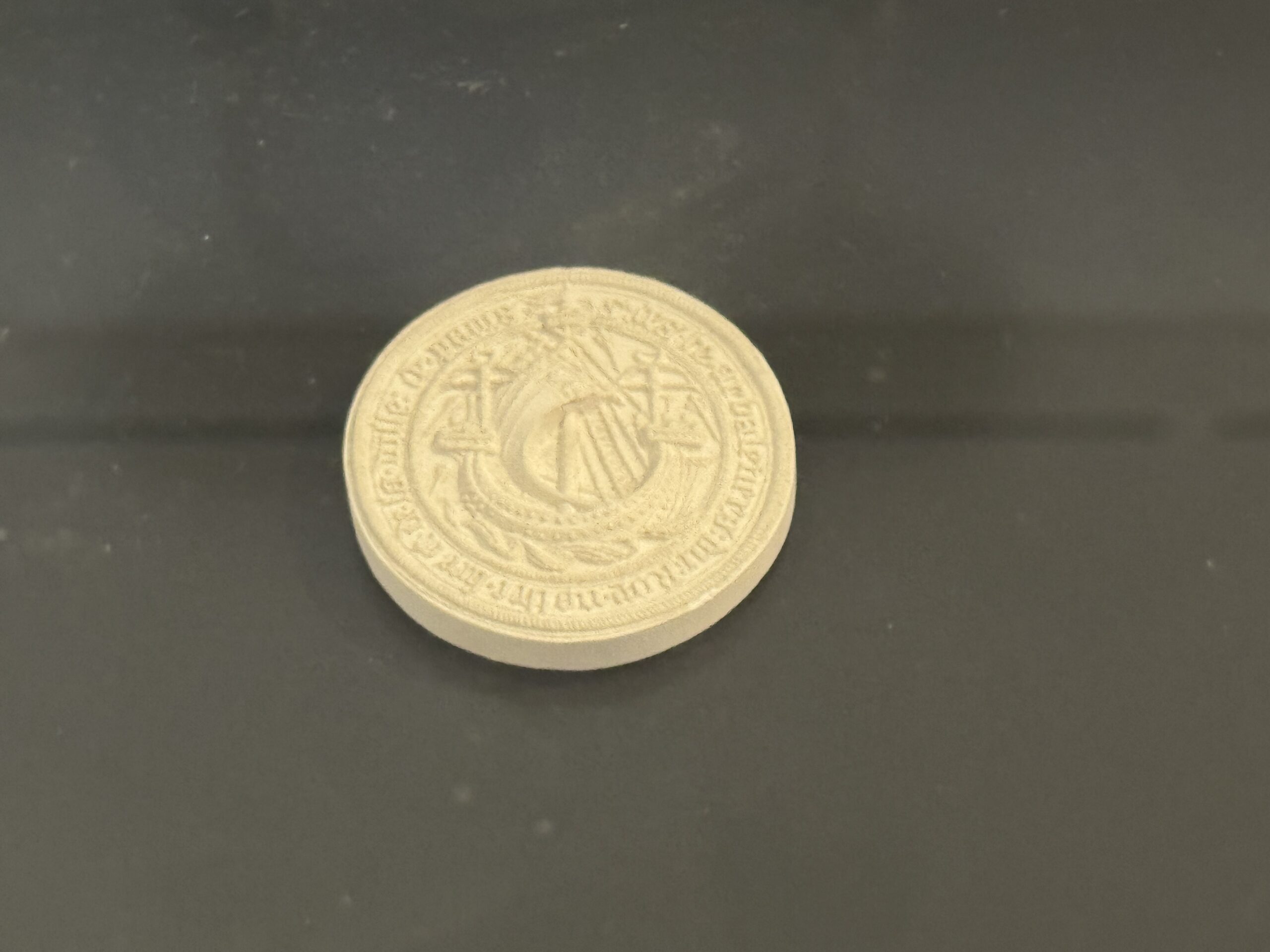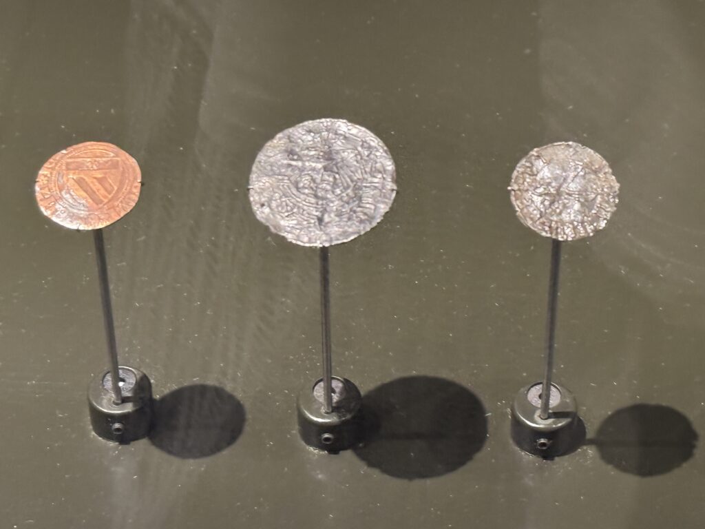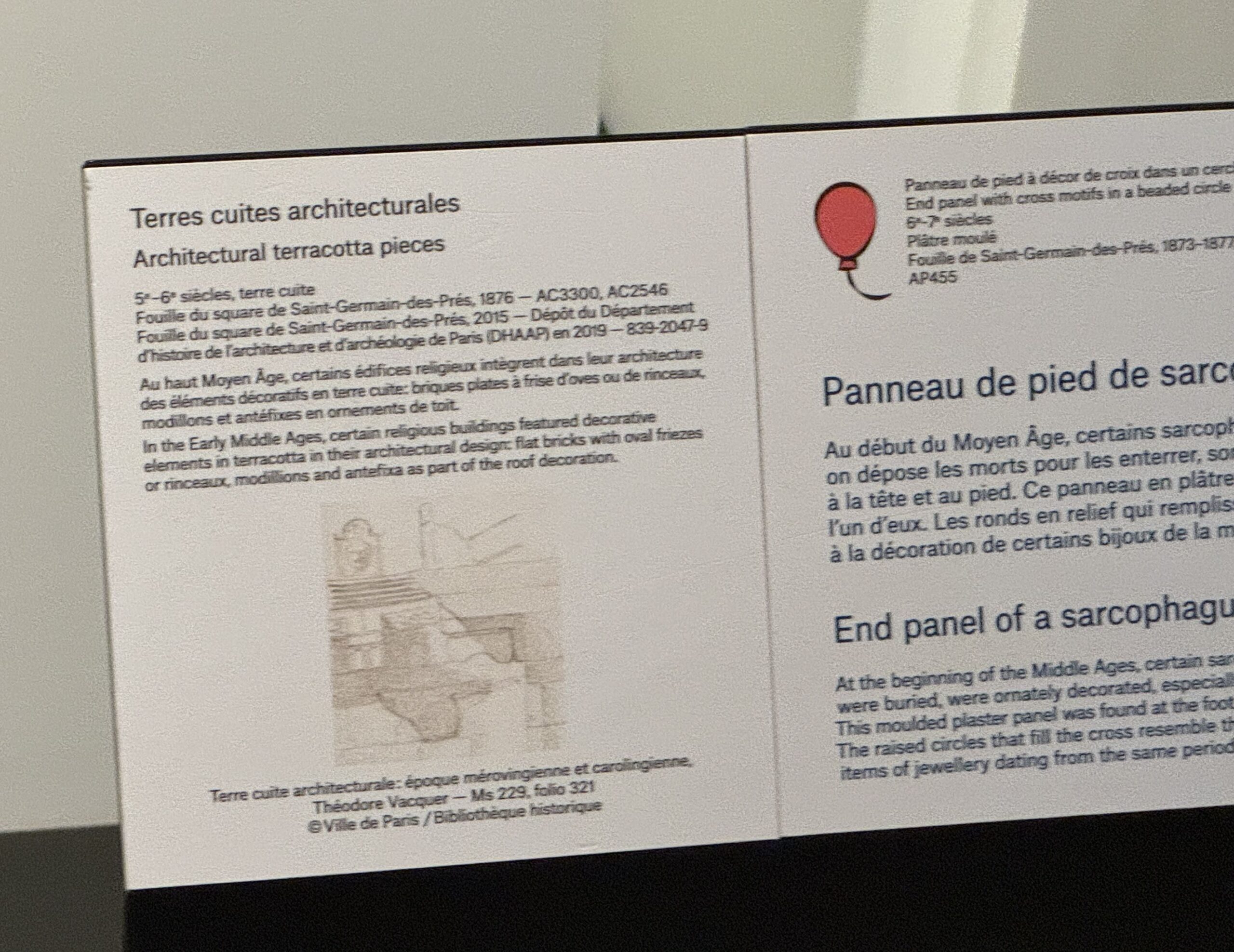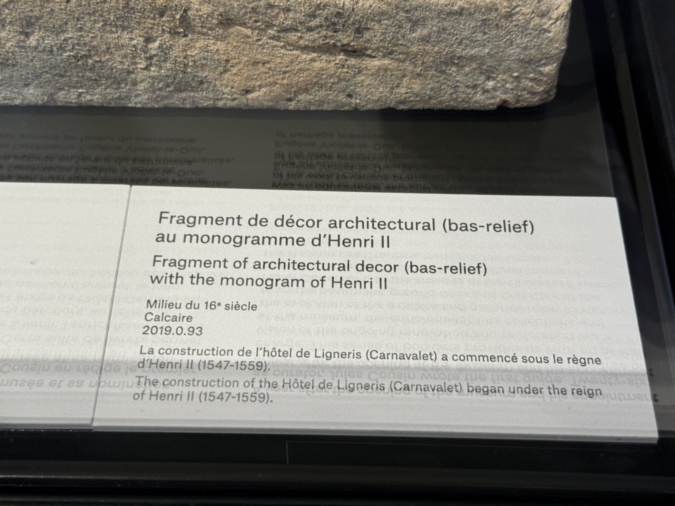 На табличке написано, что в витрине есть муниципальные разменные монеты 16  века и Печать королевских арбалетчиков и города Парижа (репродукции из бронзы и серебра).