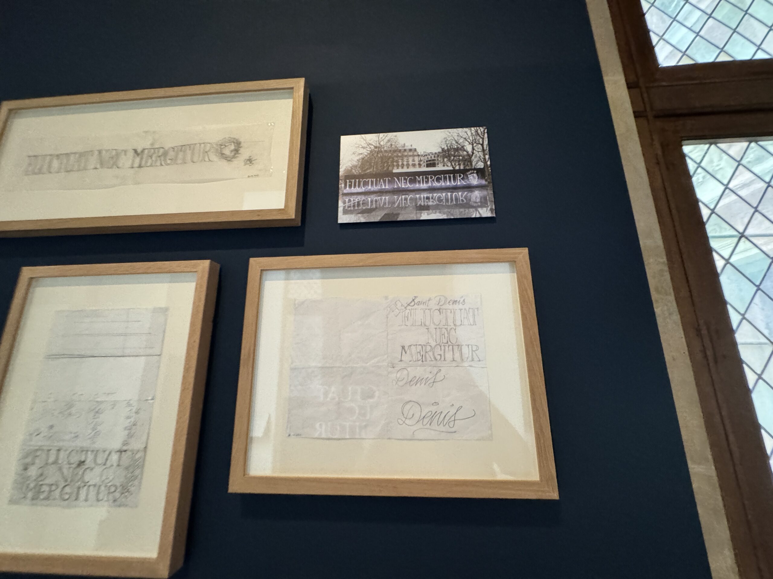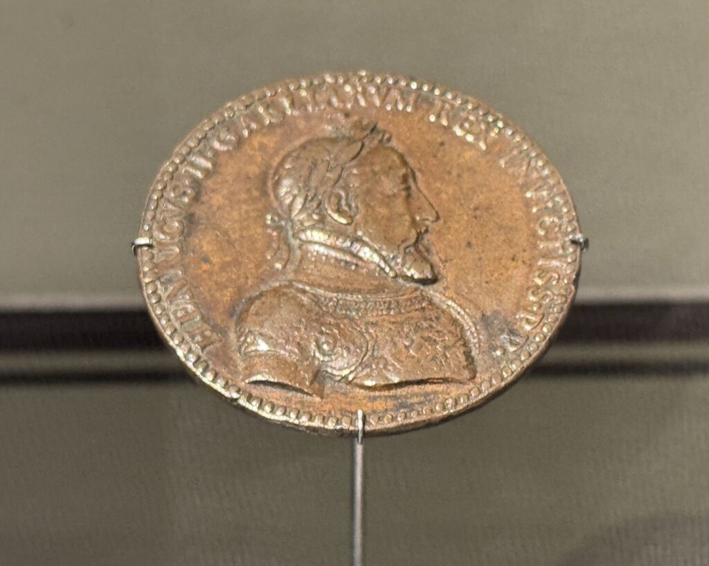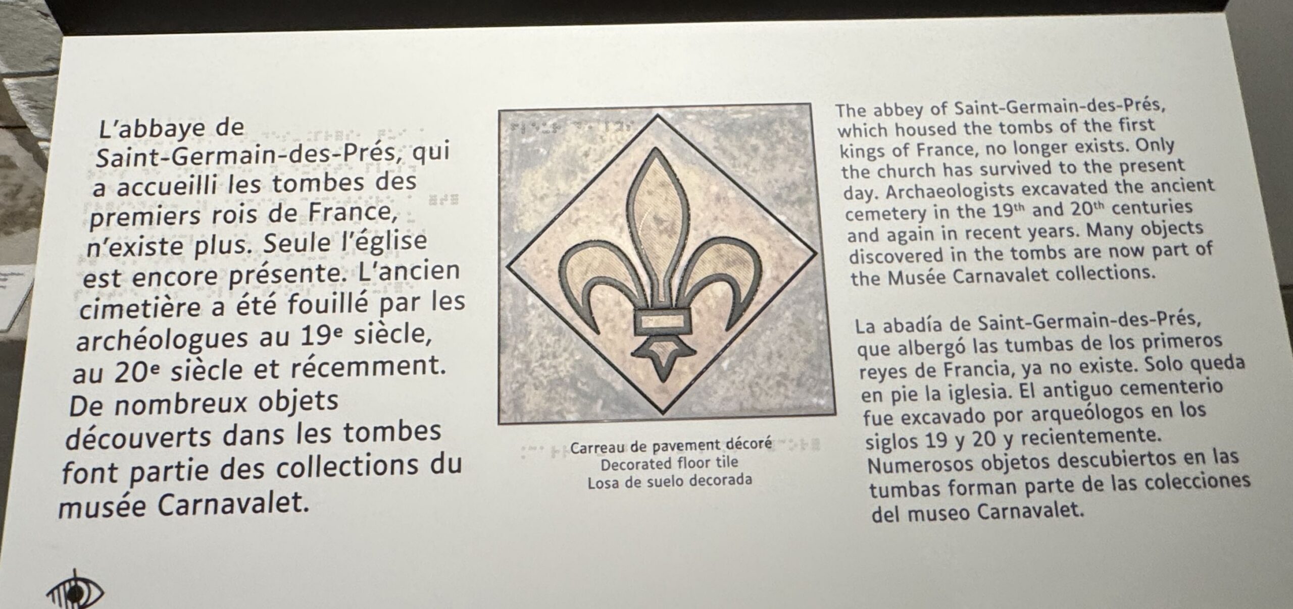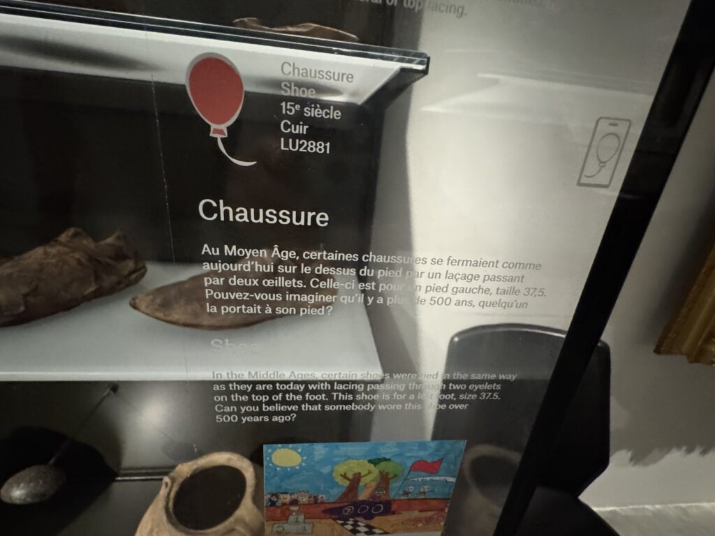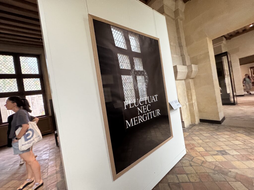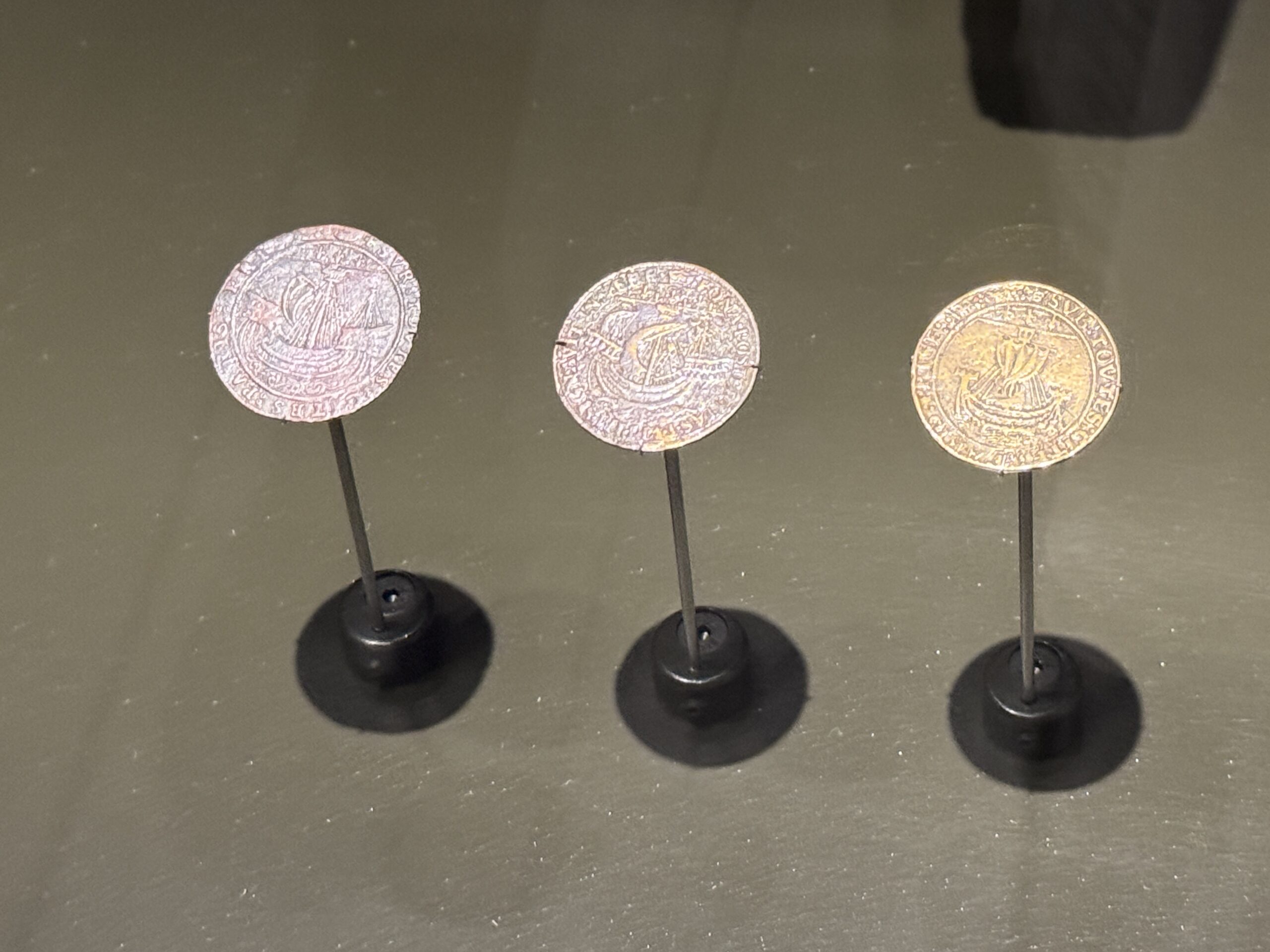 На табличке написано, что в витрине есть муниципальные разменные монеты 16  века и Печать королевских арбалетчиков и города Парижа (репродукции из бронзы и серебра).