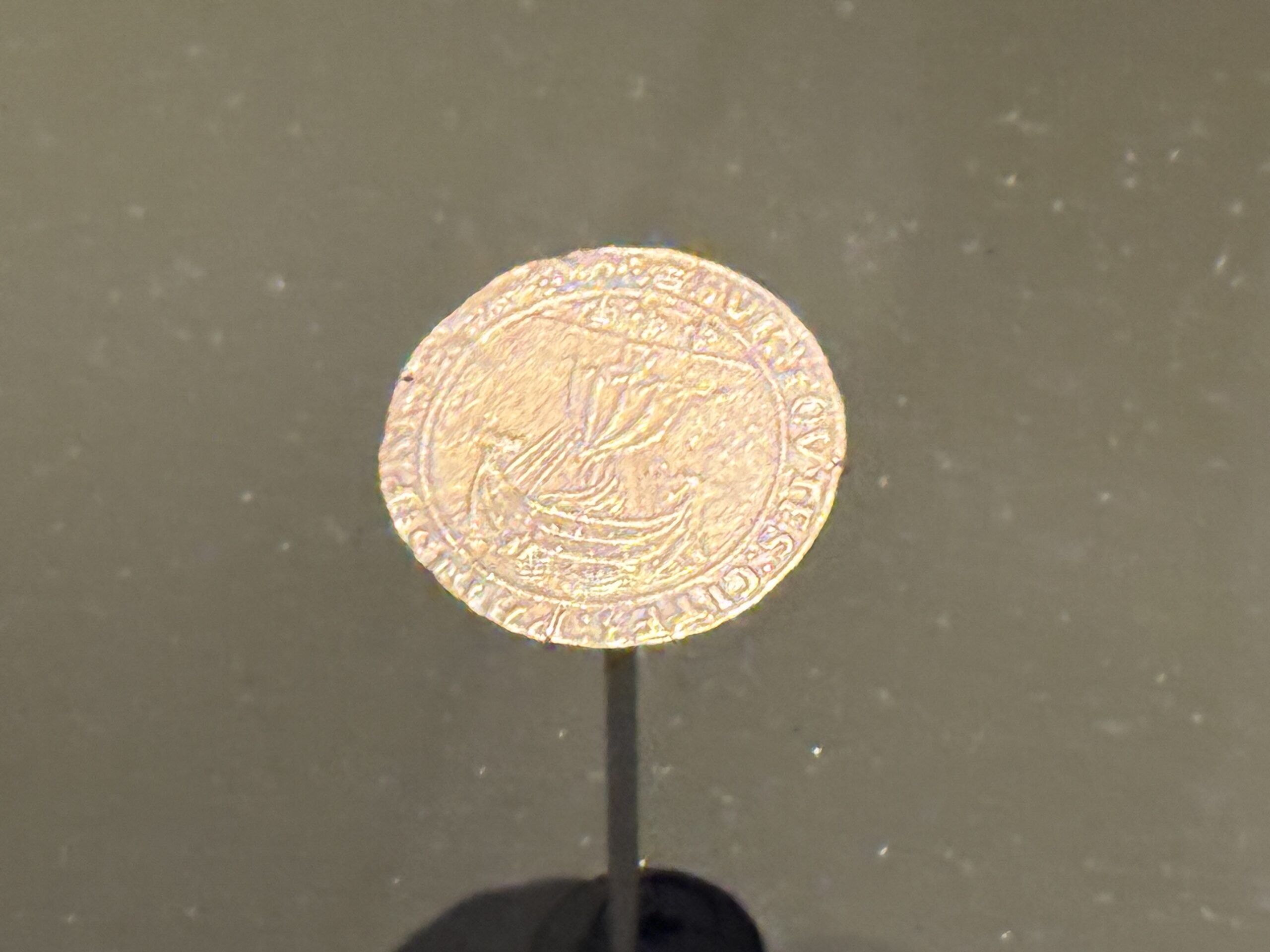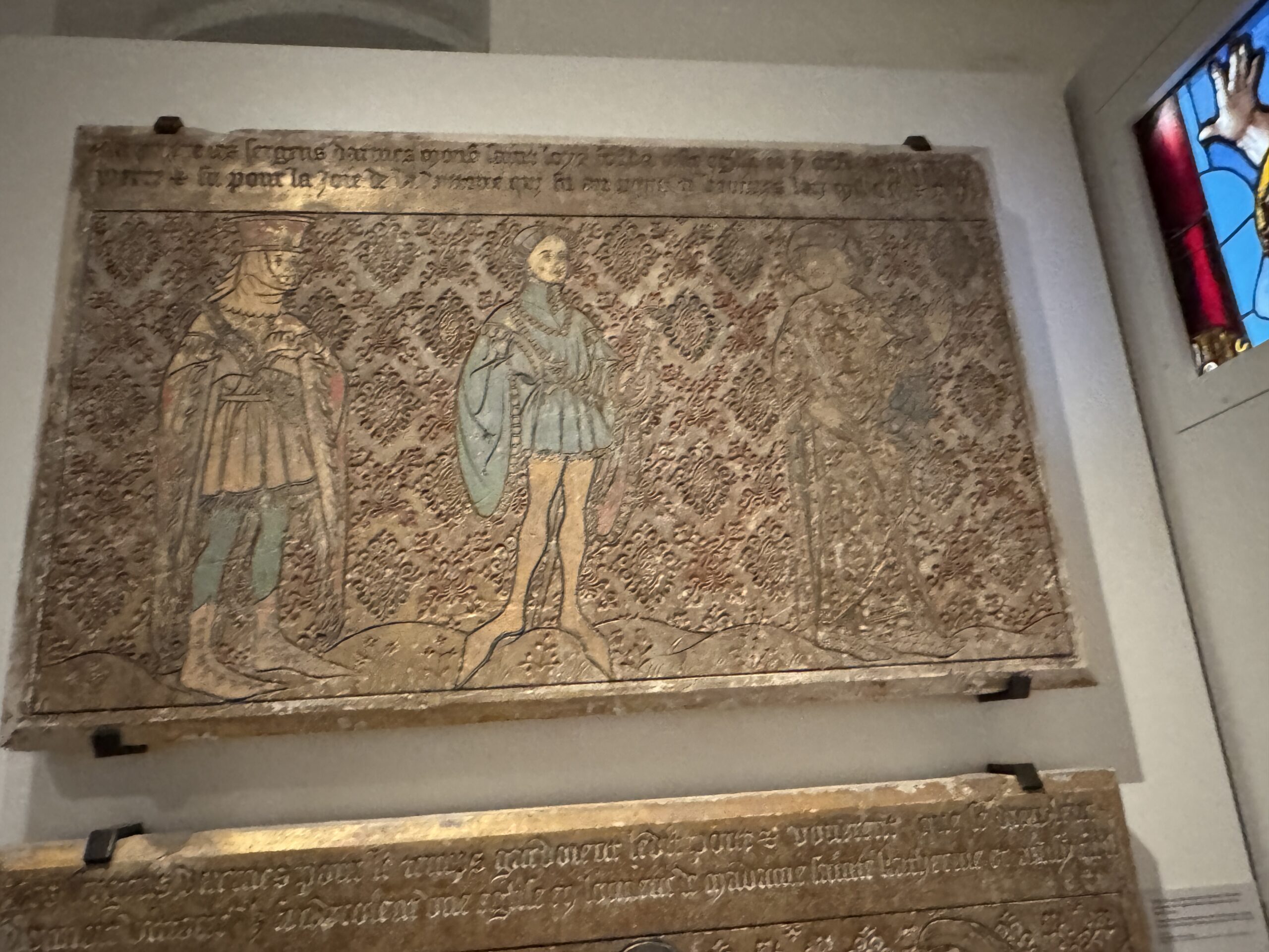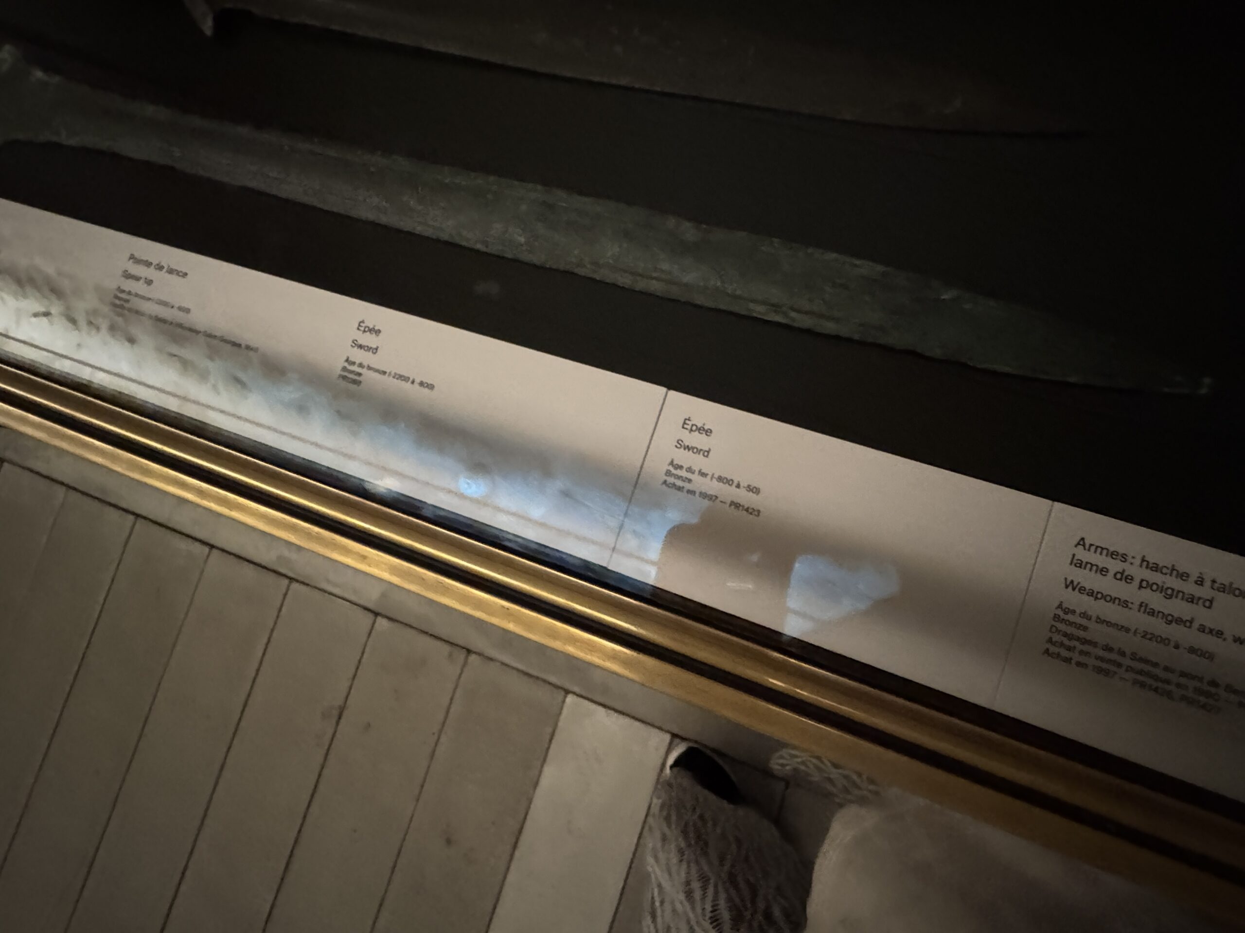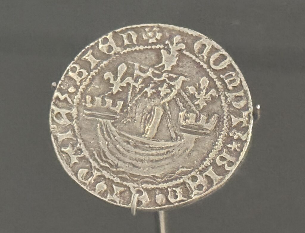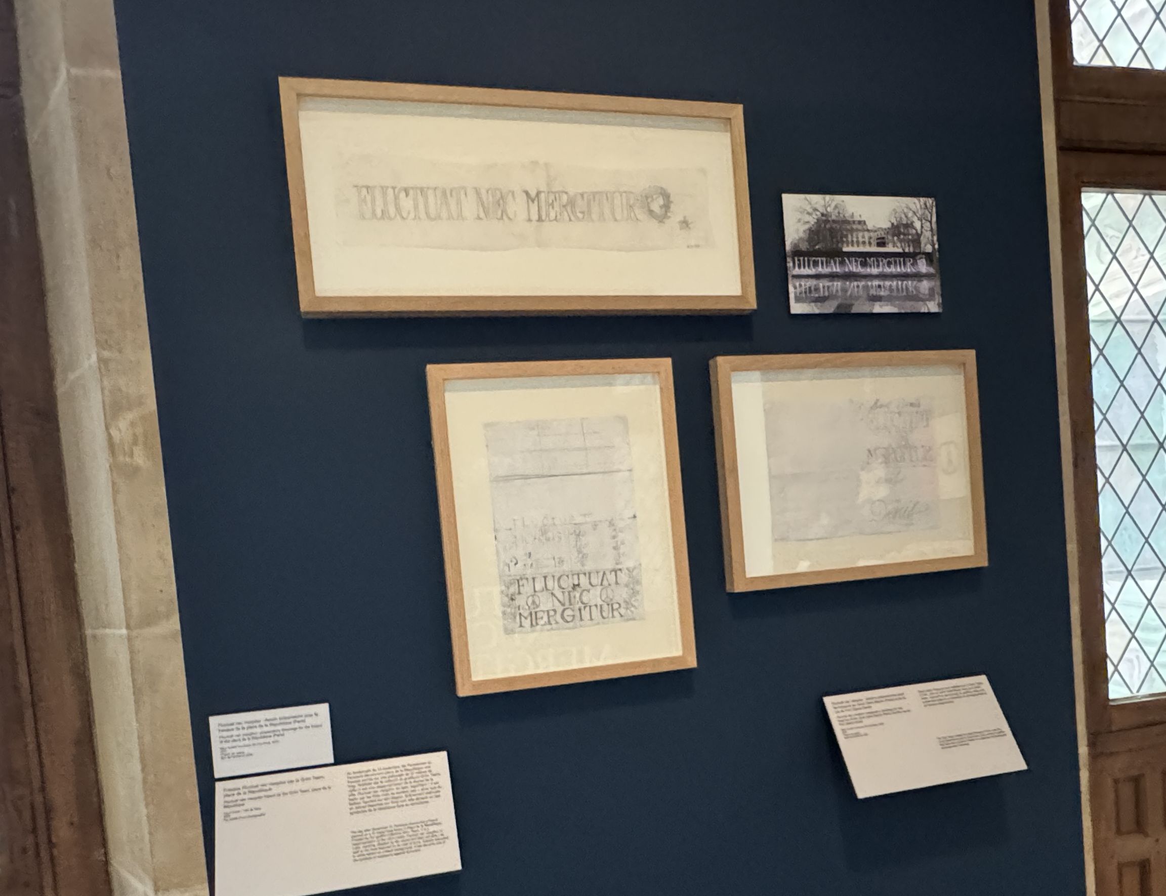 На табличке написано, что в витрине есть муниципальные разменные монеты 16  века и Печать королевских арбалетчиков и города Парижа (репродукции из бронзы и серебра).