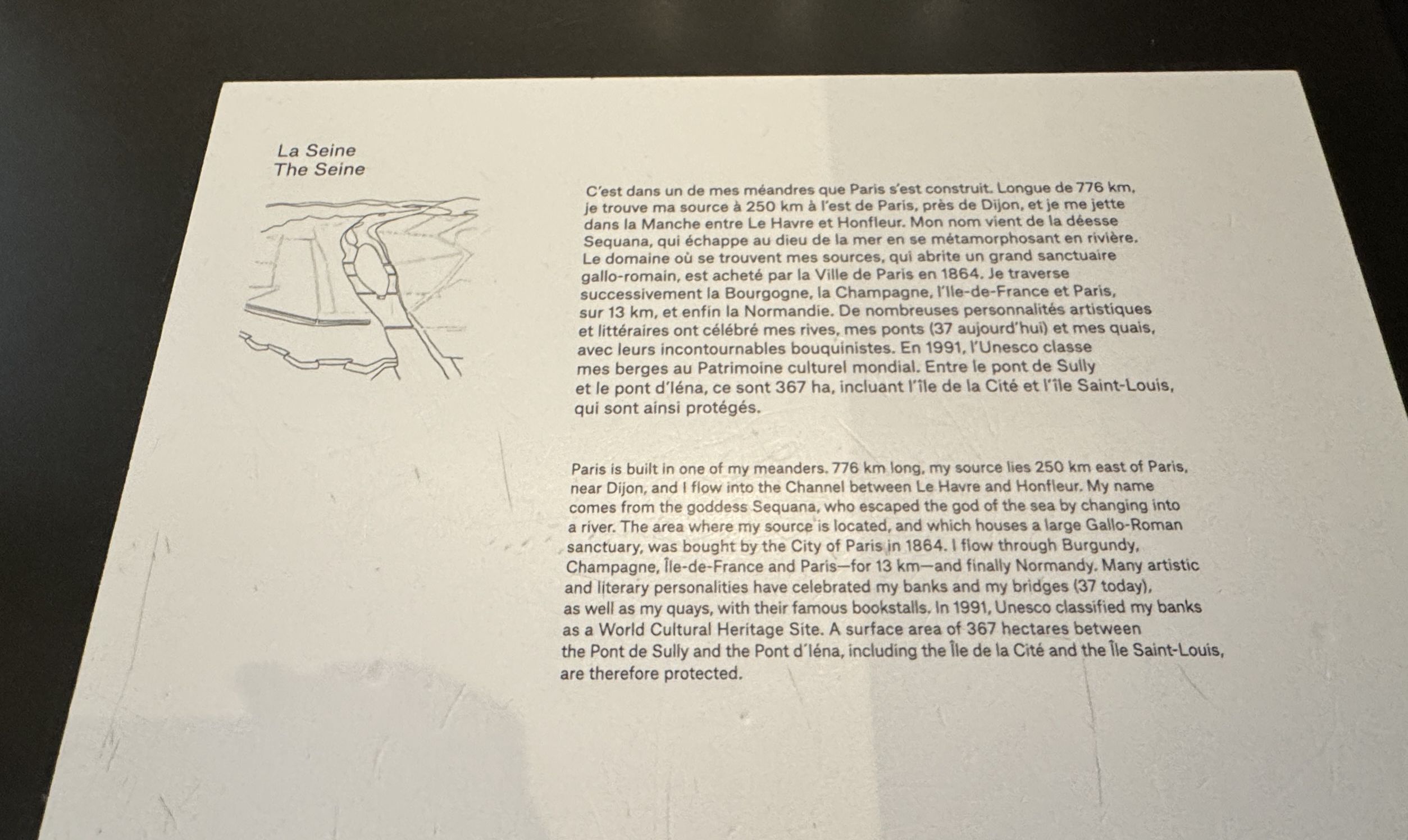 Сена. Париж построен на одном из моих изгибов. Длина реки 776 км, мой исток находится в 250 км к востоку от Парижа, недалеко от Дижона, и я впадаю в Ла-Манш между Гавром и Онфлёром. Моё имя происходит от богини Секуаны, которая спаслась от бога моря, превратившись в реку. Территория, где находится мой исток, и где находится большое галло-римское святилище, была куплена городом Парижем в 1864 году. Я протекаю через Бургундию, Шампань, Иль-де-Франс и Париж — на протяжении 13 км — и, наконец, Нормандию. Многие деятели искусства и литературы прославляли мои берега и мои мосты (сегодня их 37), а также мои набережные с их знаменитыми книжными киосками. В 1991 году ЮНЕСКО включило мои берега в список объектов Всемирного культурного наследия. Таким образом, под охрану попадает территория площадью 367 гектаров между мостами Пон-де-Сюлли и Пон-д’Лена, включая острова Сите и Сен-Луи.