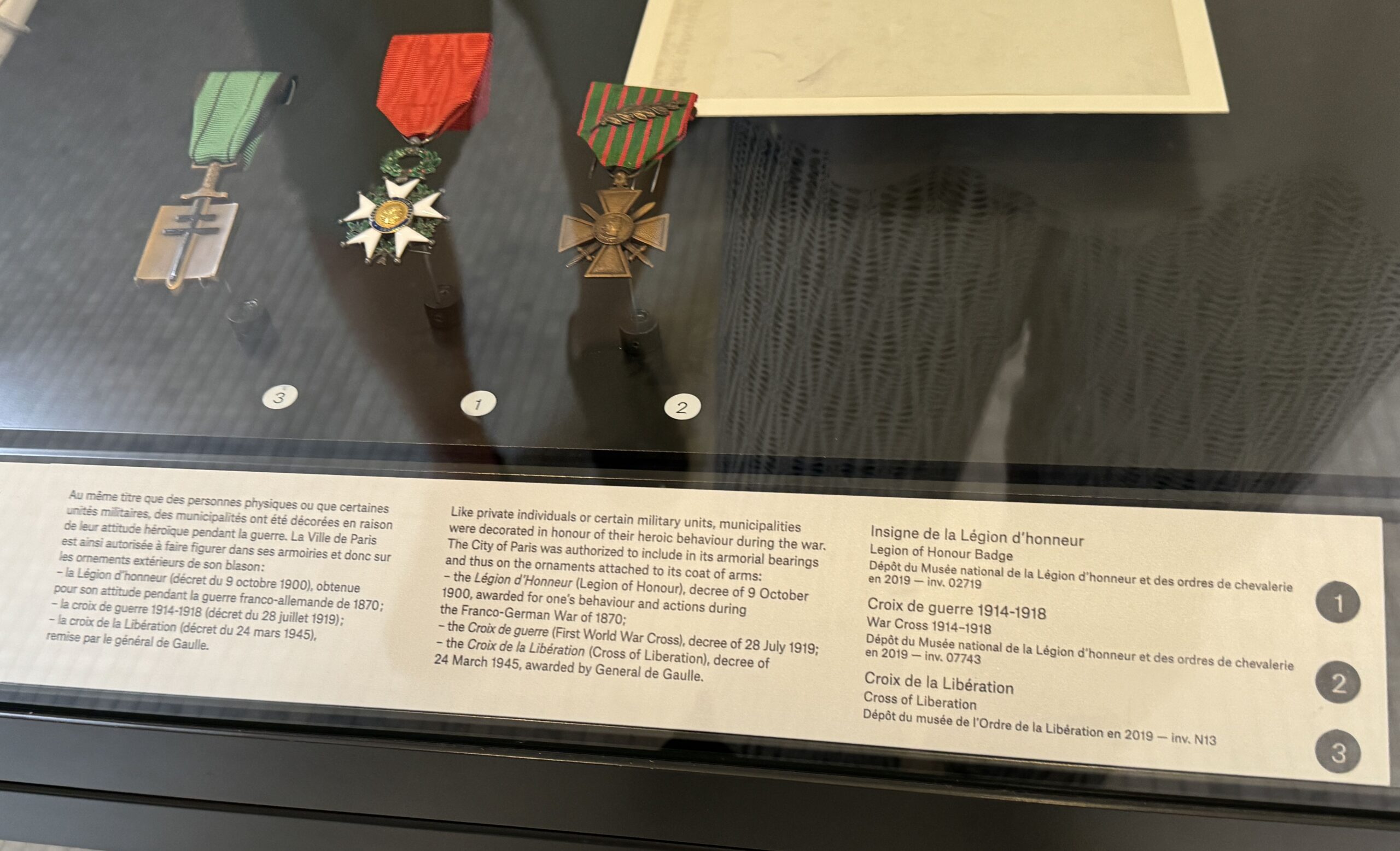 Как и частные лица, так и некоторые воинские части и муниципалитеты были награждены в честь их героического поведения во время войны. Город Париж получил право включить в свой герб и, следовательно, в украшения, прикрепляемые к его гербу: (1 на фото) орден Почетного легиона (Légion d’Honneur), указ от 9 октября 1900 года, присуждаемый за поведение и действия во время франко-германской войны 1870 года; (2 на фото) Военный крест Первой мировой войны (Croix de guerre), указ от 28 июля 1919 года; (3 на фото) Croix de la Libération (Крест освобождения), указ генерала де Голля от 24 марта 1945 года.