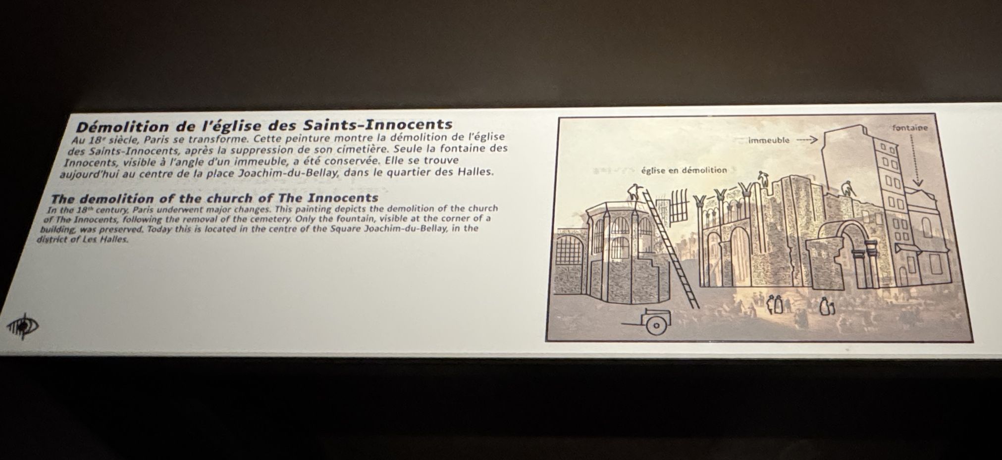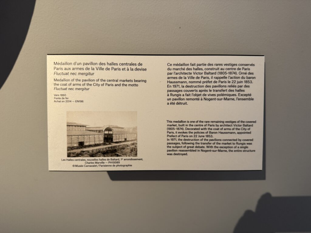 Этот медальон – один из редких сохранившихся фрагментов крытого рынка, построенного в центре Парижа архитектором Виктором Бальтаром (1805–1874). Украшенный гербом города Парижа, он напоминает о политике барона Османа, назначенного префектом Парижа 22 июня 1853 года. В 1971 году снос павильонов, соединённых крытыми переходами, после переноса рынка в Рёнжис стал предметом бурных дискуссий. За исключением одного павильона, восстановленного в Ножан-сюр-Марн, всё сооружение было разрушено.