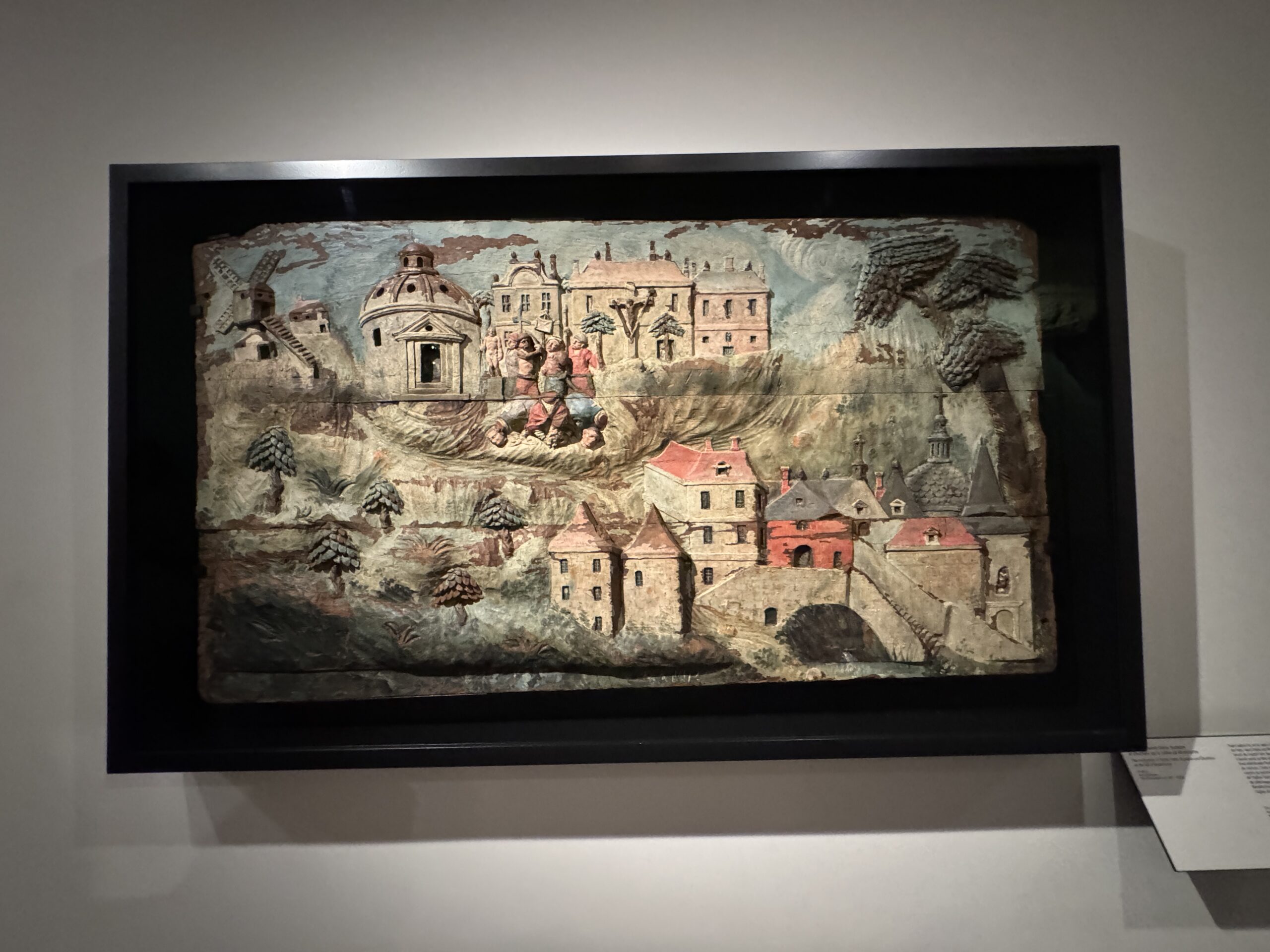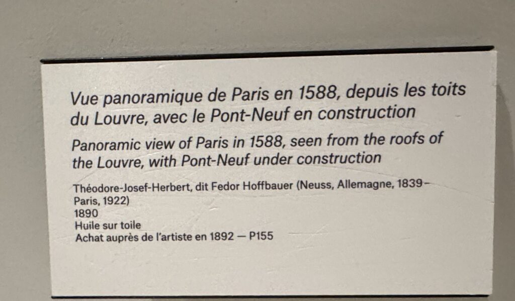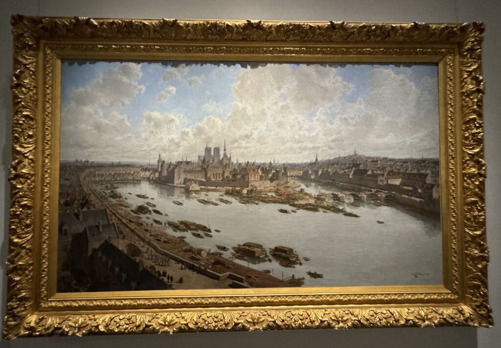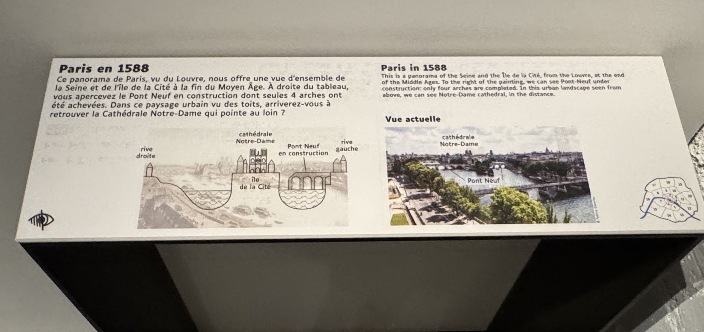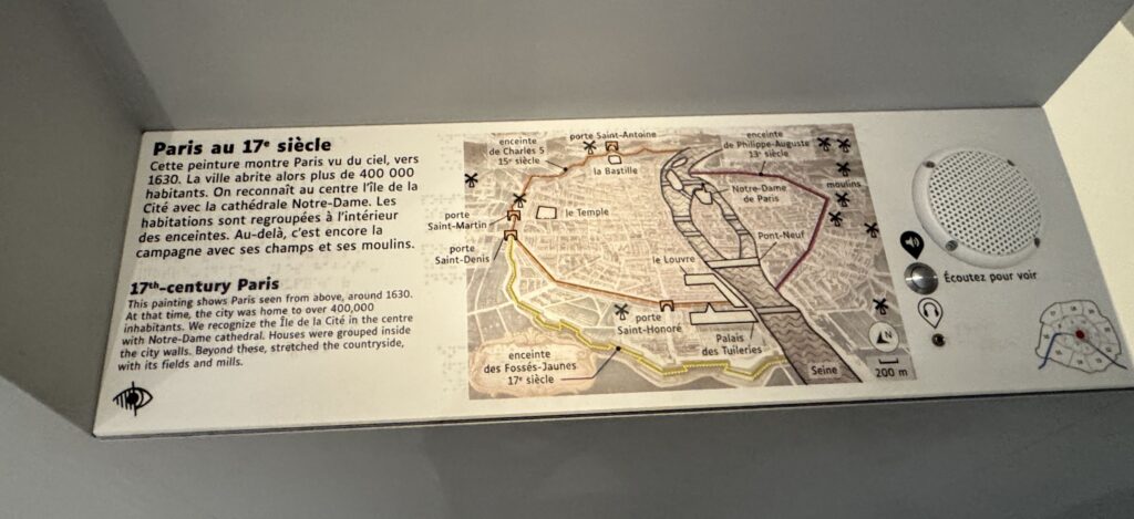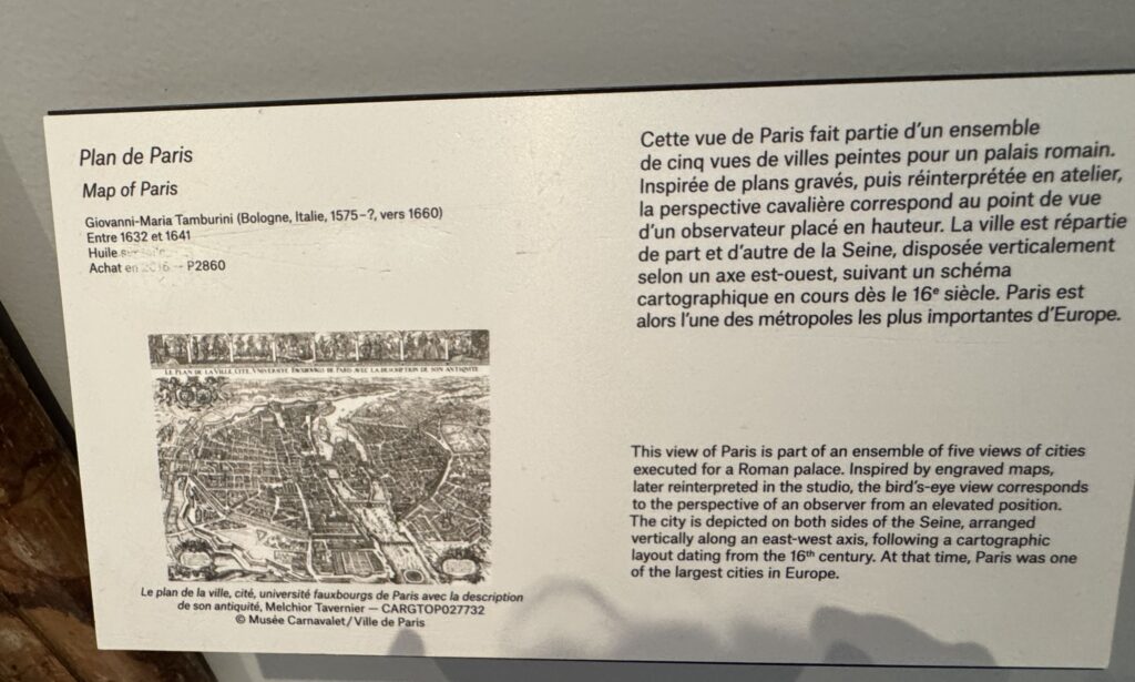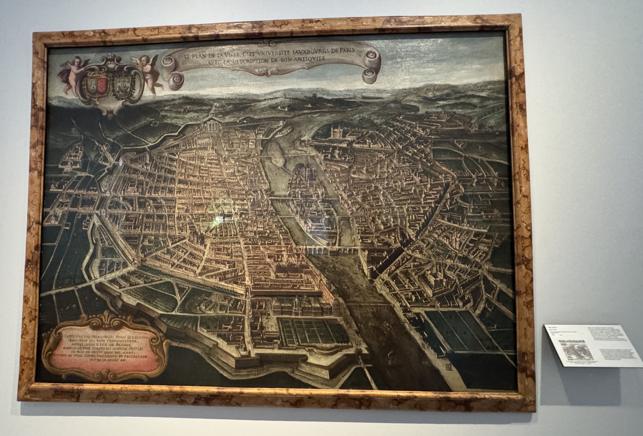 На этой карте вид Парижа сверху, примерно 1630 год. В то время в городе проживало более 400 000 человек. В центре картины виден остров Сите с собором Парижской Богоматери. Дома располагались внутри городских стен. За ними простиралась сельская местность с полями и мельницами.