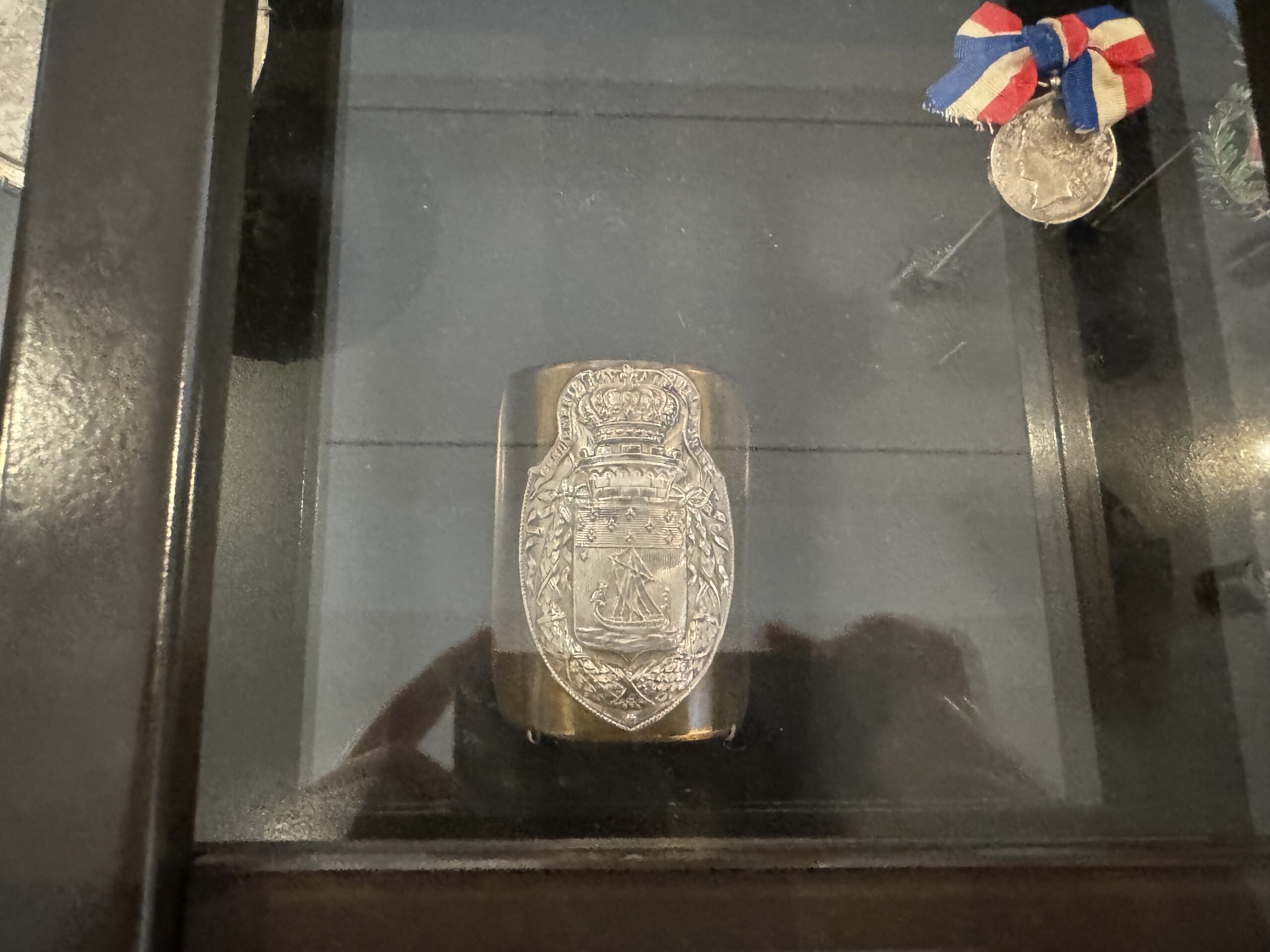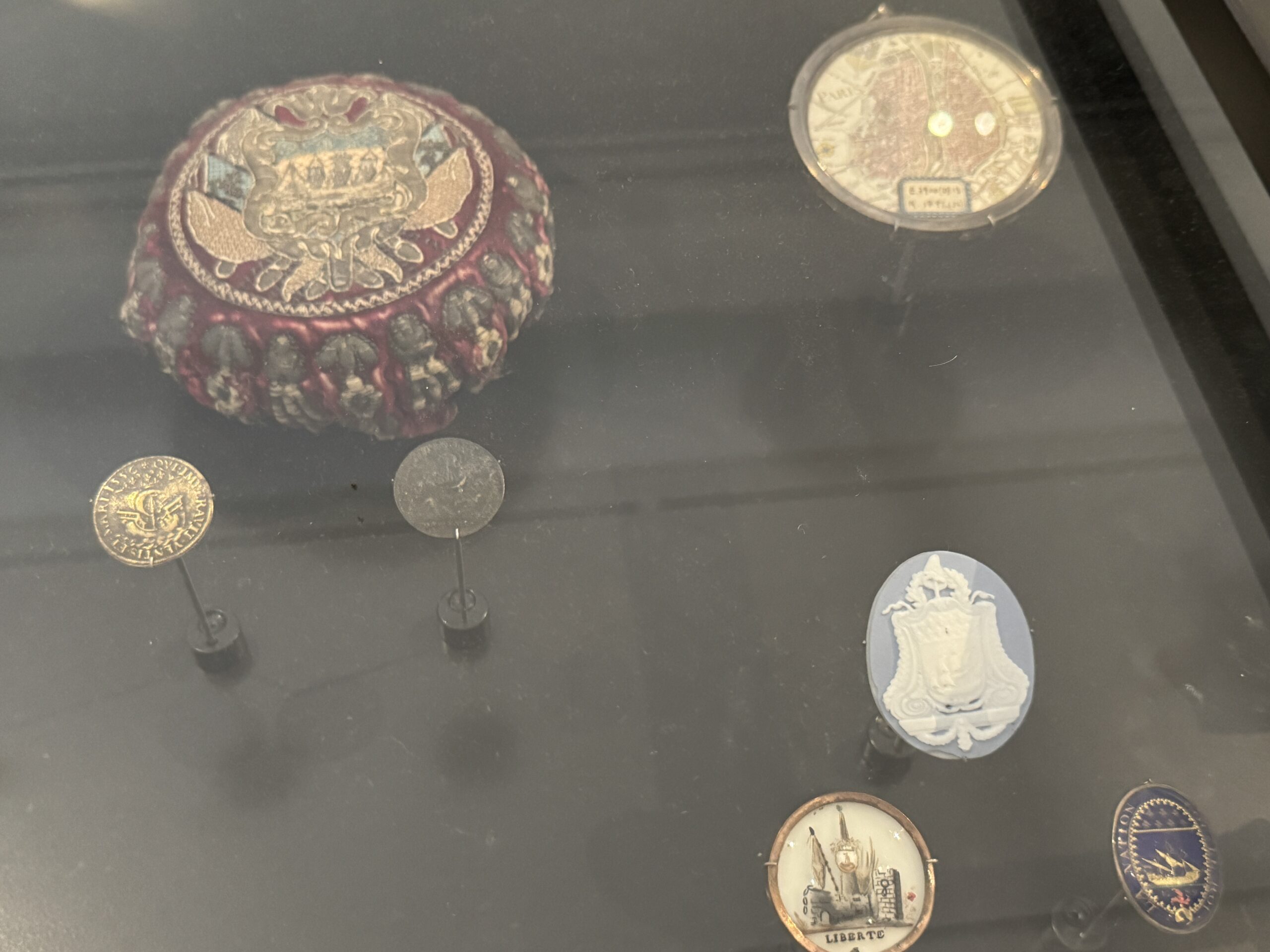 Внизу слева: 1) герб города Парижа 2) Пуговица с гербом города Парижа (Щит города Парижа изображен висящим на мачте над руинами Бастилии, слово Свобода). 3) Возможно, знак жандармов с надписью Нация. А возможно он на фото ниже. Ничего не понятно:)