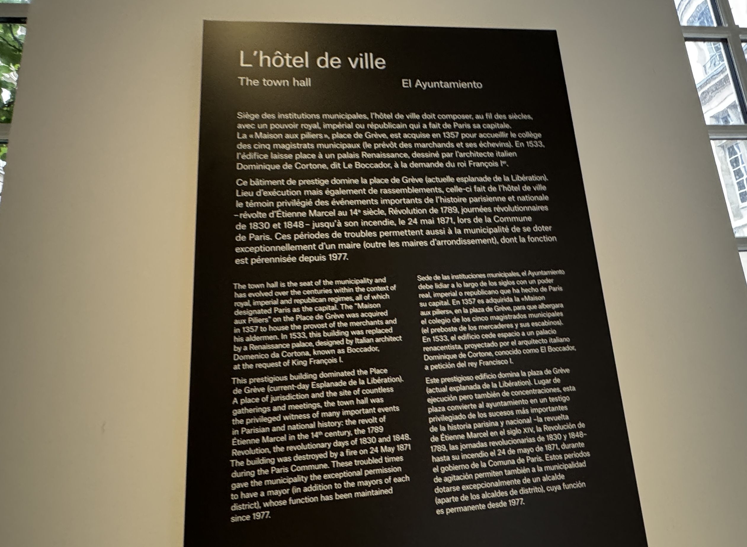 Это престижное здание возвышается над Гревской площадью (ныне Эспланадой Освобождения). Эта площадь, место казней и митингов, делает ратушу привилегированным свидетелем важнейших событий парижской и национальной истории: восстания Этьена Марселя в XIV веке, Революции 1789 года, революционных дней 1830 и 1848 годов, вплоть до её пожара 24 мая 1871 года во время Парижской Коммуны. Эти периоды волнений также позволили муниципалитету в порядке исключения назначить мэра (в дополнение к мэрам районов), должность которого является постоянной с 1977 года.