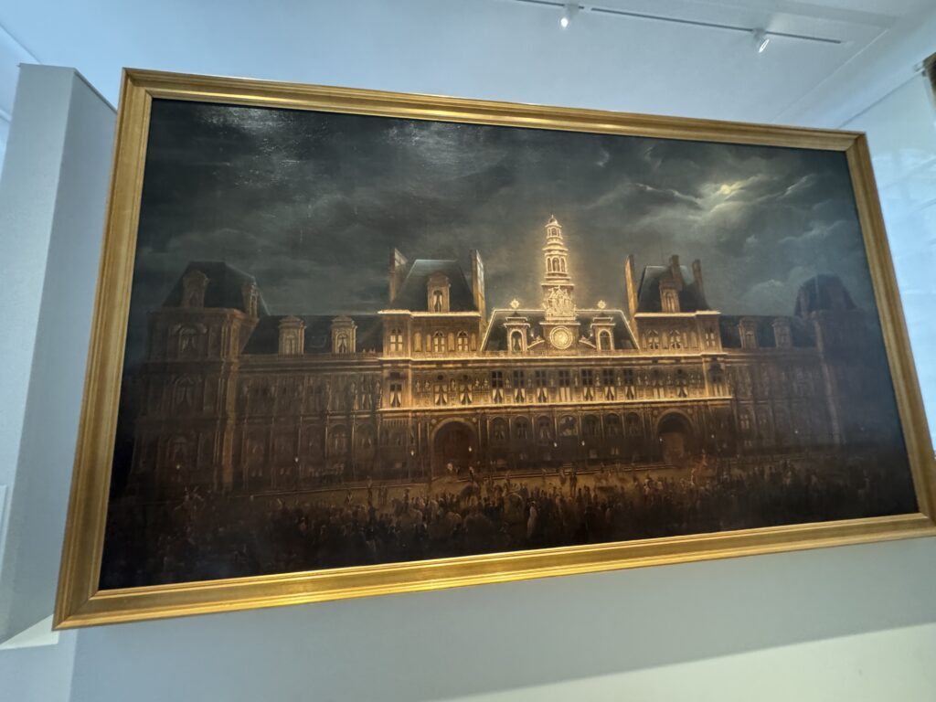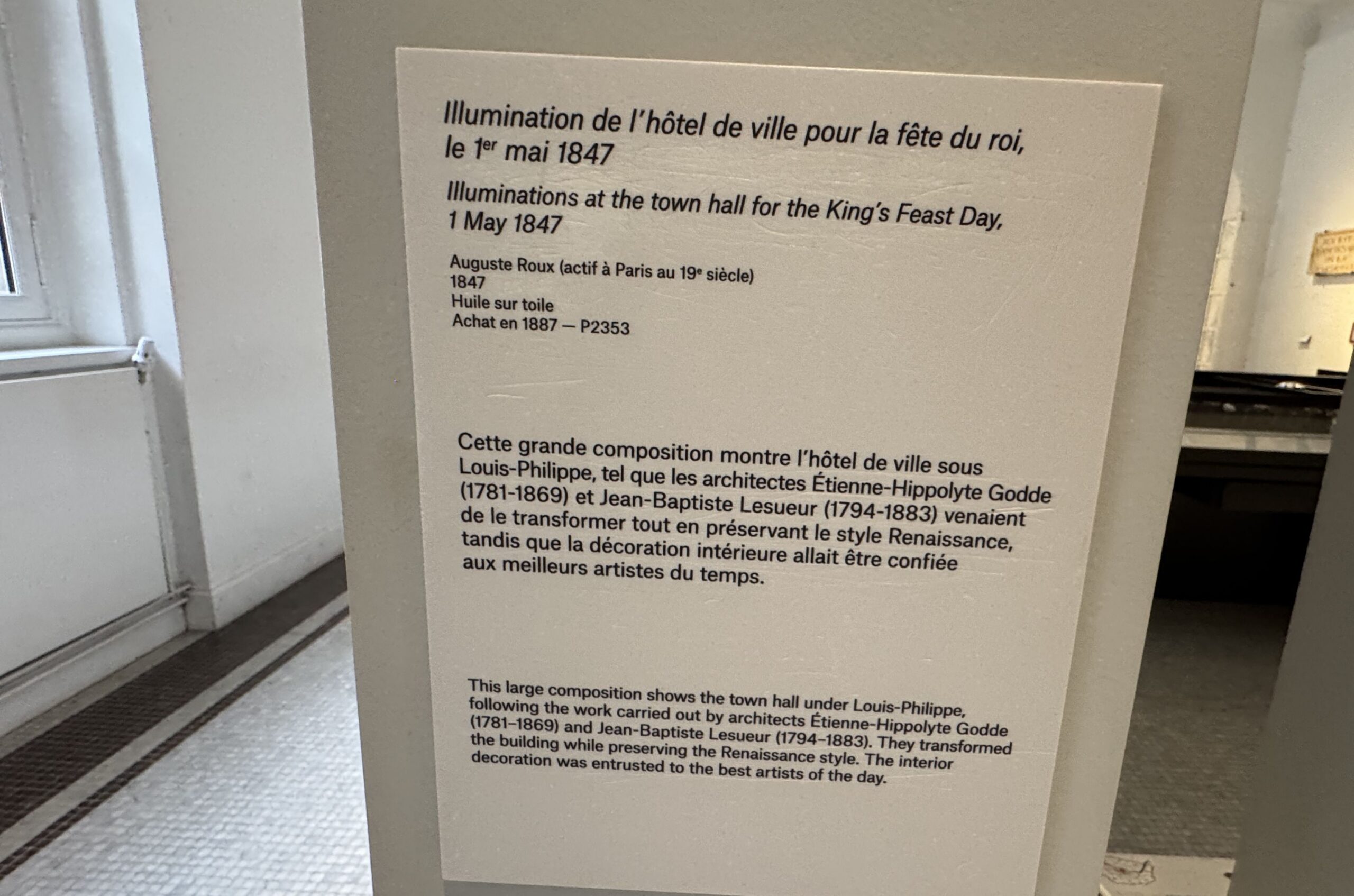 Эта большая композиция изображает ратушу времен Луи-Филиппа, построенную по проекту архитекторов Этьена-Ипполита Годда (1781–1869) и Жана-Батиста Лесюэра (1794–1883). Они преобразили здание, сохранив при этом стиль эпохи Возрождения. Внутренняя отделка была поручена лучшим художникам того времени.