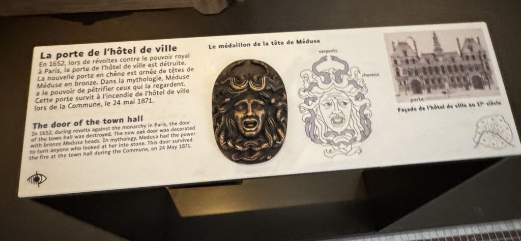 Дверь ратуши. В 1652 году, во время восстания против монархии в Париже, дверь ратуши была разрушена. Новая дубовая дверь была украшена бронзовыми головами Медузы. Согласно мифологии, Медуза обладала способностью превращать в камень любого, кто взглянет на неё. Эта дверь пережила пожар в ратуше во время Коммуны 24 мая 1871 года.