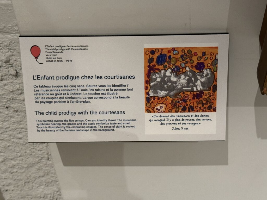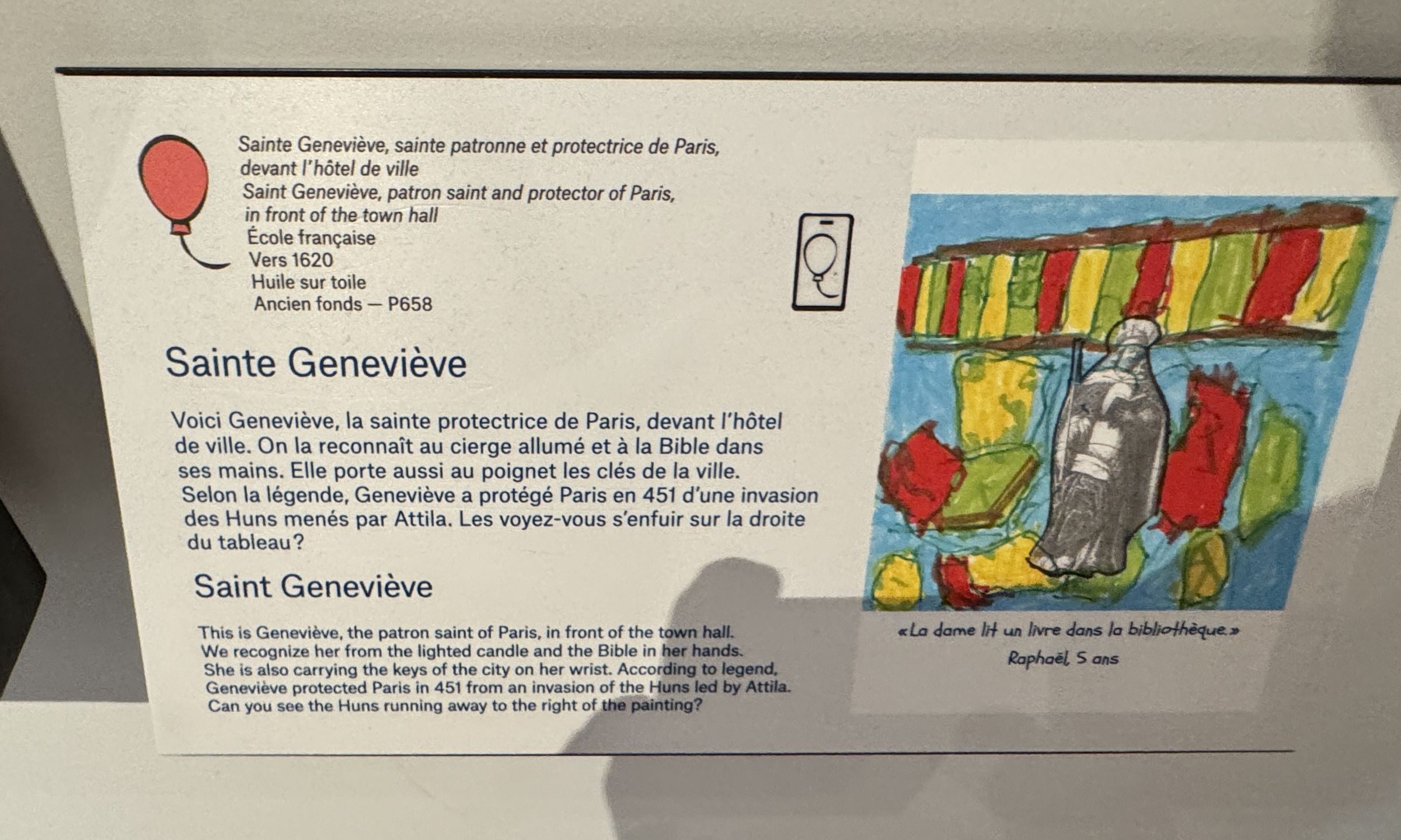 «Святая Женевьева. Вот Женевьева, святая покровительница Парижа, стоит перед ратушей. Её можно узнать по горящей свече и Библии в руках. На запястье у неё также ключи от города. Согласно легенде, Женевьева защитила Париж в 451 году от вторжения гуннов под предводительством Аттилы. Видите ли вы их бегство в правой части картины? Рафаэль, 5 лет»