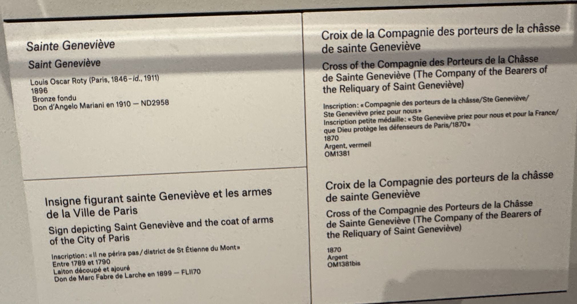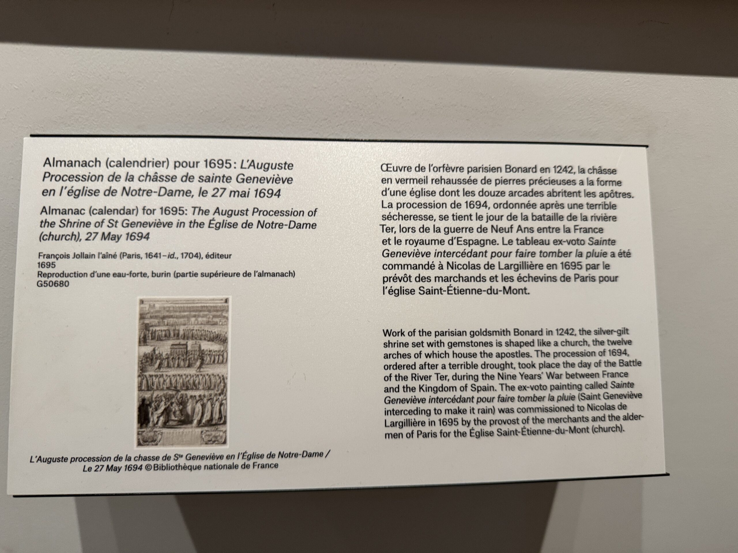 Серебряный реликварий, созданный парижским ювелиром Бонаром в 1242 году, украшен драгоценными камнями и выполнен в форме церкви, двенадцать аркад которой служат убежищем для апостолов. Процессия 1694 года, заказанная после страшной засухи, состоялась в день битвы на реке Тер во время Девятилетней войны между Францией и Королевством Испания. Картина, написанная по обету, «Святая Женевьева, молящая о дожде», была заказана Николя де Ларжильеру в 1695 году прево купцов и олдерменов Парижа для церкви Сент-Этьен-дю-Мон.