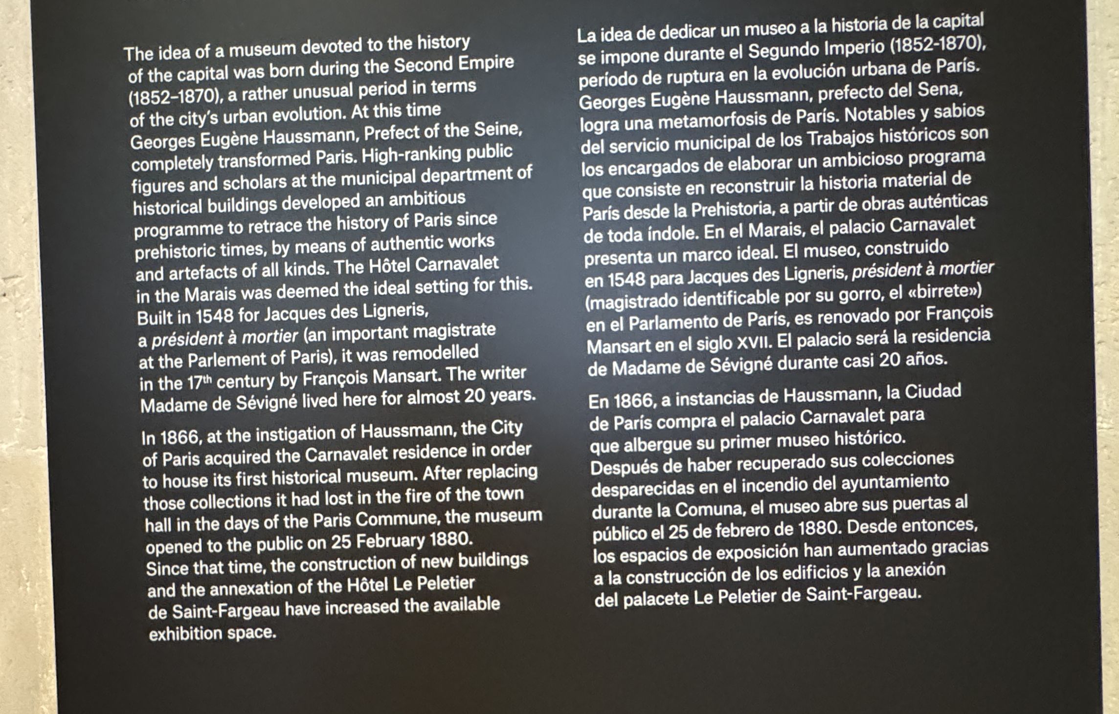 Идея создания музея, посвящённого истории столицы, возникла во времена Второй империи (1852–1870), в период перелома в городском развитии Парижа. Жорж Эжен Осман, префект Сены, преобразил Париж. Знатным людям и учёным из муниципальной службы исторических работ было поручено разработать амбициозную программу по реконструкции материальной истории Парижа с доисторических времён на основе подлинных произведений всех видов. Дворец Карнавале в квартале Марэ служит идеальным местом для этого. Музей, построенный в 1548 году для Жака де Линьери, судьи, узнаваемого по его шапке, «мортье» (mortier) в Парижском парламенте, был отреставрирован Франсуа Мансаром в XVII веке. Дворец стал резиденцией мадам де Севинье почти на 20 лет. В 1866 году, по настоянию Османа, город Париж приобрел дворец Карнавале для размещения своего первого исторического музея. После восстановления коллекций, утраченных при пожаре ратуши во времена Коммуны, музей открыл свои двери для публики 25 февраля 1880 года. С тех пор выставочная площадь значительно расширилась благодаря строительству новых зданий и присоединению особняка Ле Пелетье де Сен-Фаржо