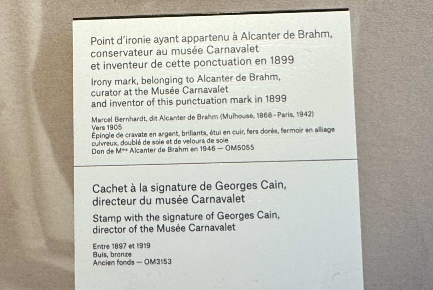 Булавка с point d’ironie — зеркально отраженный вопросительный знак, который поэт Алькантер де Брам, куратору Музея Карнавале, предложил в 1899 году. Знак не прижился. Около 1905 г была сделана серебряная с бриллиантами булавка для галстука. К ней прилагались: кожаный футляр, позолоченные застёжки, застёжка из медного сплава, подкладка из шёлка и шёлкового бархата. В 1946 году г-жа Алькантер де Брам передала булавку в музей.