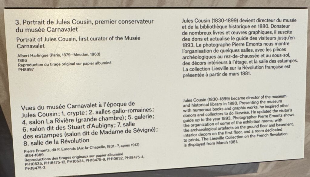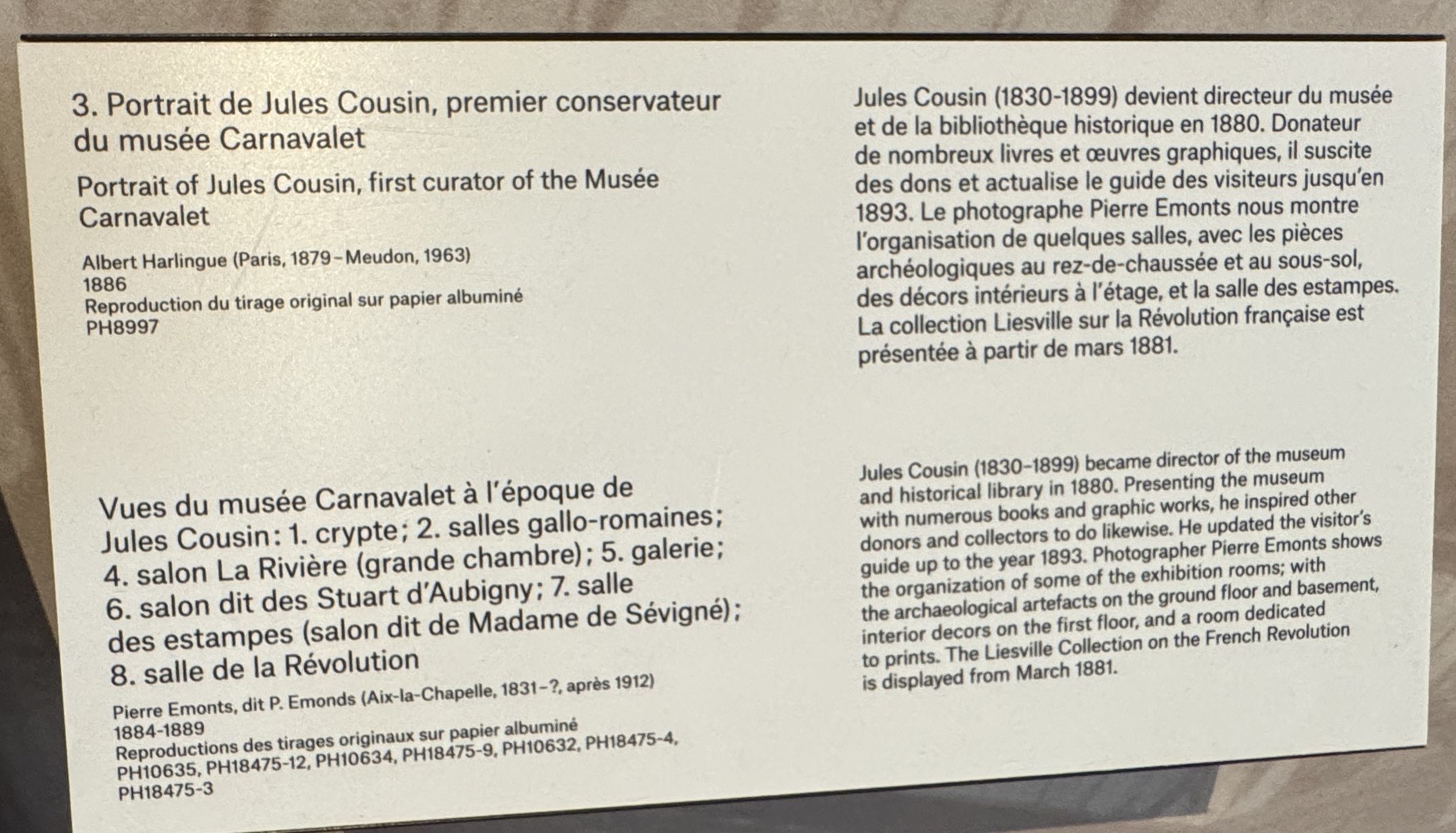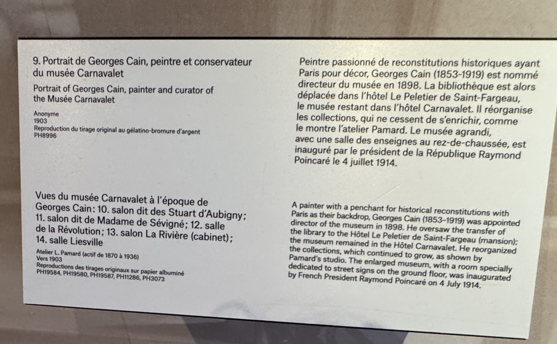 Портрет Жоржа Каэна, художника и куратора Музея Карнавале. Аноним 1903 г. Репродукция с оригинального желатино-серебряного отпечатка. Виды Музея Карнавале во времена Жоржа Кэна: 10. Салон, известный как Стюарт д’Обиньи; 11. Салон, известный как Мадам де Севинье; 12. Зал Революции; 13. Зал Ла-Ривьер (кабинет); 14. Зал Лисвилля. Мастерская Л. Памара (работала с 1870 по 1936 год) Около 1903 года. Репродукции оригинальных альбуминовых отпечатков.
