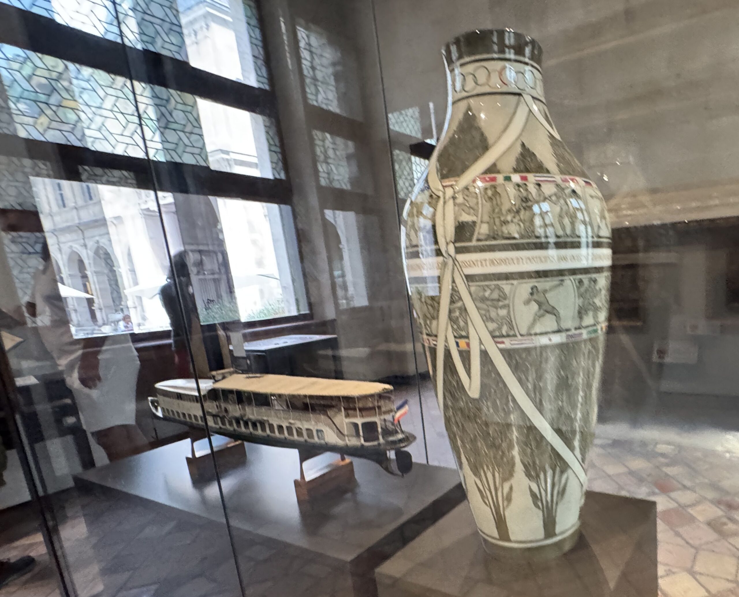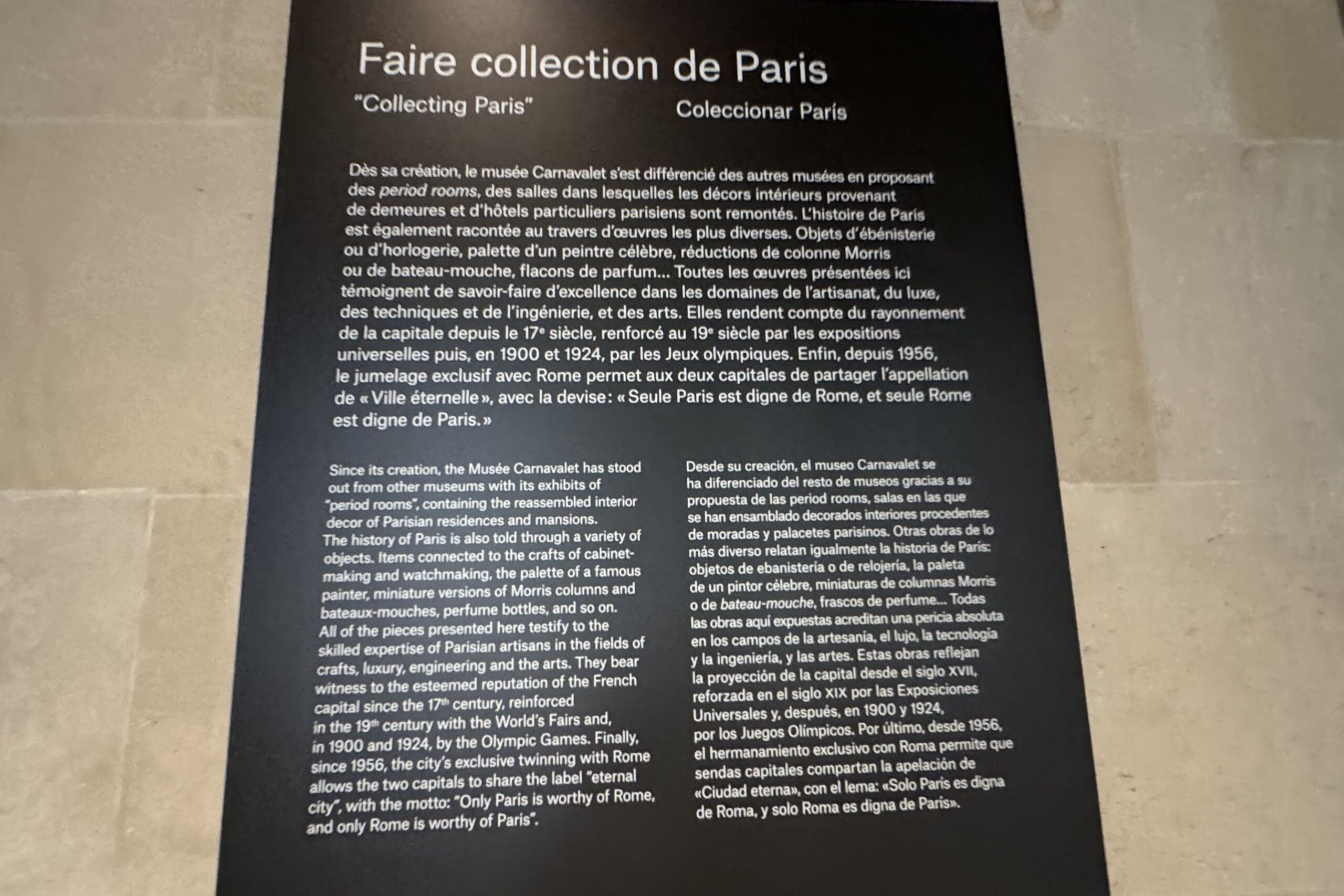 «Собирая Париж». С момента своего основания Музей Карнавале выделялся среди других музеев своими экспозициями «старинных комнат», в которых воссозданы интерьеры парижских резиденций и особняков. История Парижа также раскрывается через разнообразные экспонаты. Среди них – предметы, связанные с ремеслами краснодеревщика и часовщика, палитра известного художника, миниатюрные копии колонн Морриса и лодок-лодок, флаконы для духов и многое другое. Все представленные здесь экспонаты свидетельствуют о высоком мастерстве парижских мастеров в области ремесел, предметов роскоши, инженерного дела и искусства. Они свидетельствуют о высокой репутации французской столицы с XVII века, укреплённой в XIX веке Всемирными выставками и Олимпийскими играми 1900 и 1924 годов. Наконец, с 1956 года эксклюзивные побратимские связи города с Римом позволяют двум столицам делить звание «вечного города» под девизом: «Только Париж достоин Рима, и только Рим достоин Парижа».