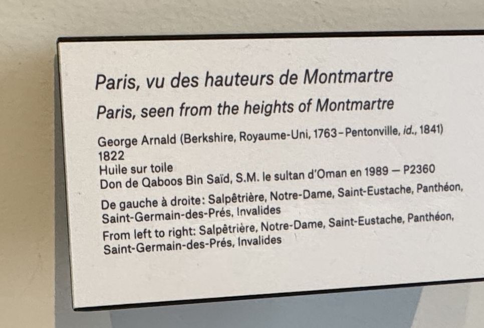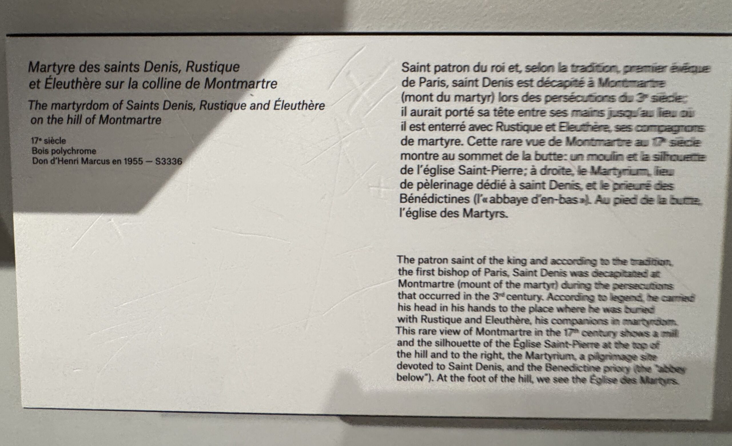 Святой покровитель короля и, согласно традиции, первый епископ Парижа, Сен-Дени был обезглавлен на Монмартре (горе Мучеников) во время гонений в III веке. Согласно легенде, он нёс свою голову в руках к месту погребения вместе с Рустиком и Елевферием, своими соратниками по мученичеству. На этом редком изображении Монмартра XVII века изображены мельница и силуэт церкви Сен-Пьер на вершине холма, а справа – Мартириум, место паломничества, посвящённое Сен-Дени, и бенедиктинский монастырь («нижнее аббатство»). У подножия холма находится церковь Мучеников.