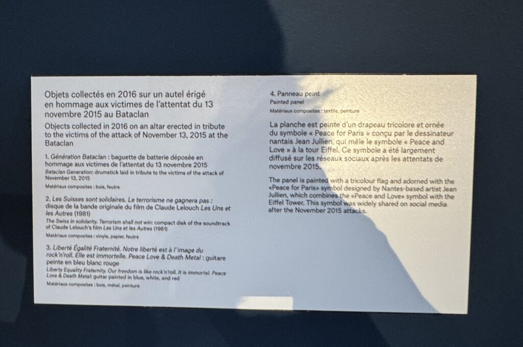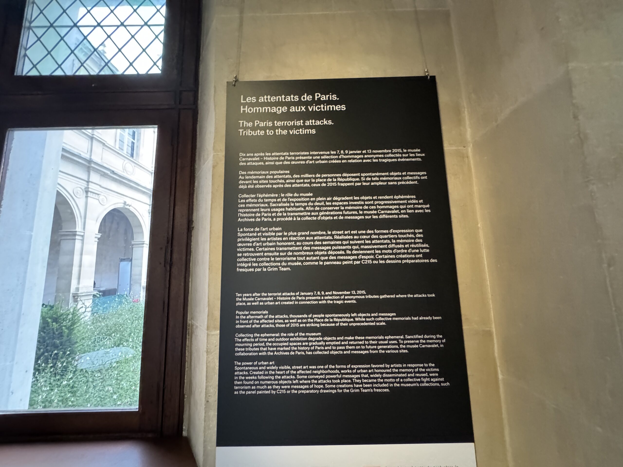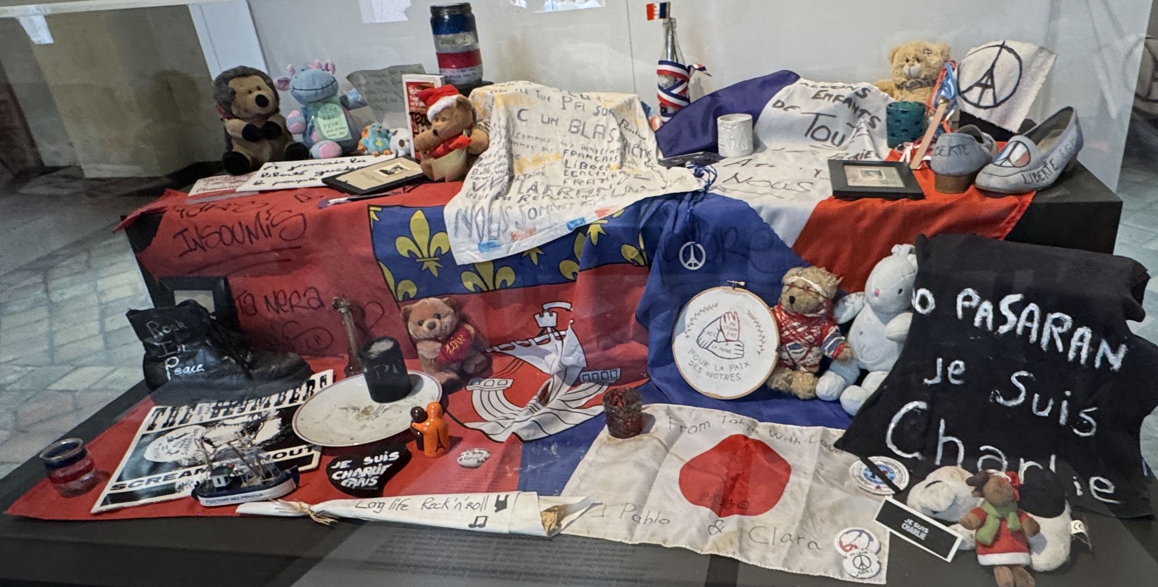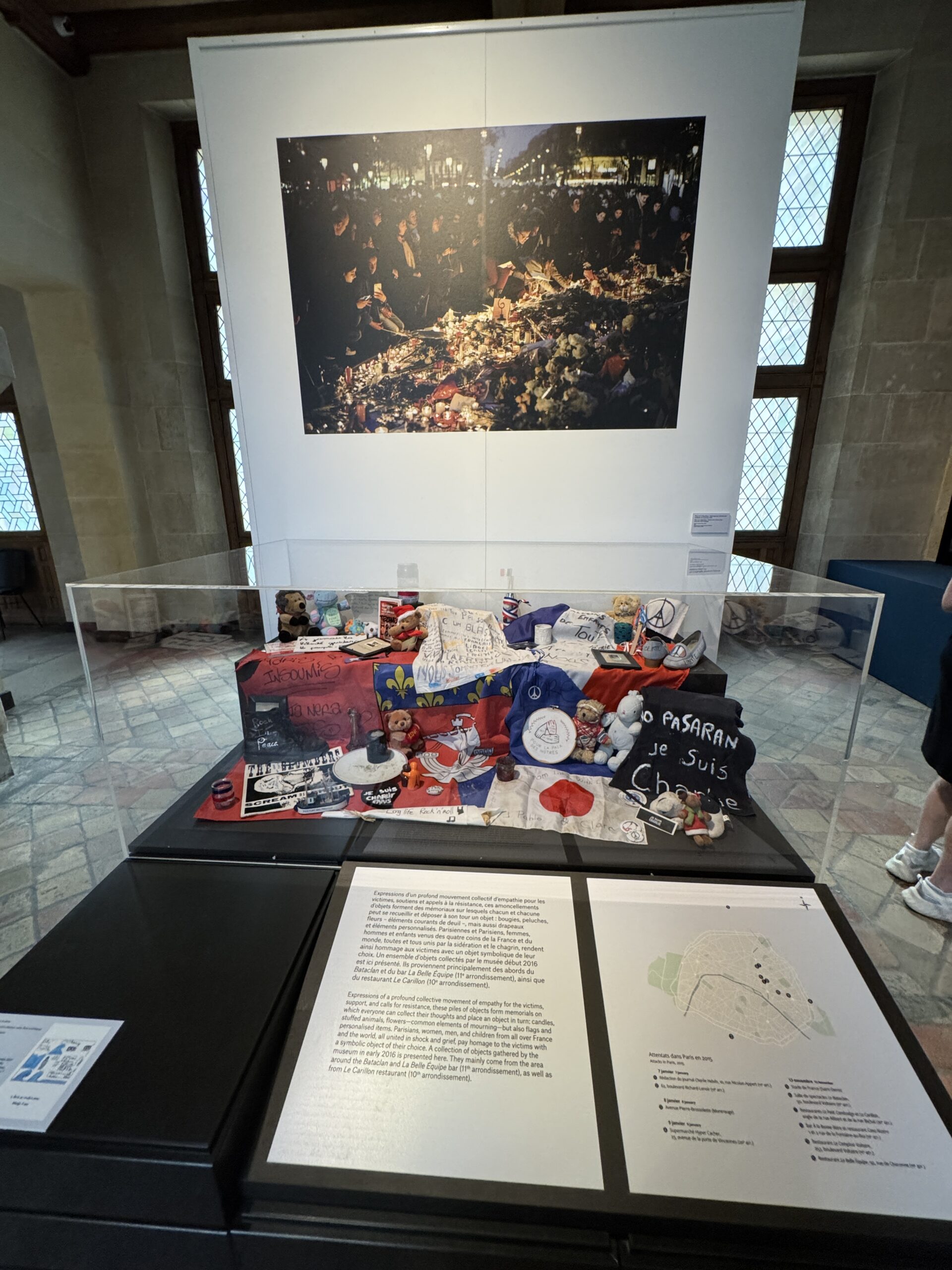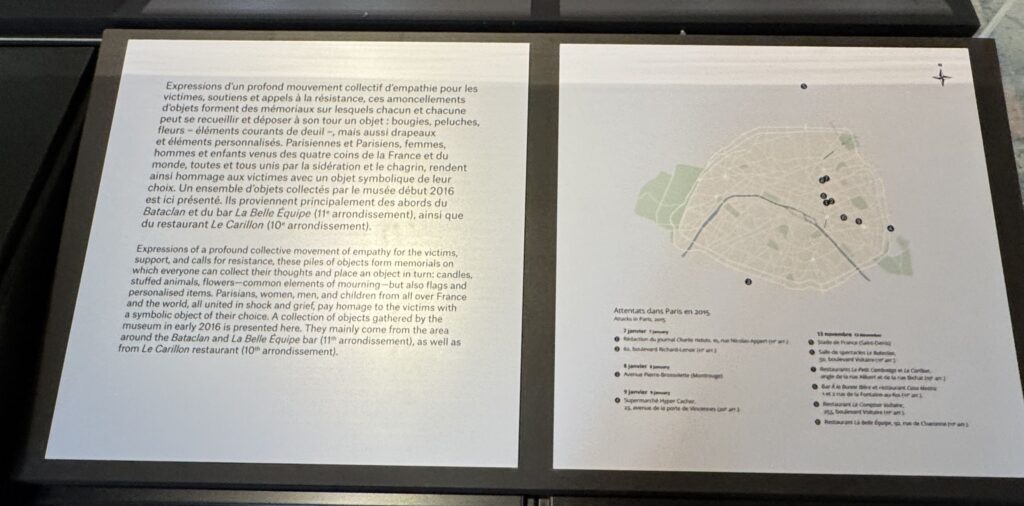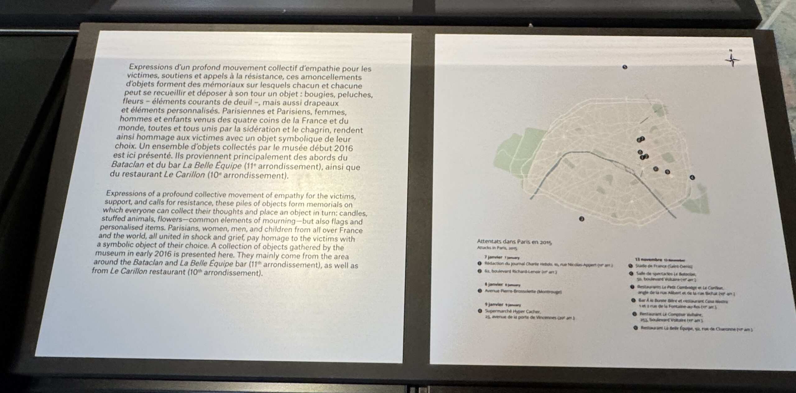 Выражая глубокое коллективное движение сочувствия жертвам, поддержки и призывов к сопротивлению, эти груды предметов образуют мемориалы, к которым каждый может собраться с мыслями и по очереди положить что-нибудь: свечи, мягкие игрушки, цветы – обычные элементы траура, – а также флаги и личные вещи. Парижане, женщины, мужчины и дети со всей Франции и мира, объединенные потрясением и горем, отдают дань памяти жертвам, выбрав символический предмет. Здесь представлена ​​коллекция предметов, собранных музеем в начале 2016 года. В основном они собраны в районе театра «Батаклан» и бара La Belle Équipe (11-й округ), а также в ресторане Le Carillon (10-й округ). Карта мест террористических атак.