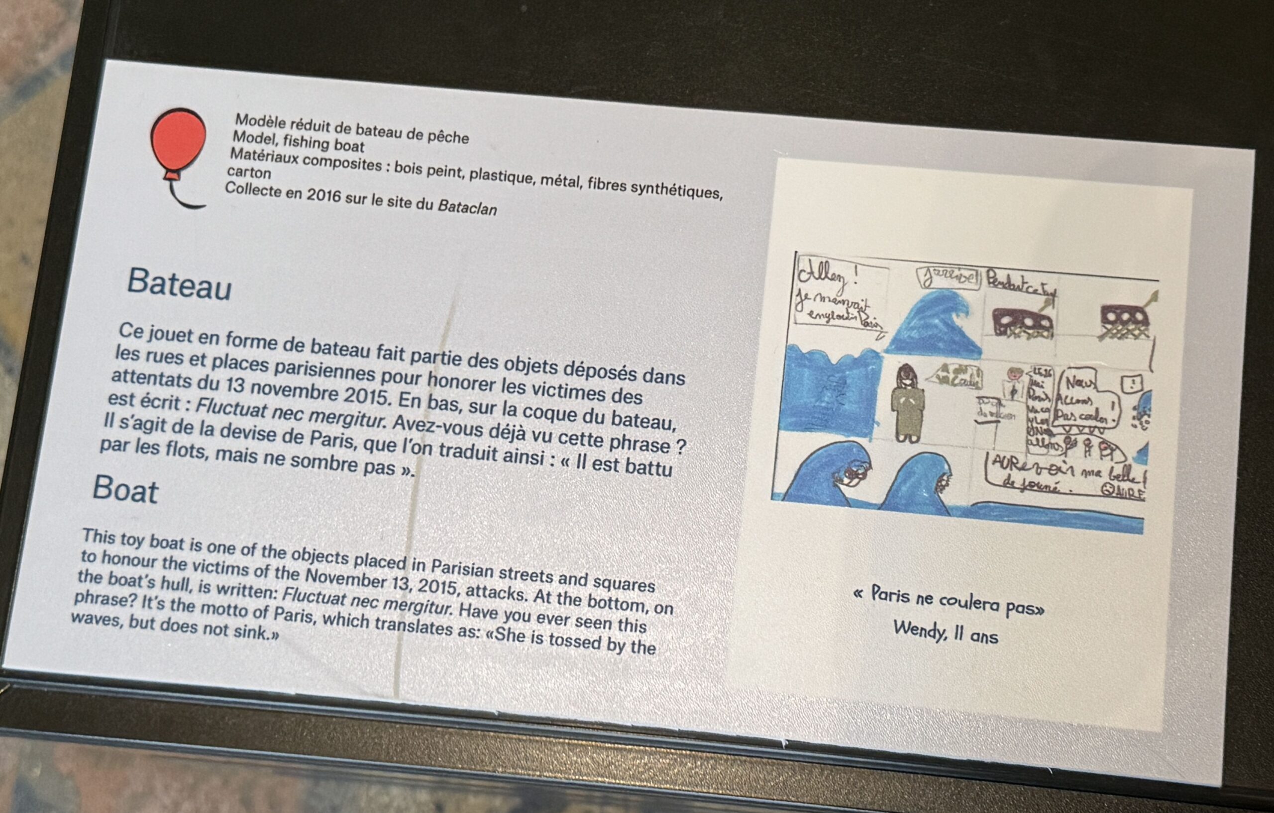 Модель рыбацкой лодки. Окрашенное дерево, пластик, металл, синтетические волокна, картон.  2016 год, около Батаклана. Эта игрушка в форме лодки – один из объектов, установленных на улицах и площадях Парижа в память о жертвах терактов 13 ноября 2015 года. Внизу, на корпусе лодки, написано: Fluctuat nec mergitur. Вы когда-нибудь видели эту фразу? Это девиз Парижа, который переводится как: «Волны бьют его, но он не тонет».