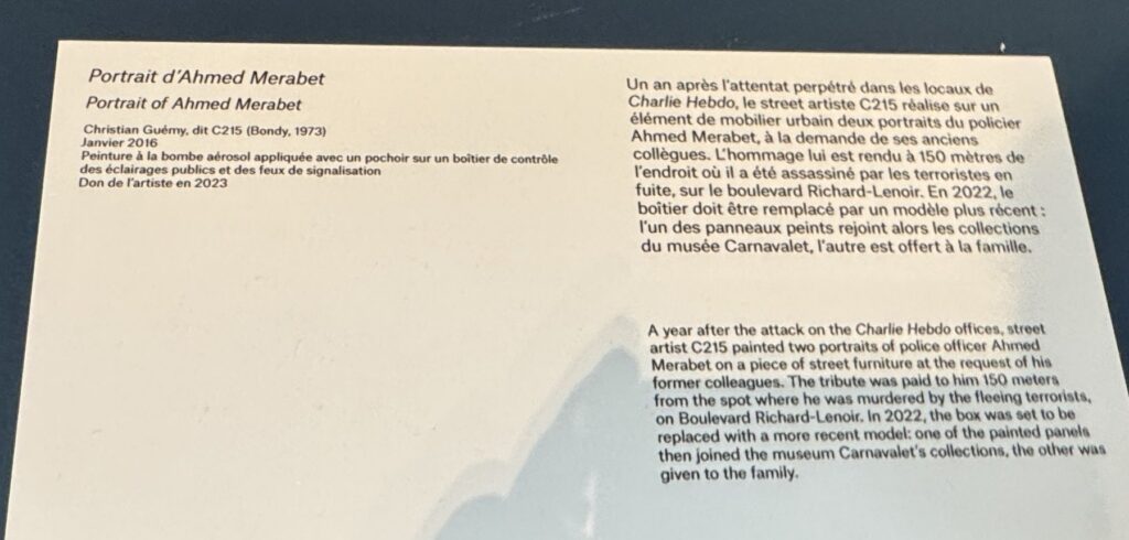 Спустя год после нападения на редакцию Charlie Hebdo уличный художник C215 по просьбе бывших коллег нарисовал два портрета полицейского Ахмеда Мерабета на предмете уличной мебели. Память была отдана в 150 метрах от места его убийства бежавшими террористами, на бульваре Ришар-Ленуар. В 2022 году планировалось заменить ящик более современным: одна из расписных панелей вошла в коллекцию музея Карнавале, другая была передана семье.