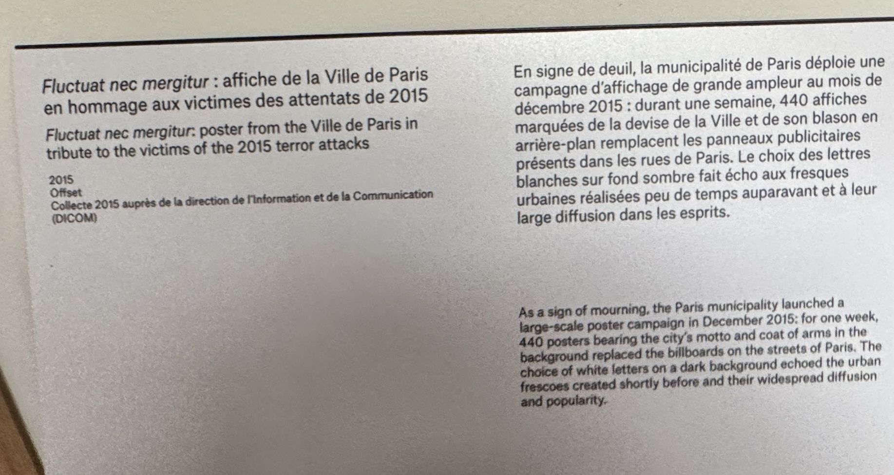 В знак траура в декабре 2015 года муниципалитет Парижа запустил масштабную кампанию по размещению плакатов: в течение недели 440 плакатов с девизом и гербом города заменили рекламные щиты на улицах Парижа. Выбор белых букв на тёмном фоне перекликался с городскими фресками, созданными незадолго до этого, и их широким распространением и популярностью.
