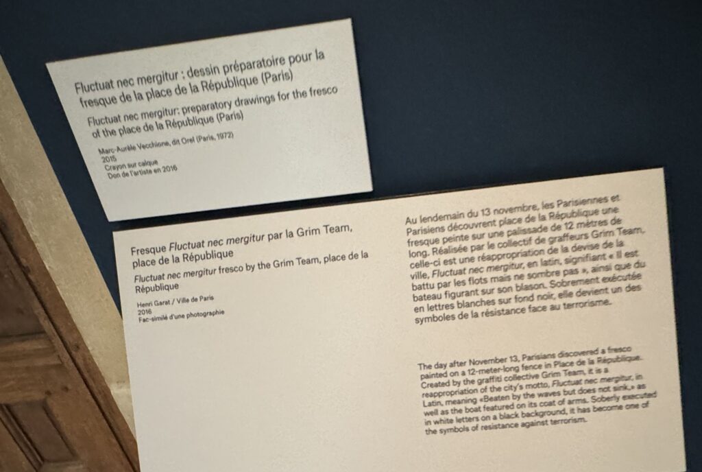 На следующий день после 13 ноября парижане обнаружили фреску, нарисованную на 12-метровом заборе на площади Республики. Созданная граффити-коллективом Grim Team, она представляет собой переосмысление латинского девиза города Fluctuat nec mergitur, что означает «Бьётся волнами, но не тонет», а также изображения лодки на гербе города. Строго выполненная белыми буквами на чёрном фоне, она стала одним из символов сопротивления терроризму.