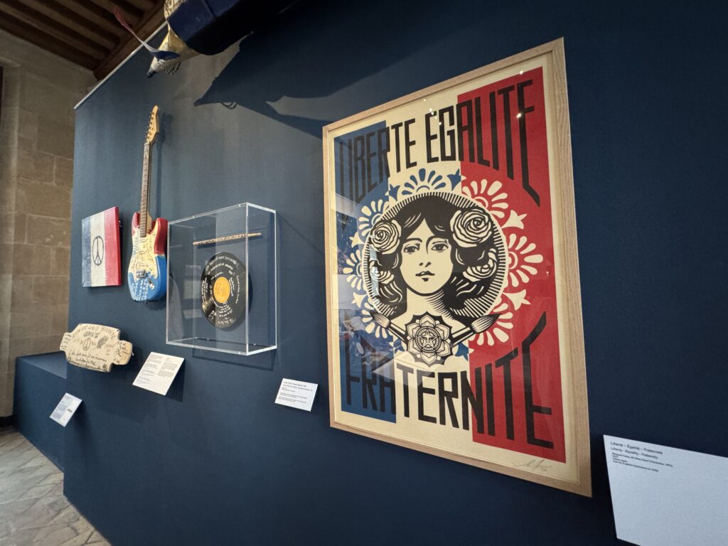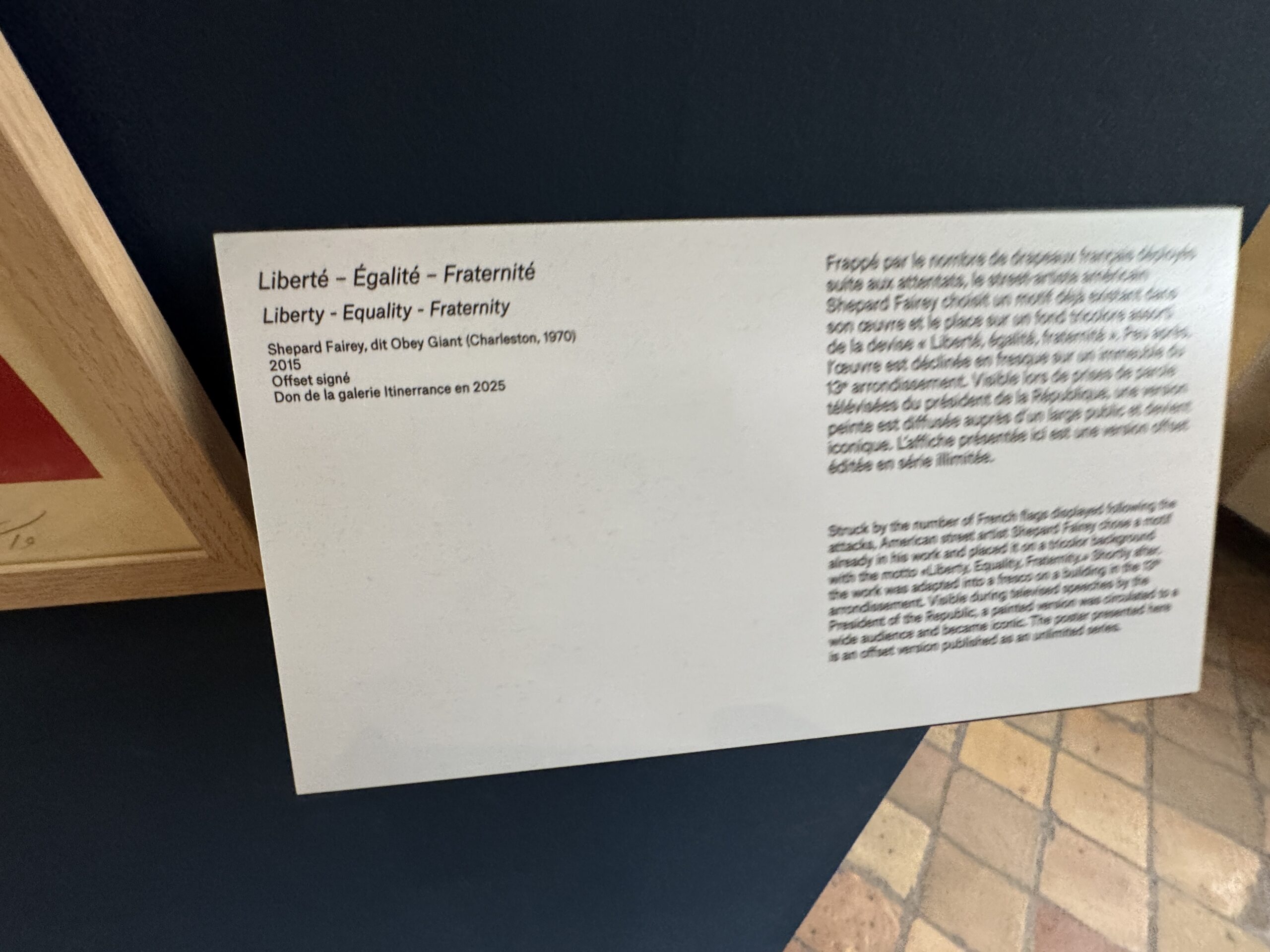 Свобода — Равенство — Братство,Shepard Fairey, dit Obey Giant (Charleston, 1970), 2015. Дар галереи Itinerrance в 2025 году. Поражённый количеством французских флагов, вывешенных после терактов, американский уличный художник Шепард Фейри выбрал мотив, уже встречавшийся в его работах, и поместил его на разноцветный фон с девизом «Свобода, Равенство, Братство». Вскоре после этого работа была адаптирована в виде фрески на здании в Амондиссмане. Её можно было увидеть во время телевизионных речей президента Республики, а её раскрашенная версия была распространена среди широкой аудитории и стала культовой. Представленный здесь плакат – это офсетная версия, изданная неограниченным тиражом.