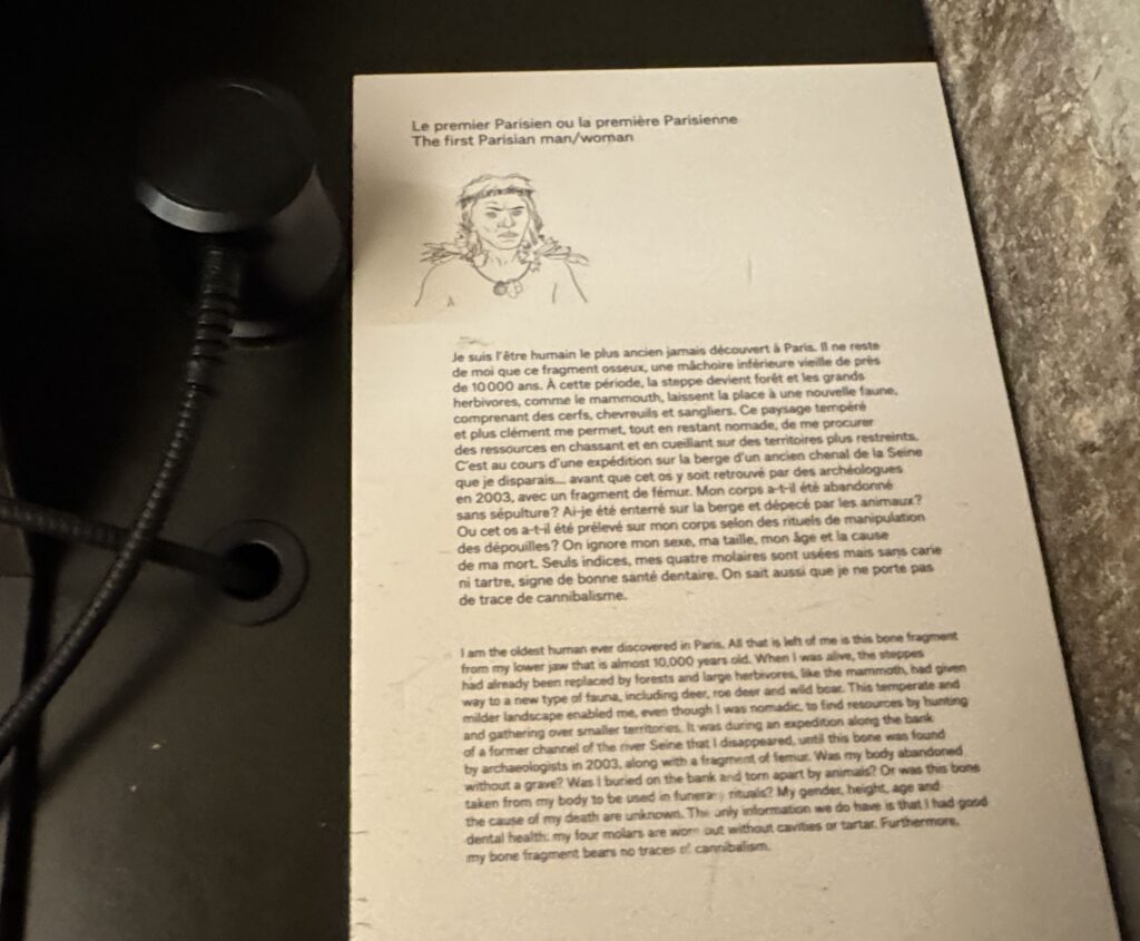 Первый парижский мужчина или женщина. Я – самый старый человек, когда-либо обнаруженный в Париже. Всё, что от меня осталось, – это фрагмент нижней челюсти возрастом почти 10 000 лет. При моей жизни степи уже сменились лесами, а крупные травоядные, такие как мамонты, уступили место новому типу фауны, включая оленей, косуль и кабанов. Этот умеренный и мягкий ландшафт позволил мне, несмотря на кочевой образ жизни, добывать ресурсы охотой и собирательством на небольших территориях. Я исчез во время экспедиции по берегу бывшего русла реки Сены, пока археологи не нашли эту кость вместе с фрагментом бедренной кости в 2003 году. Было ли моё тело брошено без могилы? Меня похоронили на берегу и разорвали животные? Или эту кость изъяли из моего тела для использования в погребальных ритуалах? Мой пол, рост, возраст и причина смерти неизвестны. Единственное, что нам известно, — это то, что мои зубы были в хорошем состоянии: четыре коренных зуба стёрты, без кариеса и зубного камня. Более того, на фрагменте кости нет следов каннибализма.