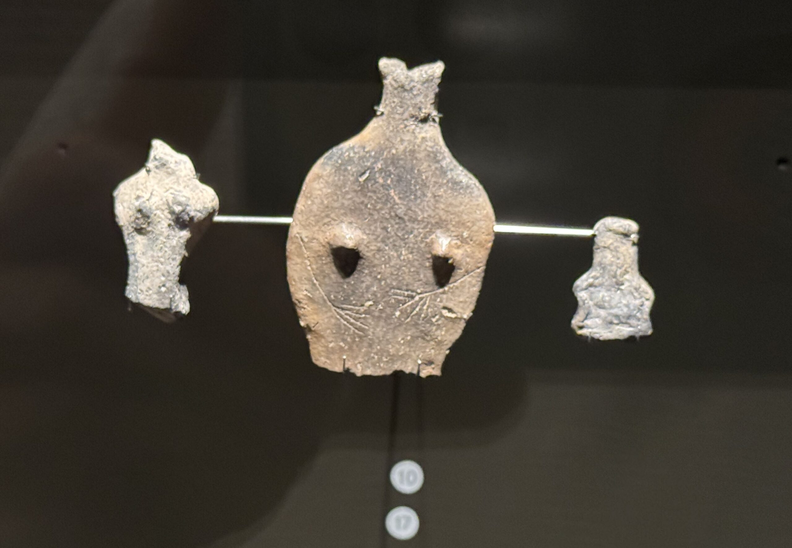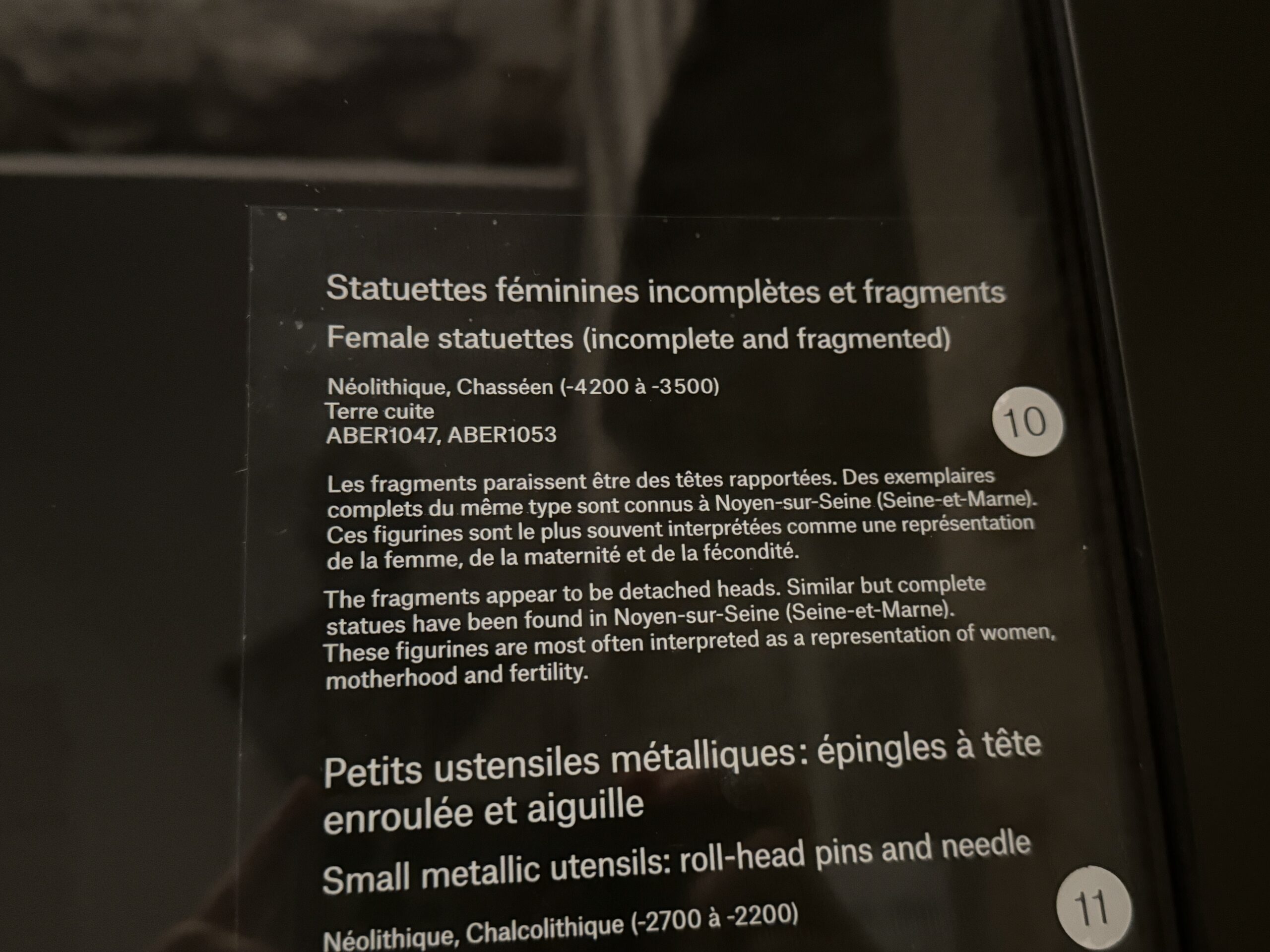 Женские статуэтки (неполные и фрагментированные). Неолит, Шасен (от -4200 до -3500) Терракота. Фрагменты, по-видимому, представляют собой головы. Полные экземпляры того же типа известны из Нуайена-сюр-Сен (департамент Сена и Марна). Чаще всего эти фигурки интерпретируются как олицетворение женщин, материнства и плодородия.