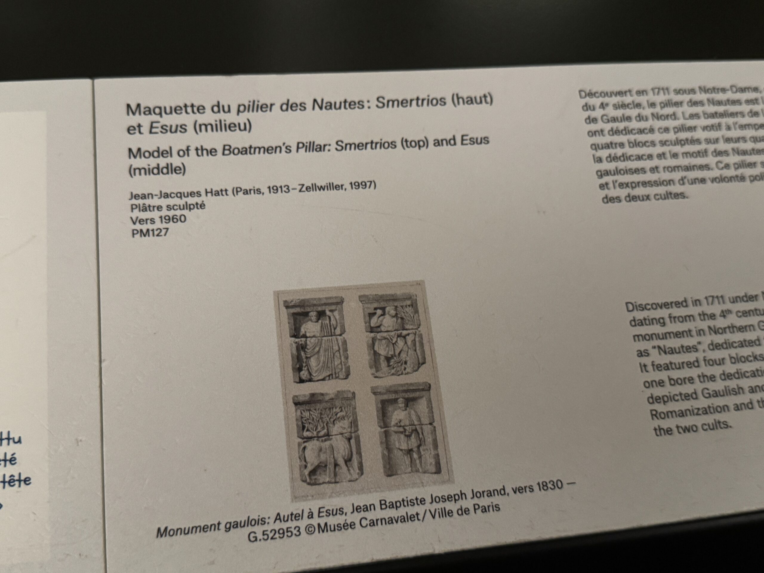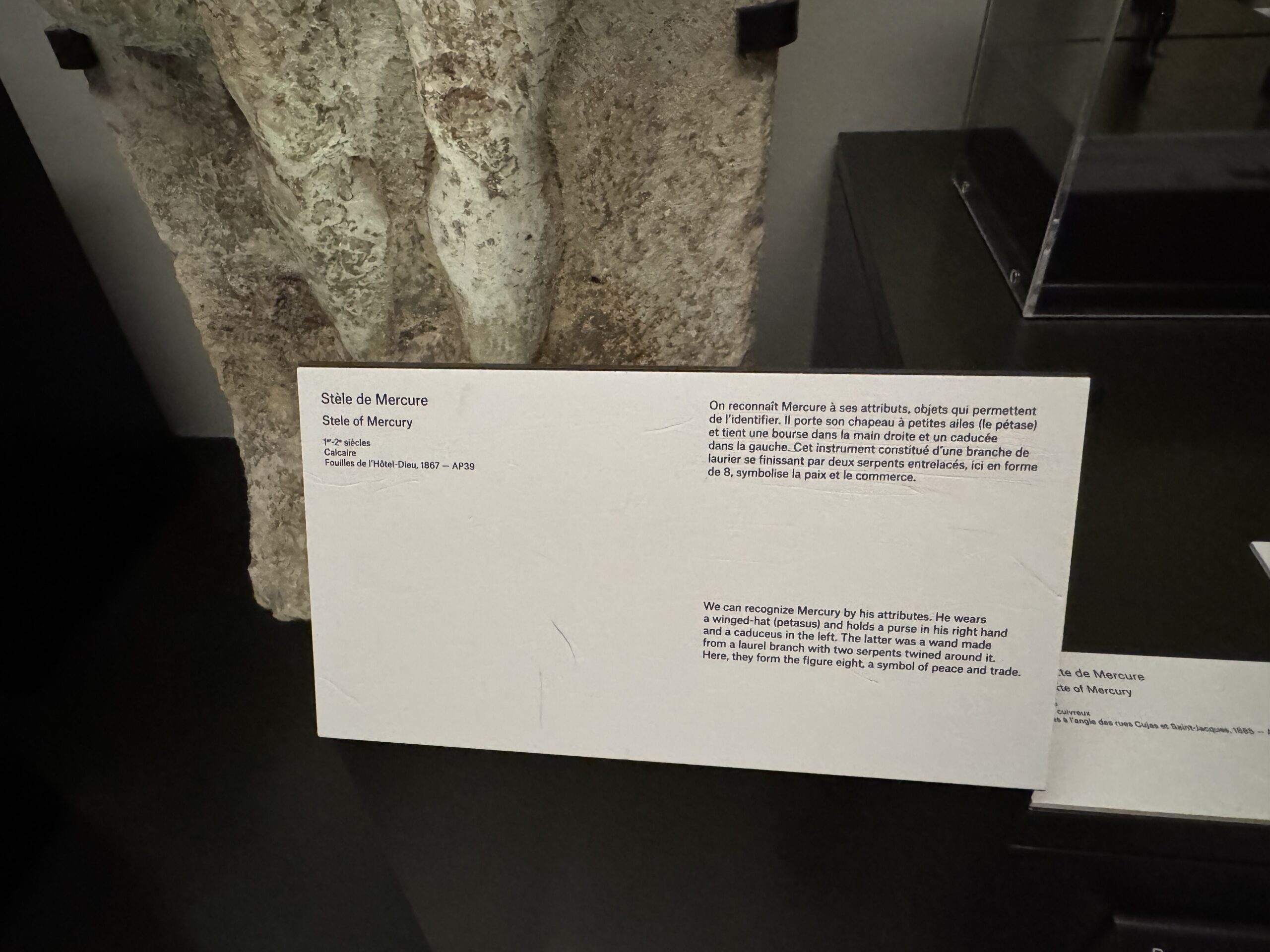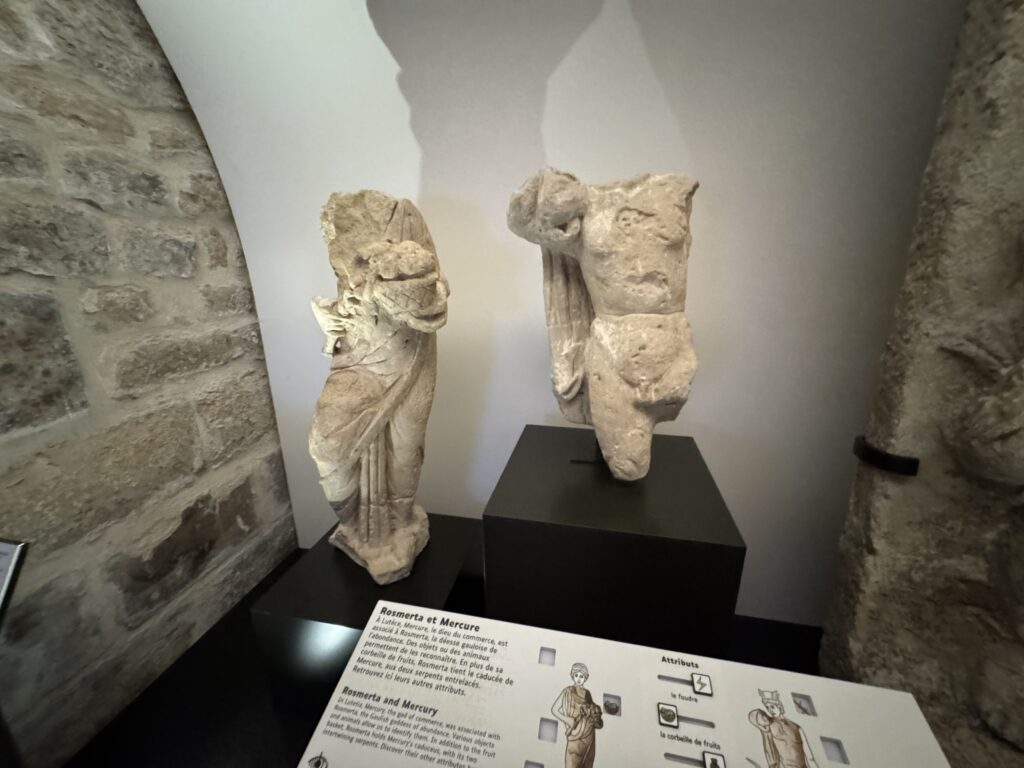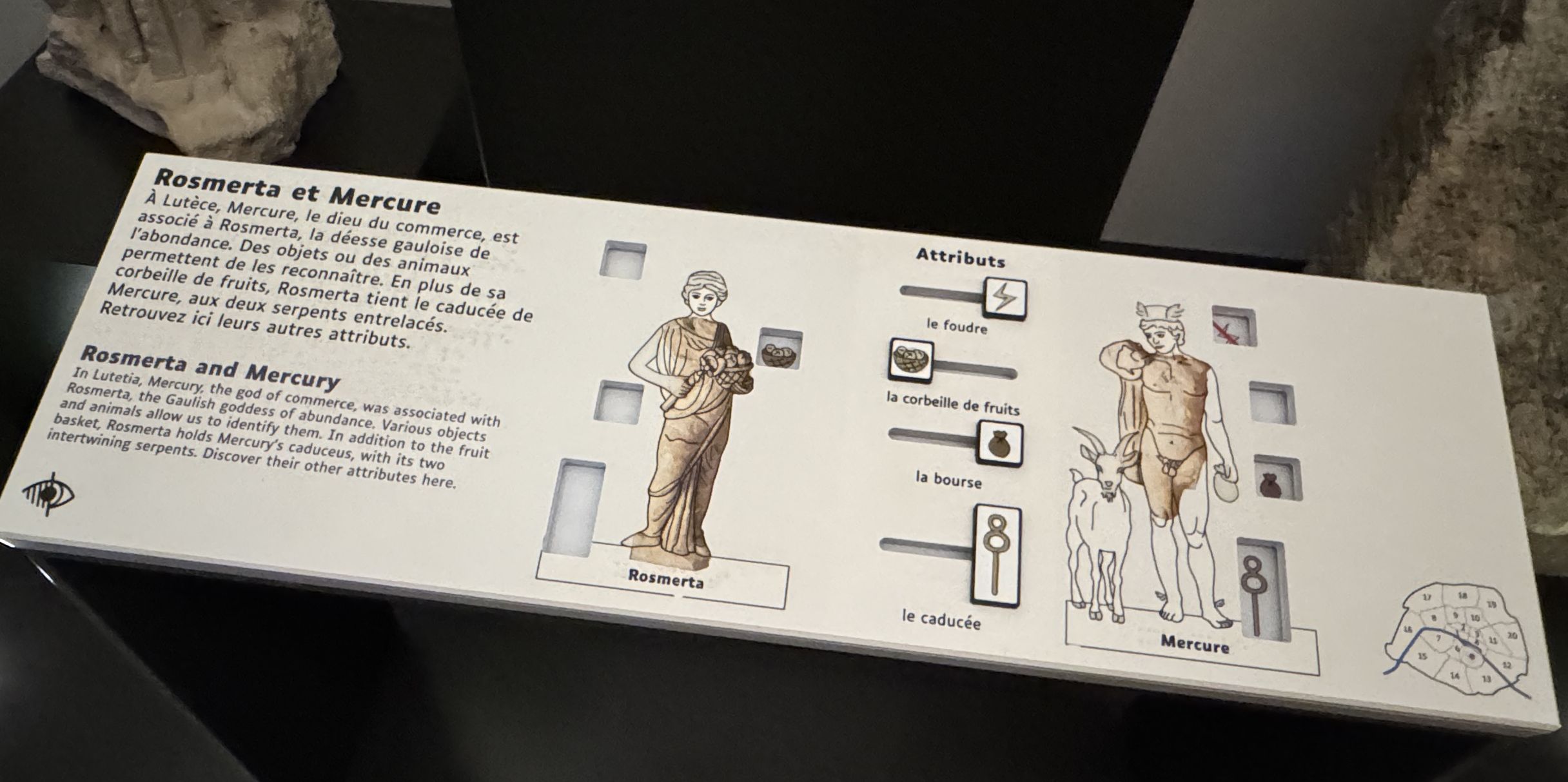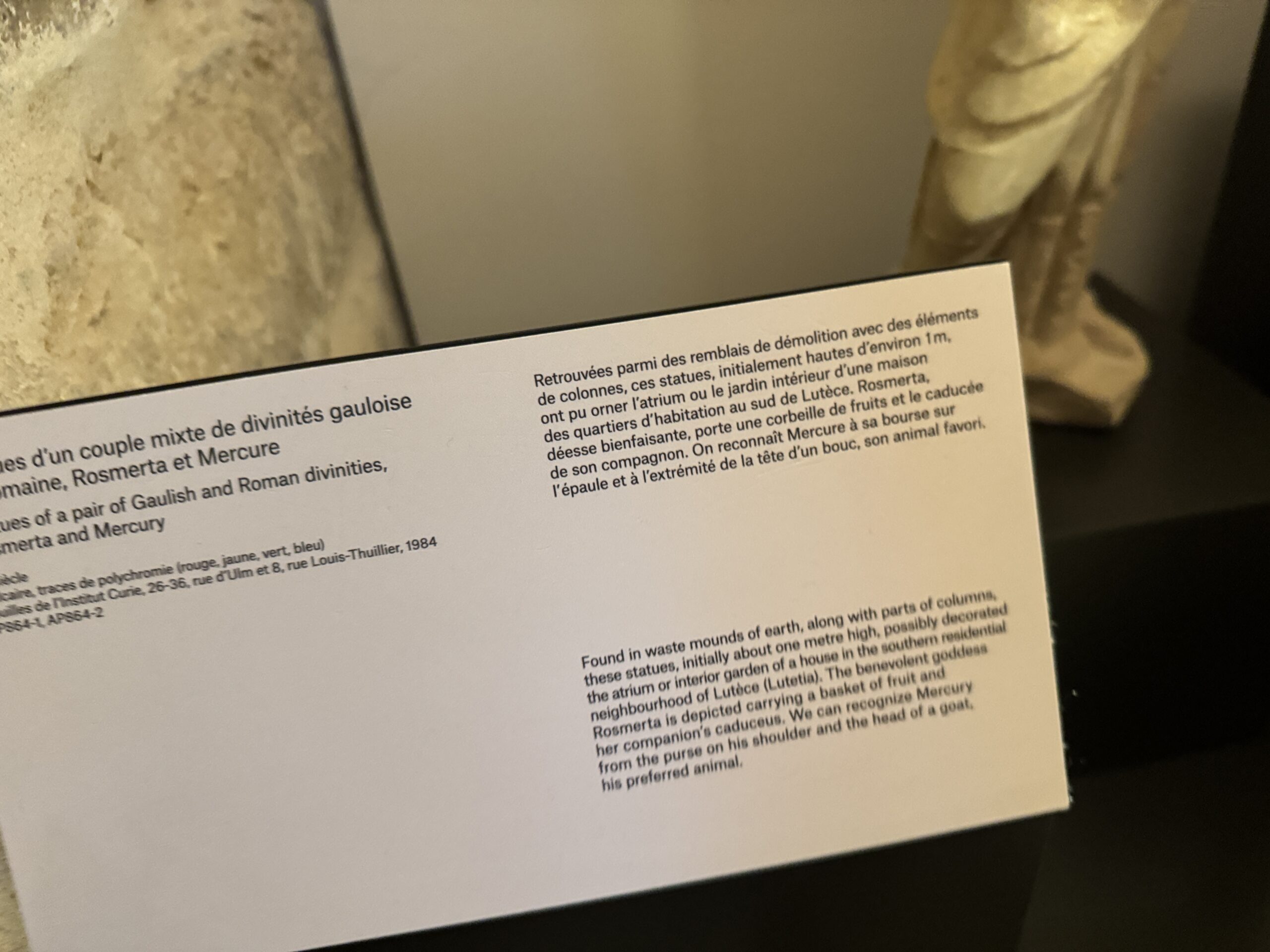 «Эти статуи, найденные в руинах вместе с фрагментами колонн, первоначально имели высоту около метра и, возможно, украшали атриум или внутренний сад дома в южном жилом районе Лютеции. Доброжелательная богиня Росмерта изображена с корзиной фруктов. Меркурия можно узнать по голове козла, его любимого животного.»