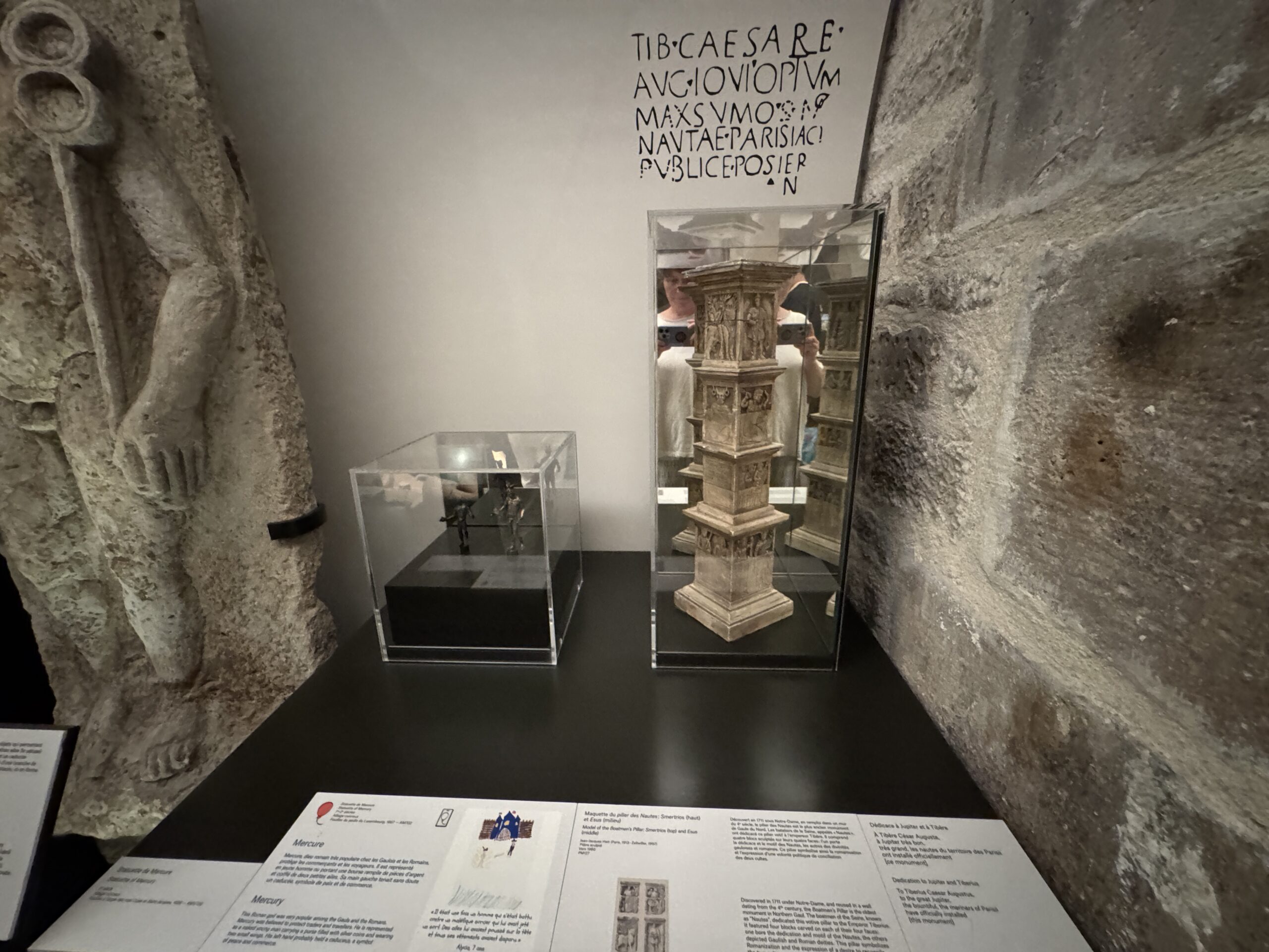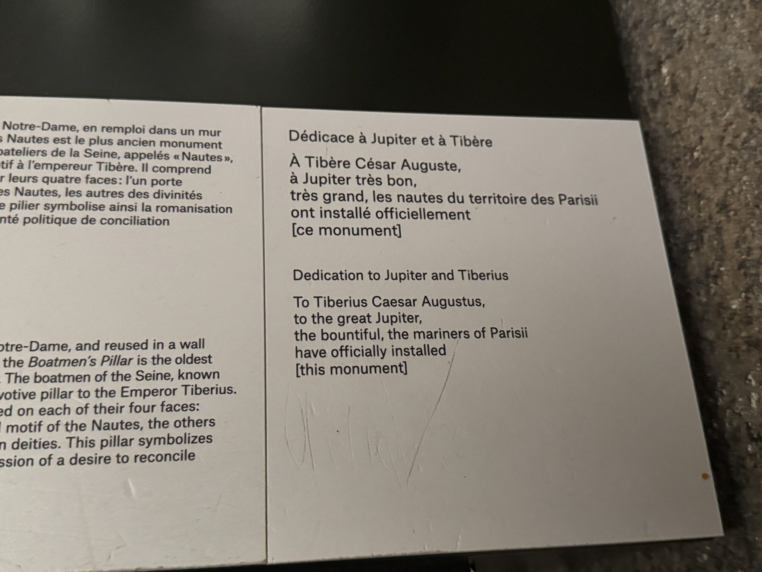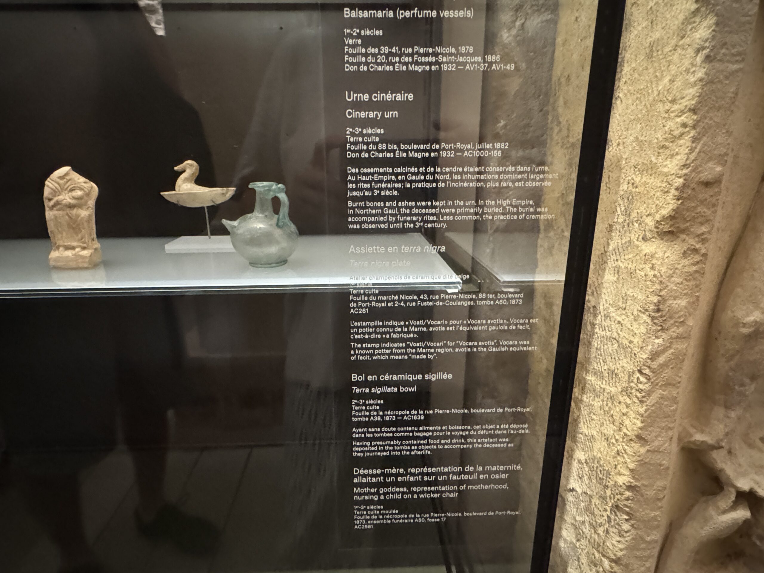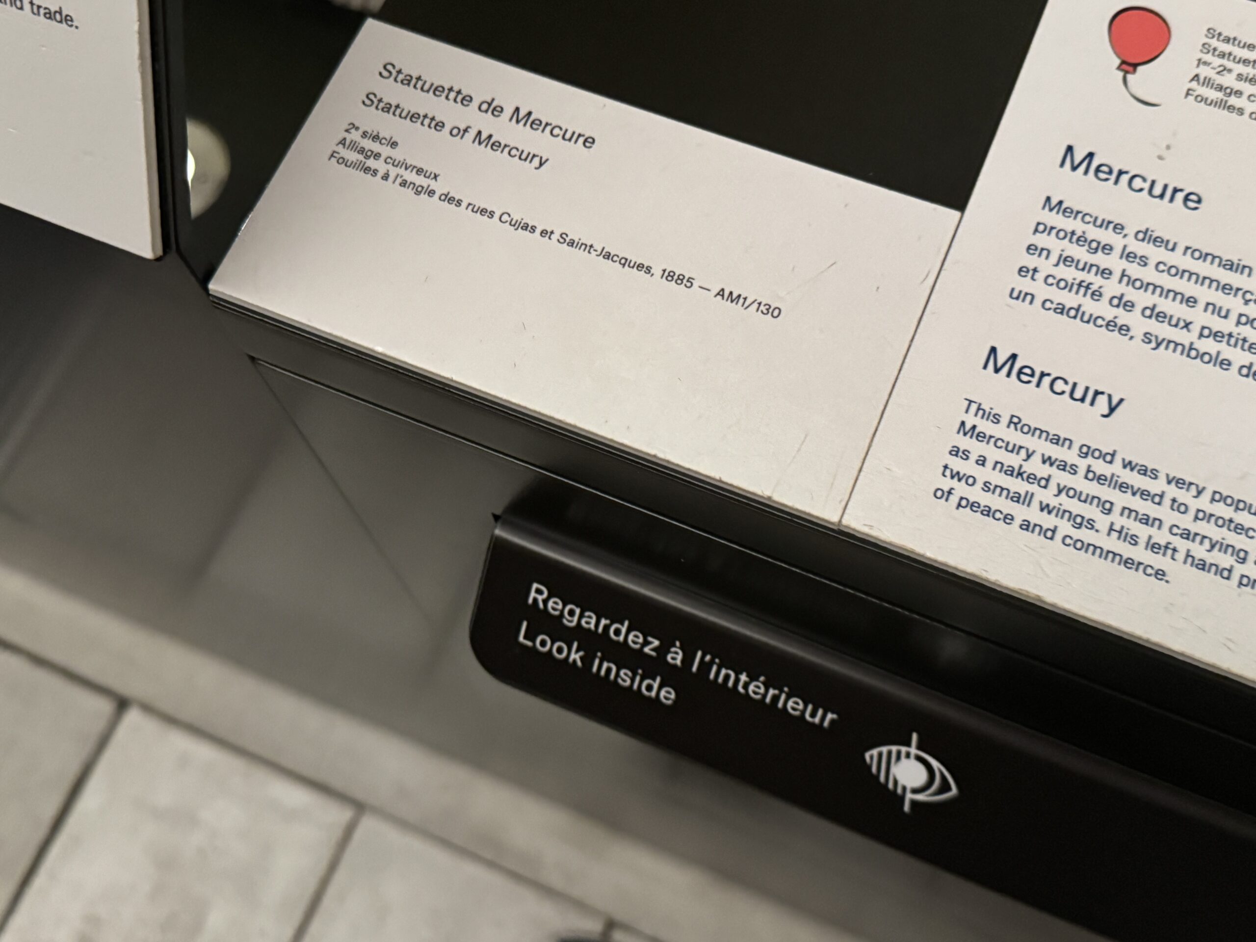 «Эти статуи, найденные в руинах вместе с фрагментами колонн, первоначально имели высоту около метра и, возможно, украшали атриум или внутренний сад дома в южном жилом районе Лютеции. Доброжелательная богиня Росмерта изображена с корзиной фруктов. Меркурия можно узнать по голове козла, его любимого животного.»