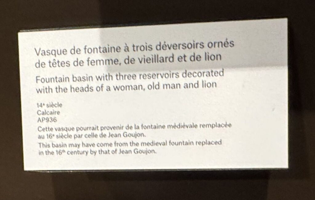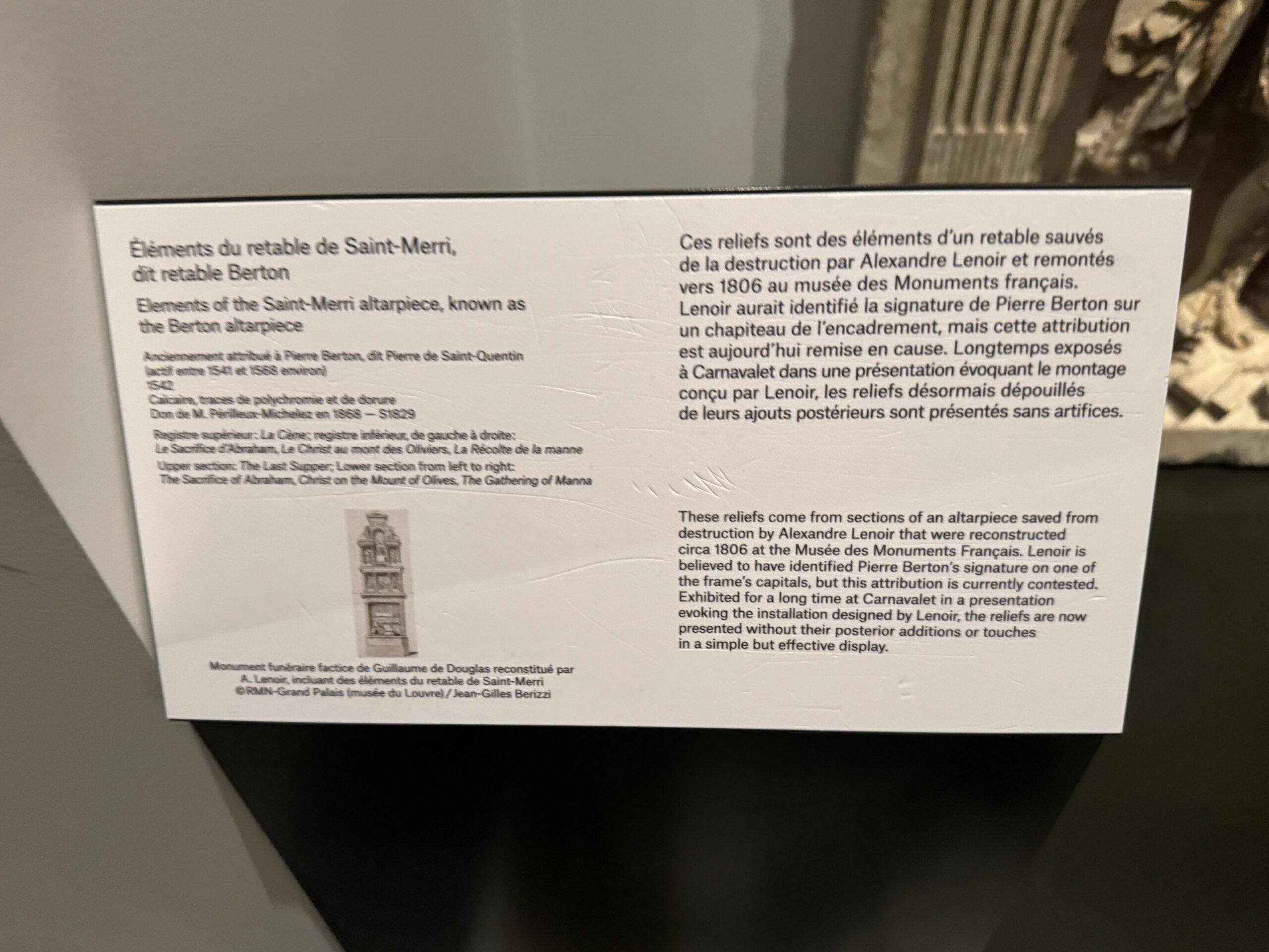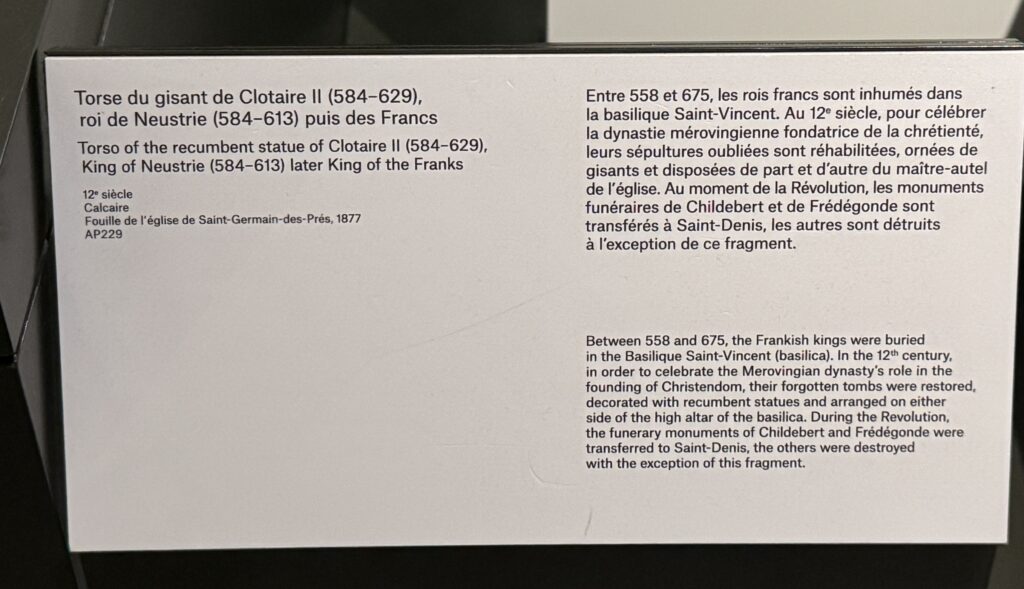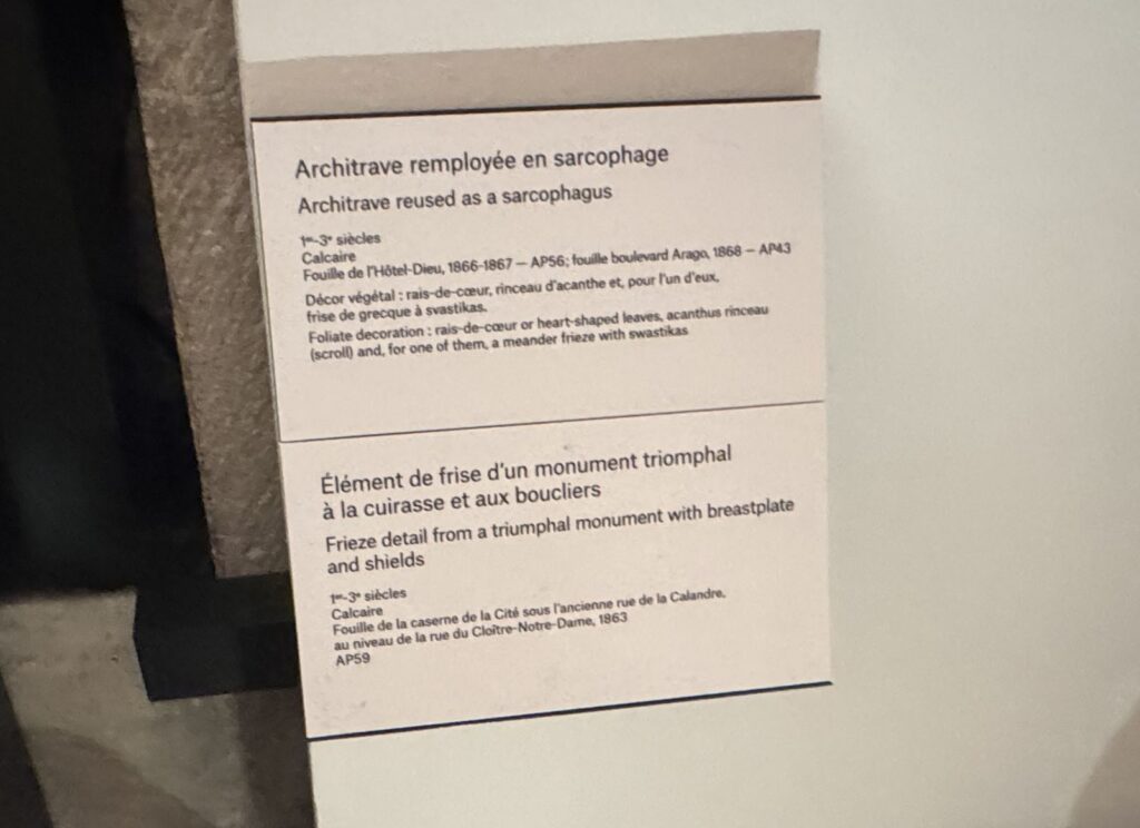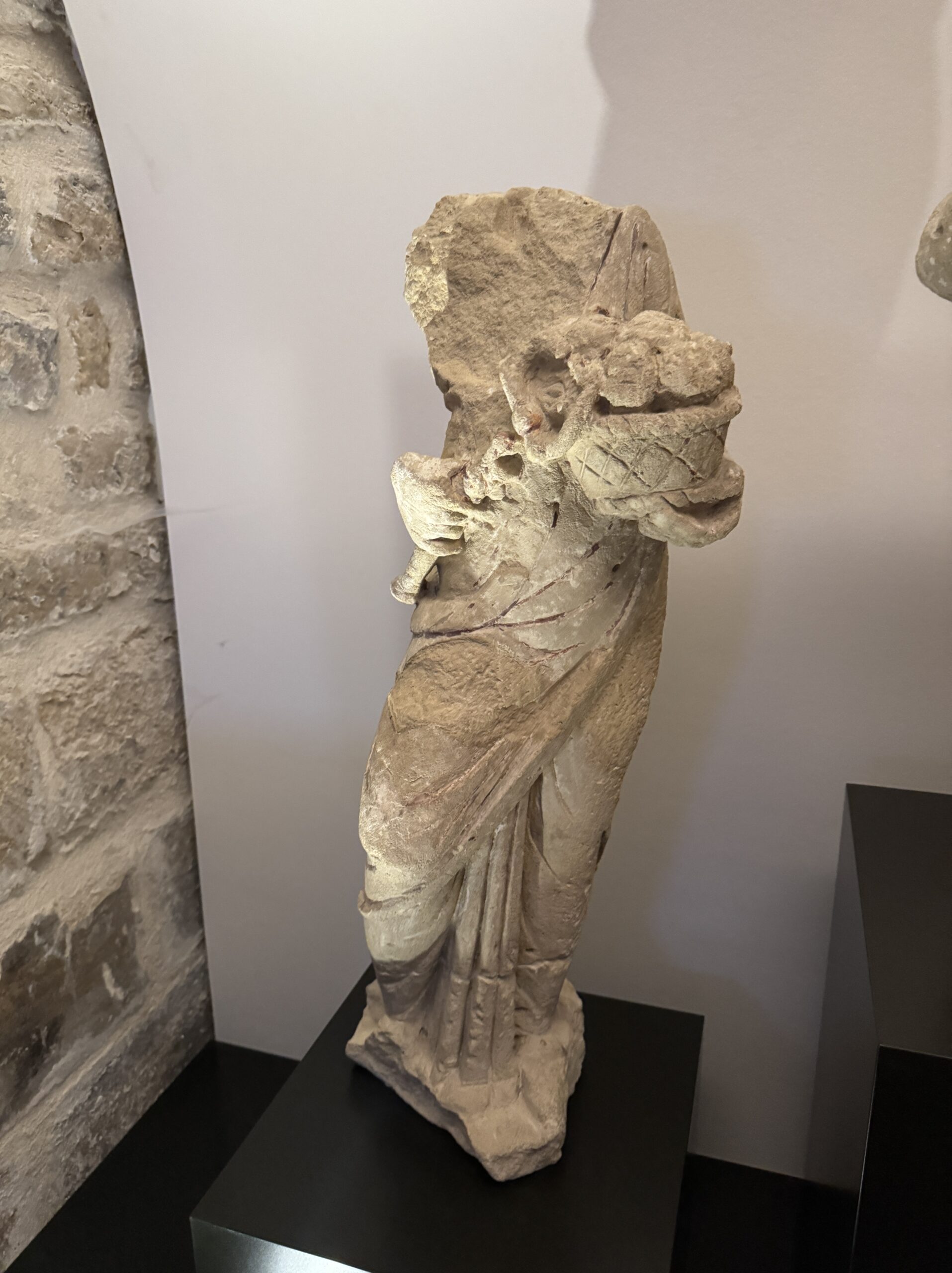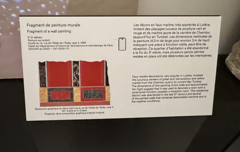 «Эти статуи, найденные в руинах вместе с фрагментами колонн, первоначально имели высоту около метра и, возможно, украшали атриум или внутренний сад дома в южном жилом районе Лютеции. Доброжелательная богиня Росмерта изображена с корзиной фруктов. Меркурия можно узнать по голове козла, его любимого животного.»