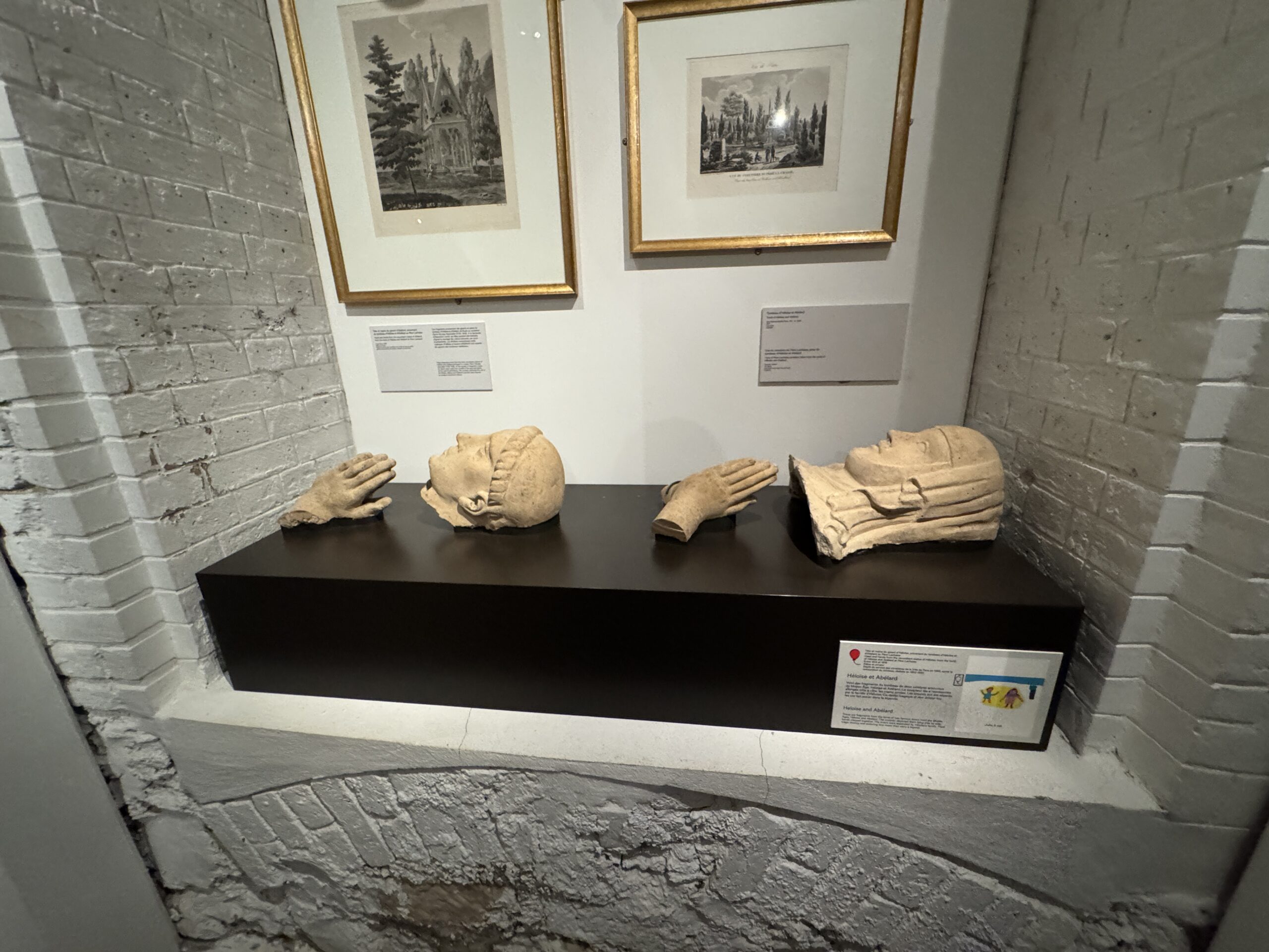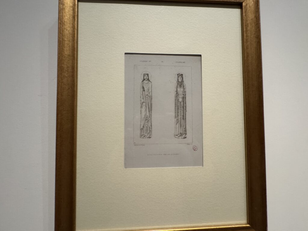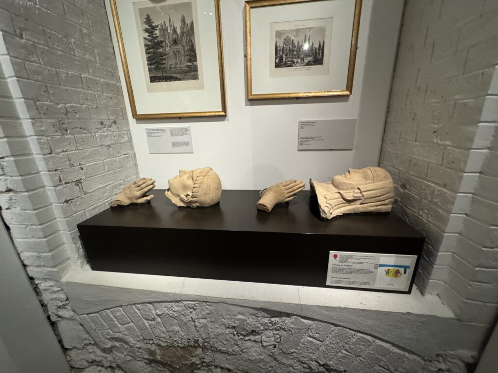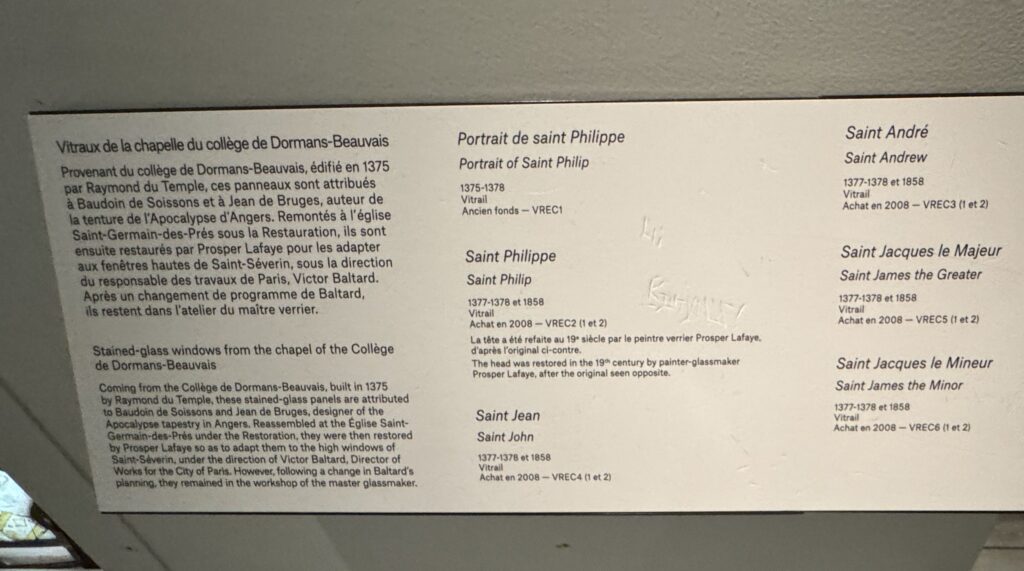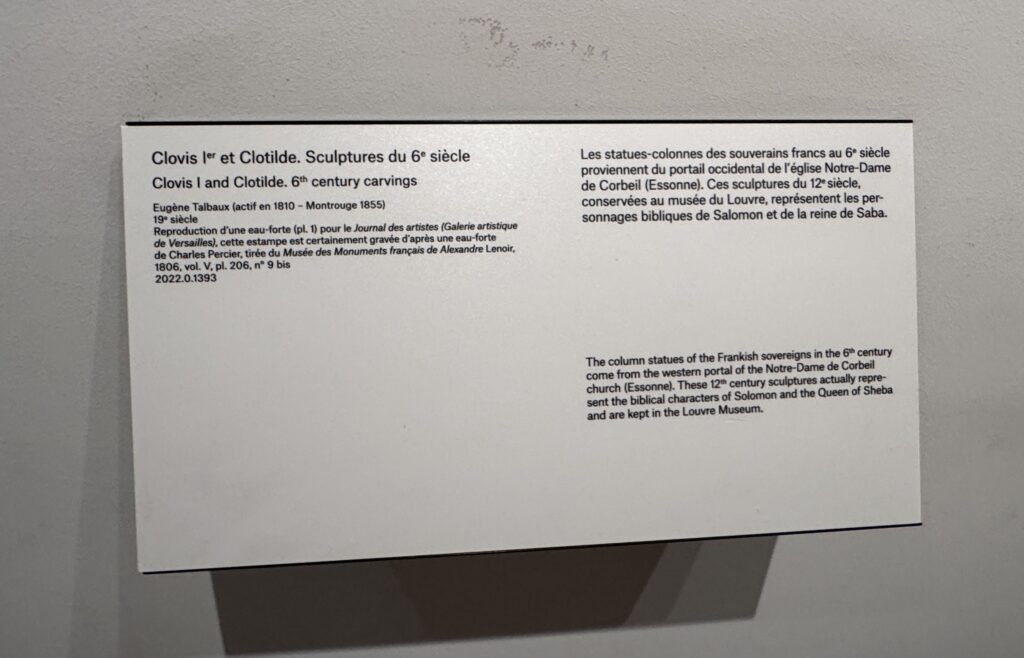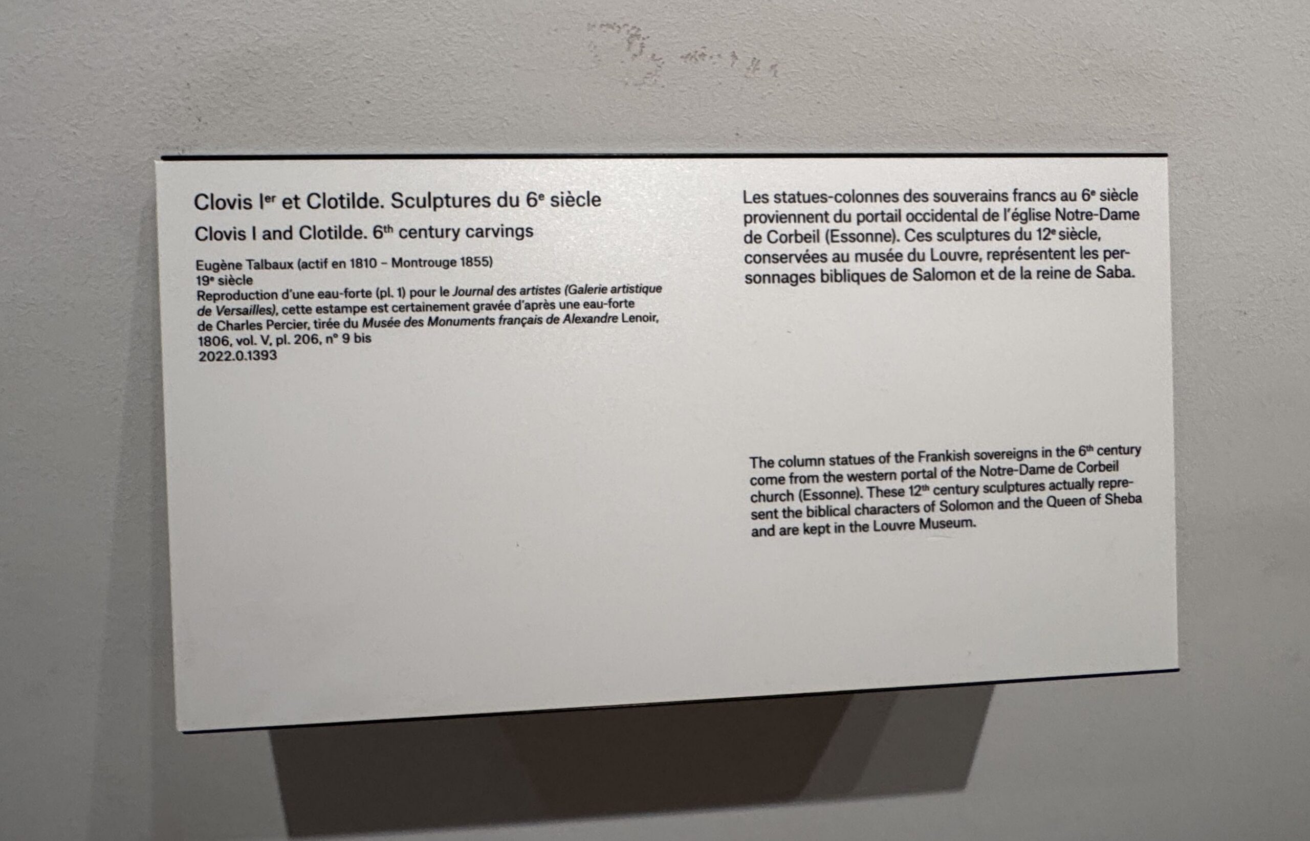 «Эти статуи, найденные в руинах вместе с фрагментами колонн, первоначально имели высоту около метра и, возможно, украшали атриум или внутренний сад дома в южном жилом районе Лютеции. Доброжелательная богиня Росмерта изображена с корзиной фруктов. Меркурия можно узнать по голове козла, его любимого животного.»