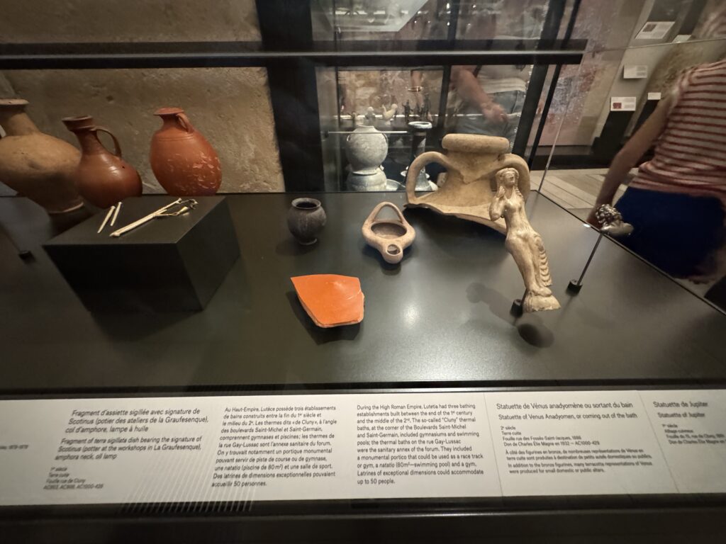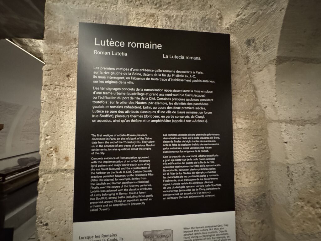 Римская Лютеция. Первые следы галло-римского присутствия, обнаруженные в Париже, на левом берегу Сены, датируются концом I века до н. э. Они позволяют нам, в отсутствие каких-либо следов предшествующих галльских поселений, поставить вопрос о происхождении города. Конкретные свидетельства романизации появились с появлением городской структуры (сетчатой ​​планировки и главной оси север-юг вдоль улицы Сен-Жак) и строительством гавани на острове Сите. Однако некоторые галльские обычаи сохранились: например, на Колонне мореплавателей (Pilier des Nautes) сосуществовали божества галльского и римского пантеонов. Наконец, в течение первых двух столетий Лютеция украсилась классическими атрибутами города, принадлежавшего римской Галлии: форумом (улица Суффло), несколькими банями (в том числе частично сохранившимися вокруг Клюни), акведуком, а также театром и амфитеатром (неправильно называемым «Арена»).