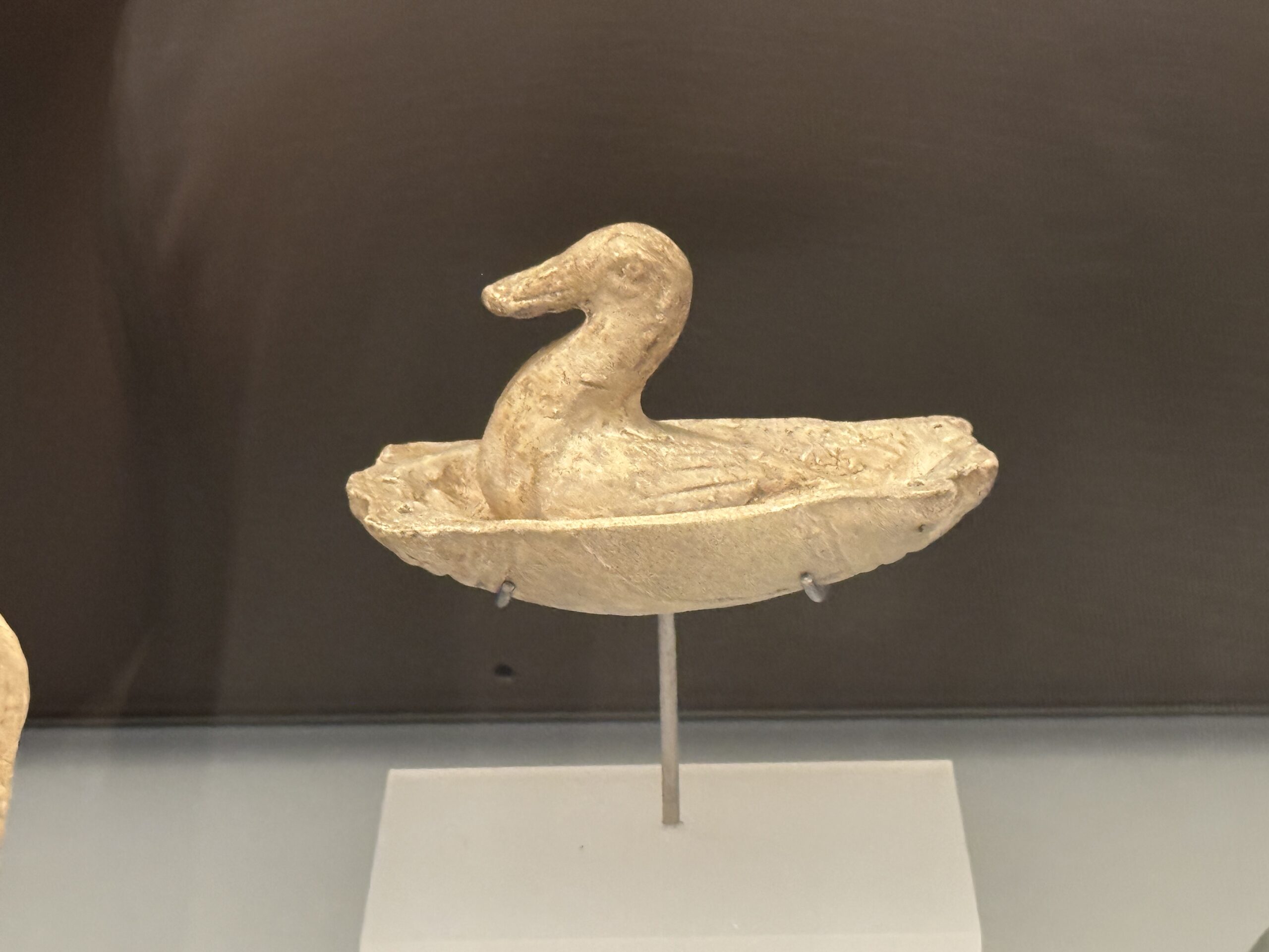 Утка в небольшой овальной лодке, интерпретируемая как детская игрушка. I–II вв., Старый некрополь на улице Пьер Николь и в Пор-Рояле, Детский погребальный гарнитур A 50, яма 17 Высота: 6,4 см Длина: 10,3 см Ширина: 4,5 см Белая терракота из Лезу или Алье; левая часть гондолы отломана.