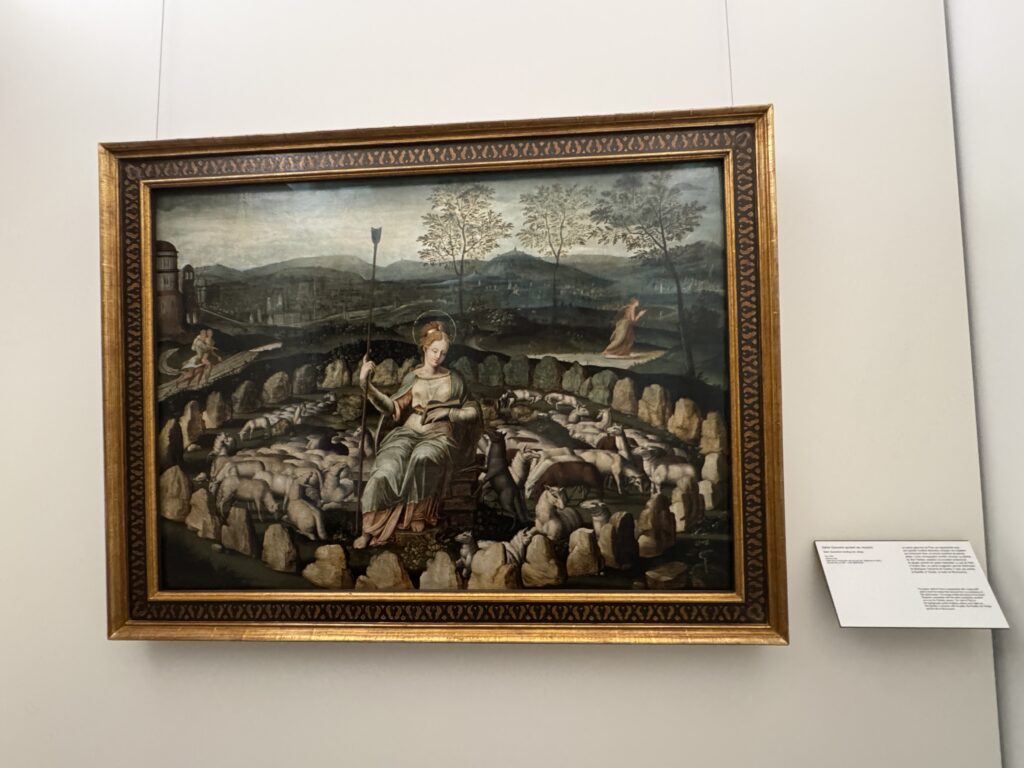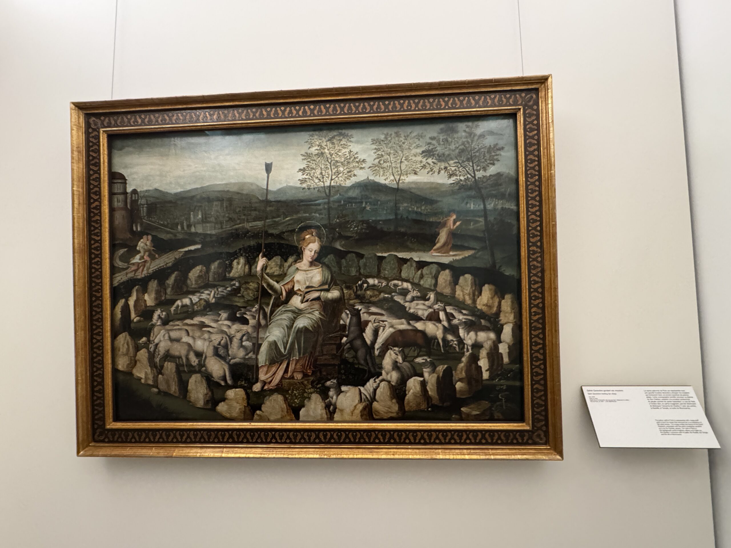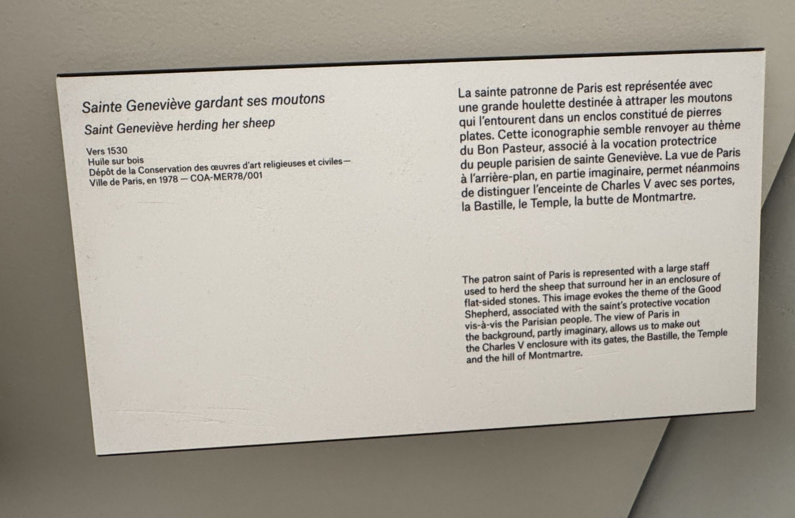 Святая Женевьева присматривает за своими овцами, около 1530 года, дерево, масло. Передано в Департамент по сохранению религиозных и гражданских произведений искусства города Парижа в 1978 году.