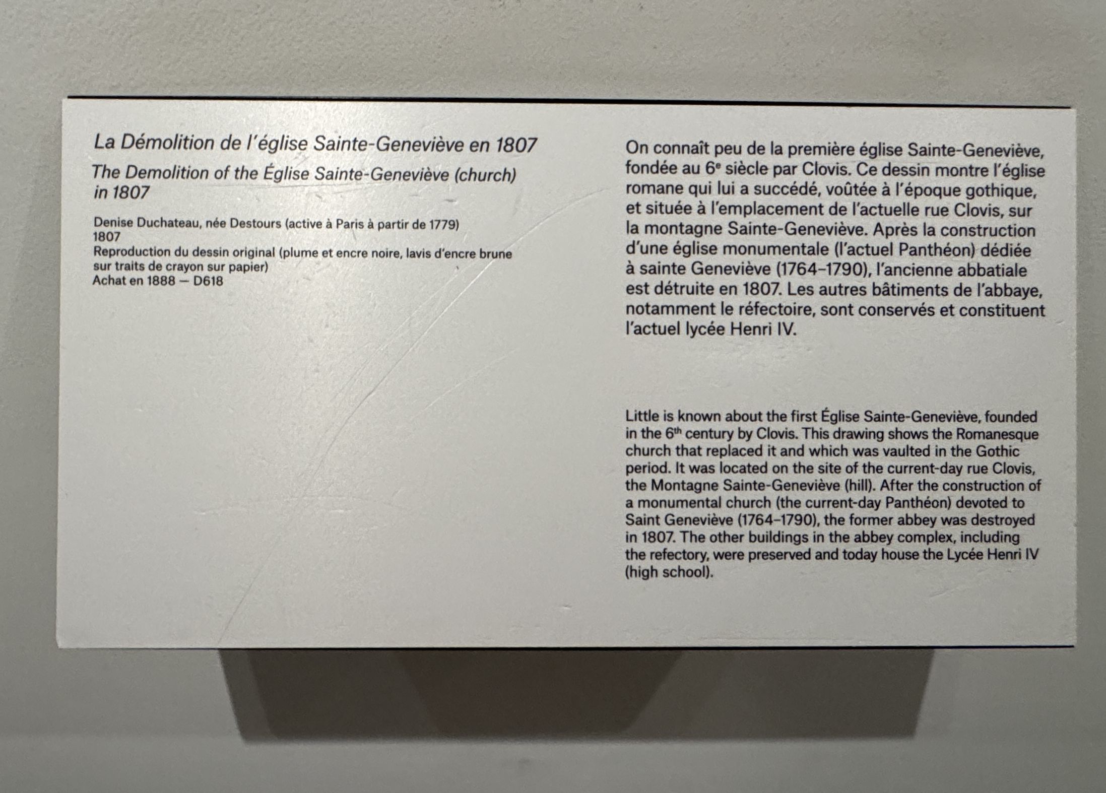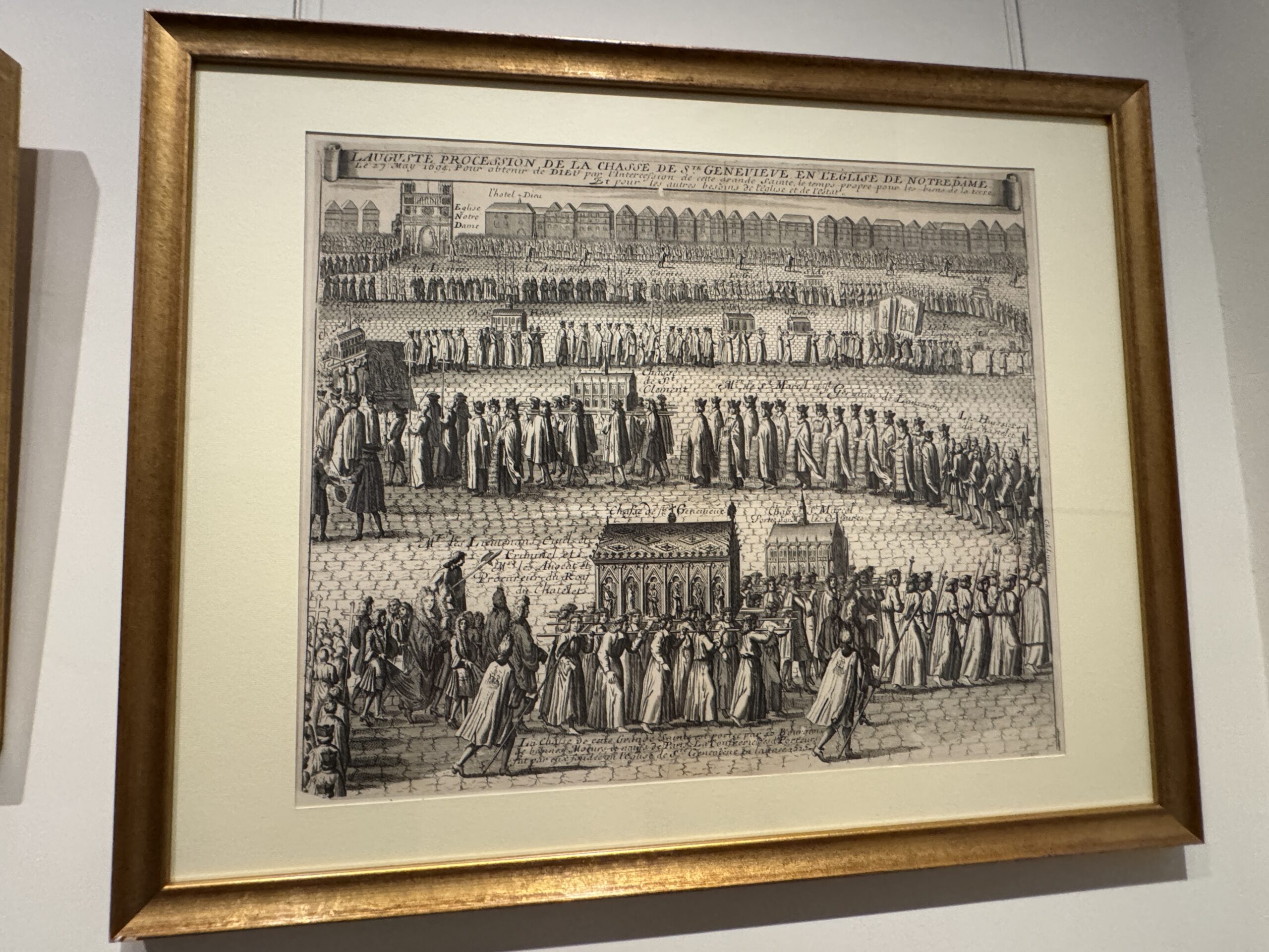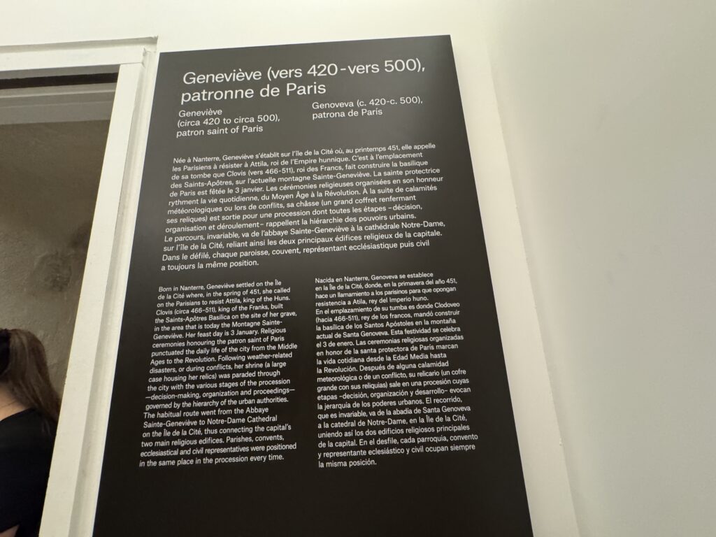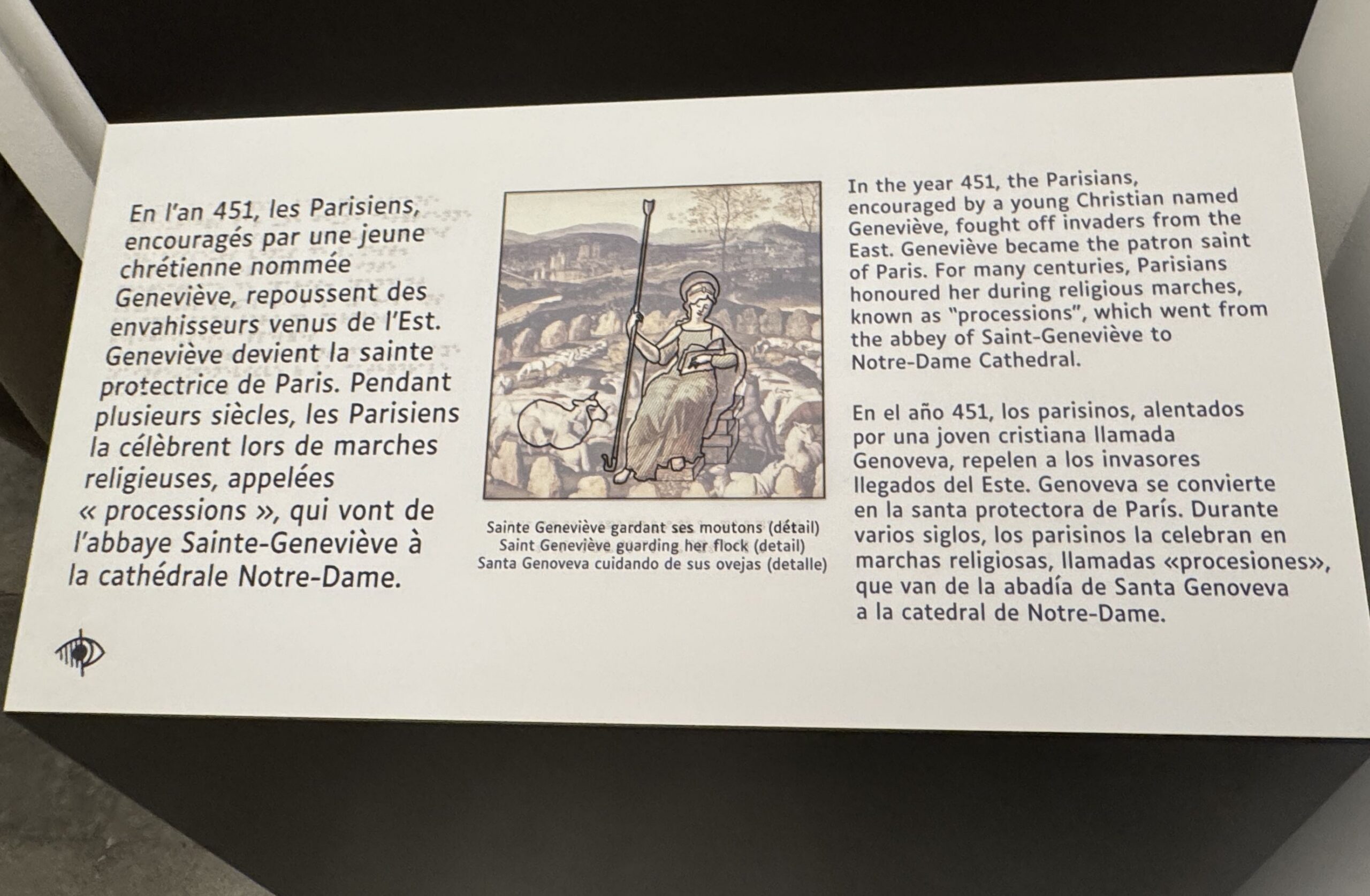 В 451 году парижане, воодушевлённые молодой христианкой по имени Женевьева, отразили набеги с Востока. Женевьева стала святой покровительницей Парижа. На протяжении многих веков парижане почитали её во время религиозных шествий, известных как «процессии», которые проходили от аббатства Сен-Женевьев до собора Парижской Богоматери. (Интересный художественный цикл про Женевьеву чуть позже я опубликую в фотогалерее из Пантеона)