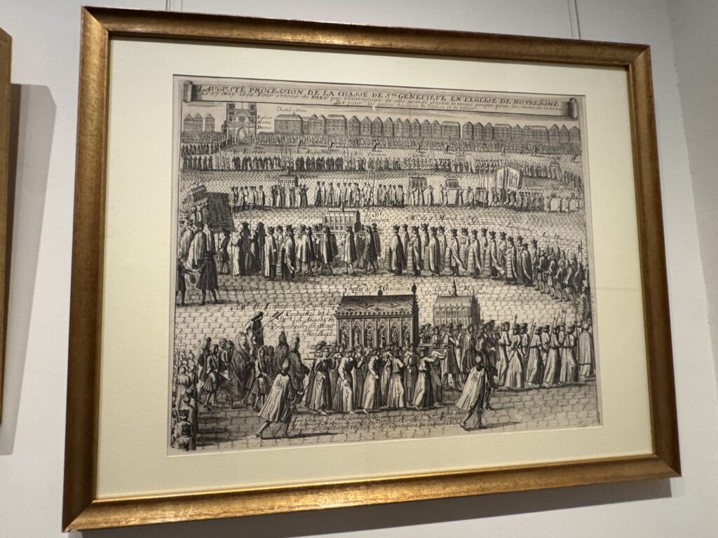 Родившись в Нантере, Женевьева поселилась на острове Сите, где весной 451 года призвала парижан противостоять Аттиле, королю гуннов. Хлодвиг (около 466–511), король франков, построил базилику Святых Апостолов на месте её захоронения, в районе нынешней горы Сент-Женевьев. День её памяти – 3 января. Религиозные церемонии в честь святой покровительницы Парижа были неотъемлемой частью повседневной жизни города от Средних веков до Революции. После стихийных бедствий или во время конфликтов её раку (большой футляр для хранения её мощей) торжественно проносили по городу, причём различные этапы шествия – принятие решений, организация и порядок проведения – контролировались иерархией городских властей. Традиционно маршрут проходил от аббатства Сент-Женевьев до собора Нотр-Дам на острове Сите, соединяя два главных религиозных сооружения столицы. Приходы, монастыри, представители духовенства и светской власти каждый раз занимали одно и то же место в процессии.