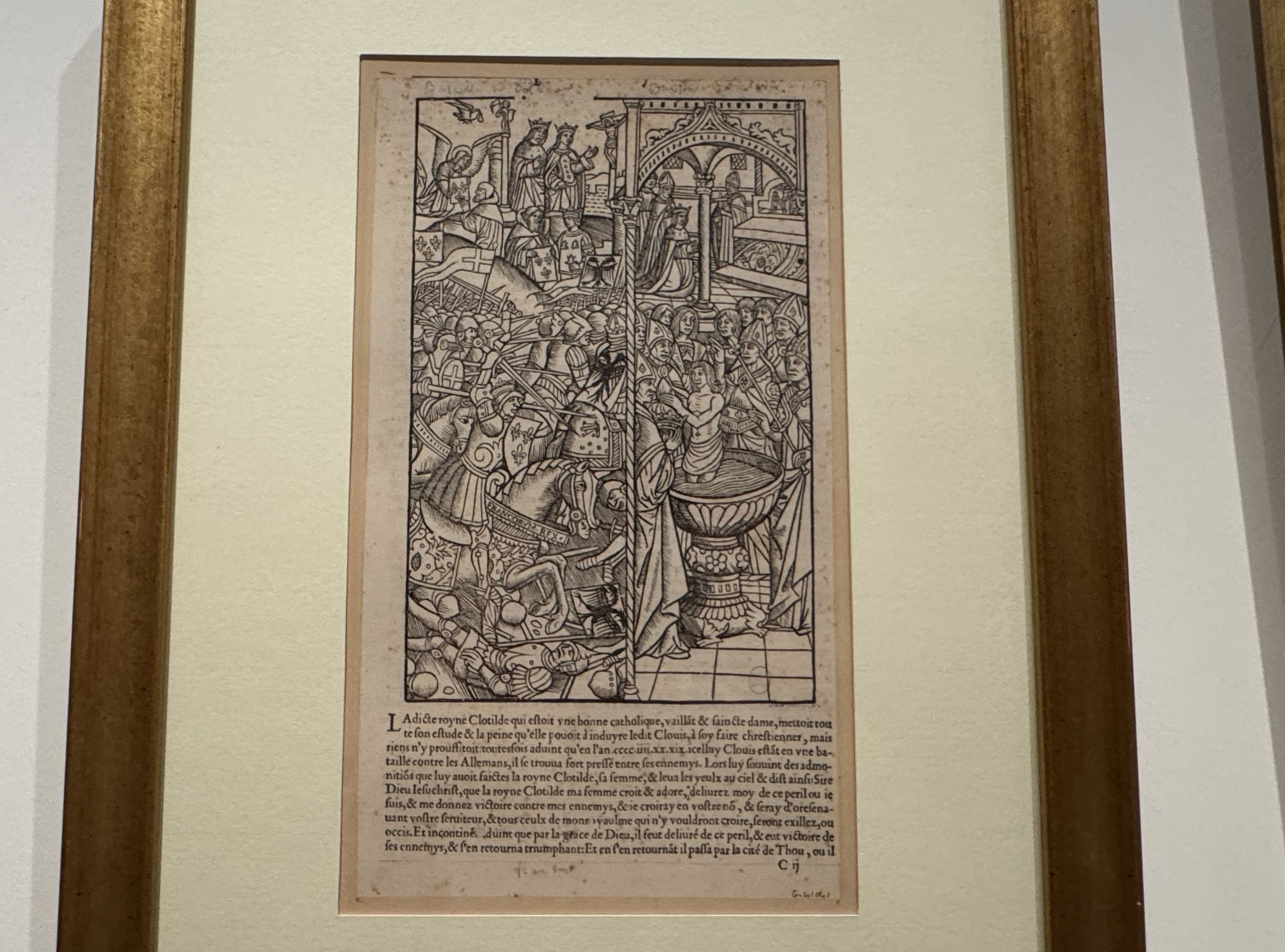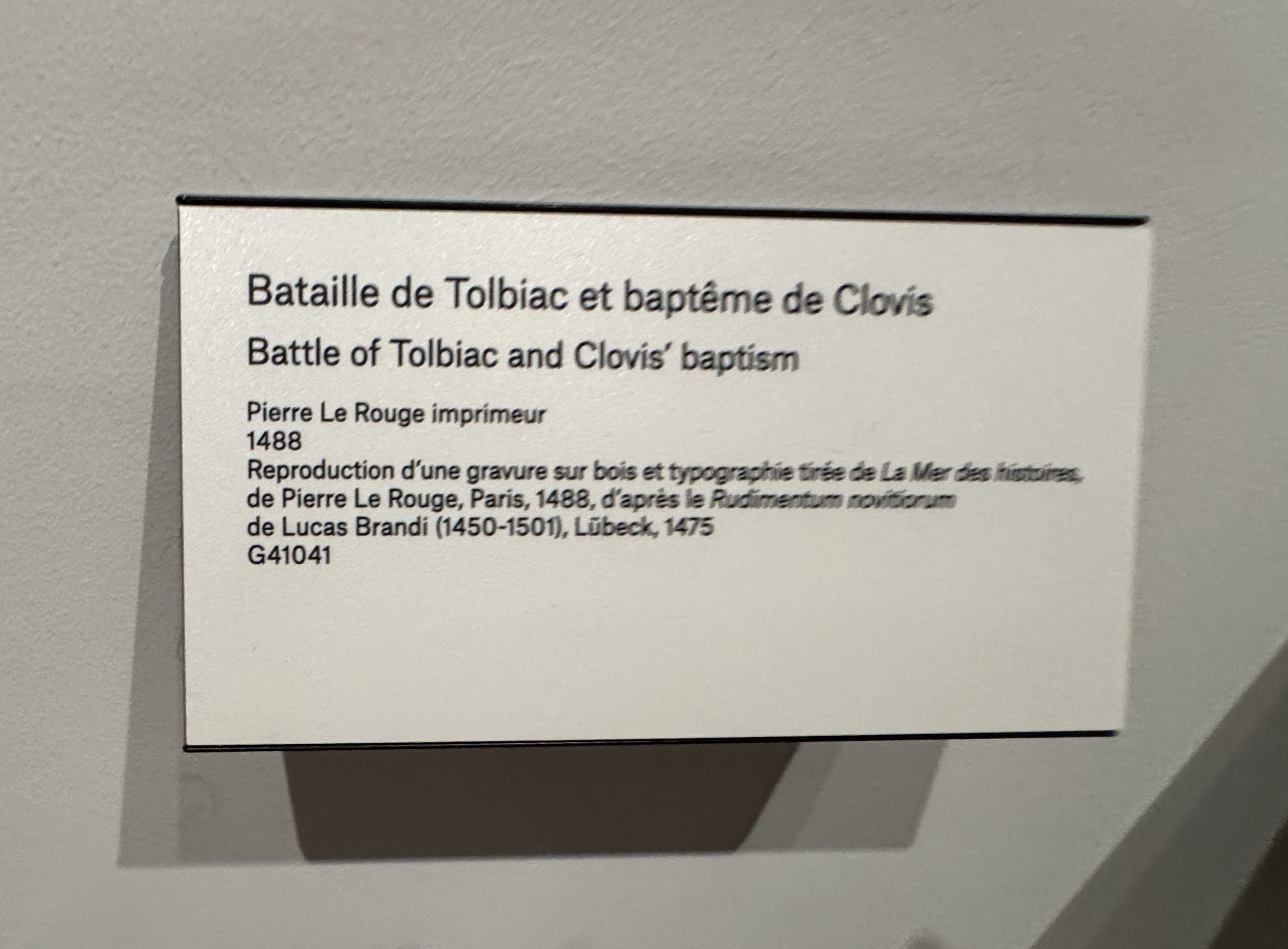 Битва при Толбиаке и крещение Хлодвига, Репродукция гравюры на дереве и типографии из «La Mer des histoires» Пьера Ле Ружа, Париж, 1488 год, по мотивам Rudimentum novitiorum, Лукас Бранди (1450–1501), Любек, 1475 г.