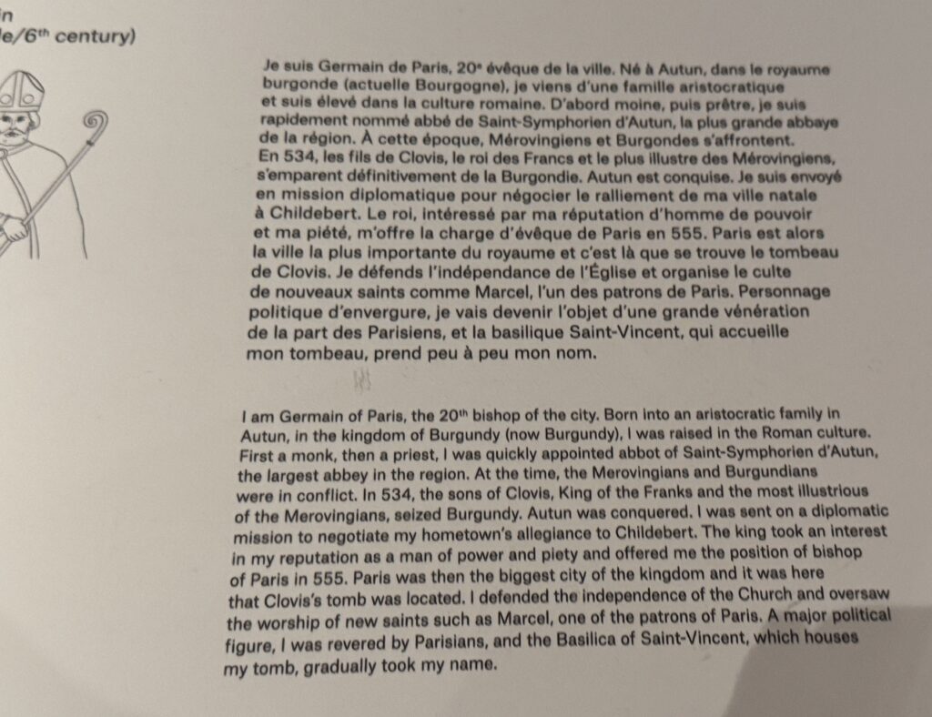 Я — Жермен де Пари, двадцатый епископ города. Родившись в Отёне, в Бургундском королевстве (современная Бургундия), я происхожу из аристократической семьи и был воспитан в римской культуре. Сначала монах, затем священник, я быстро был назначен аббатом Сен-Симфорьен д’Отён, крупнейшего аббатства в регионе. В то время меровинги и бургунды столкнулись. В 534 году сыновья Хлодвига, короля франков и самого прославленного из Меровингов, окончательно захватили Бургундию. Отён был завоёван. Меня отправили с дипломатической миссией к Хильдеберту, чтобы договориться о возвращении моего родного города. Король, заинтересованный моей репутацией влиятельного человека и моим благочестием, предложил мне должность епископа Парижа в 555 году. Париж был тогда важнейшим городом королевства, и именно там находится гробница Хлодвига. Я отстаиваю независимость Церкви и организую культ новых святых, таких как Марцелл, один из покровителей Парижа. Будучи влиятельной политической фигурой, я стану объектом огромного почитания парижан, и базилика Сен-Венсан, где находится моя гробница, со временем будет носить моё имя.