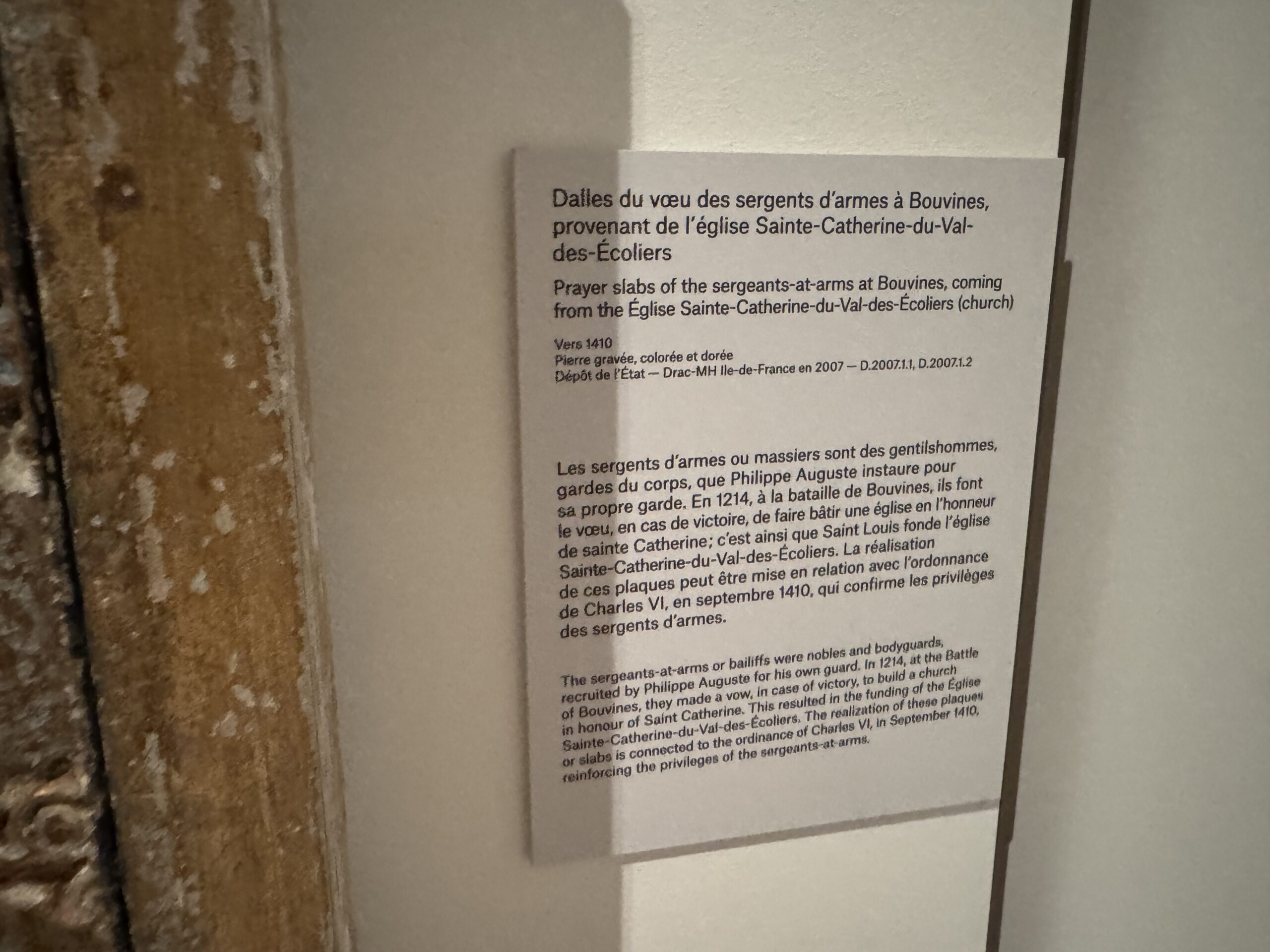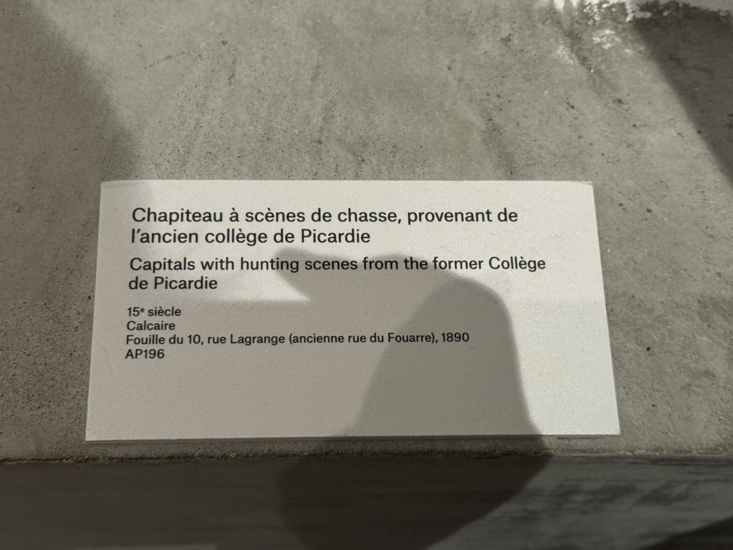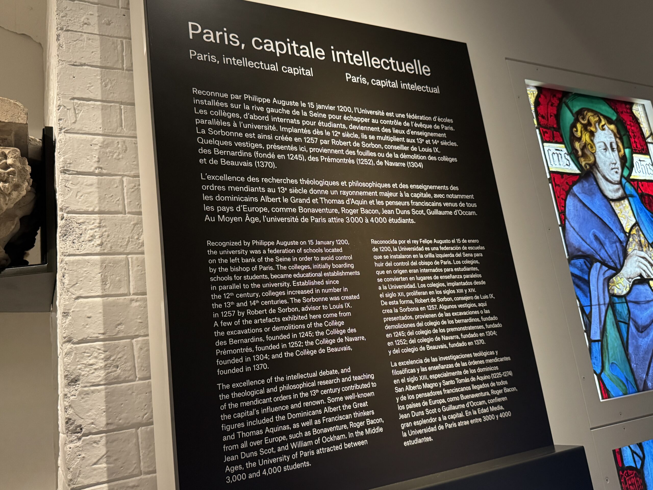 Университет, учрежденный королем Филиппом Августом 15 января 1200 года, представлял собой федерацию школ, расположенных на левом берегу Сены, чтобы избежать контроля со стороны епископа Парижа. Колледжи, изначально служившие пансионами для студентов, стали учебными заведениями, работавшими параллельно с университетом. Основанные в XII веке, колледжи увеличивали свое число в XIII и XIV веках. Сорбонна была основана в 1257 году Робером де Сорбоном, духовником и советником Людовика IX. Некоторые из экспонатов, представленных здесь, происходят из раскопок или сносов Колледжа бернардинцев, основанного в 1245 году; Колледжа Премонтрес, основанного в 1252 году; Колледжа Наварры, основанного в 1304 году; и Колледжа Бове, основанного в 1370 году.