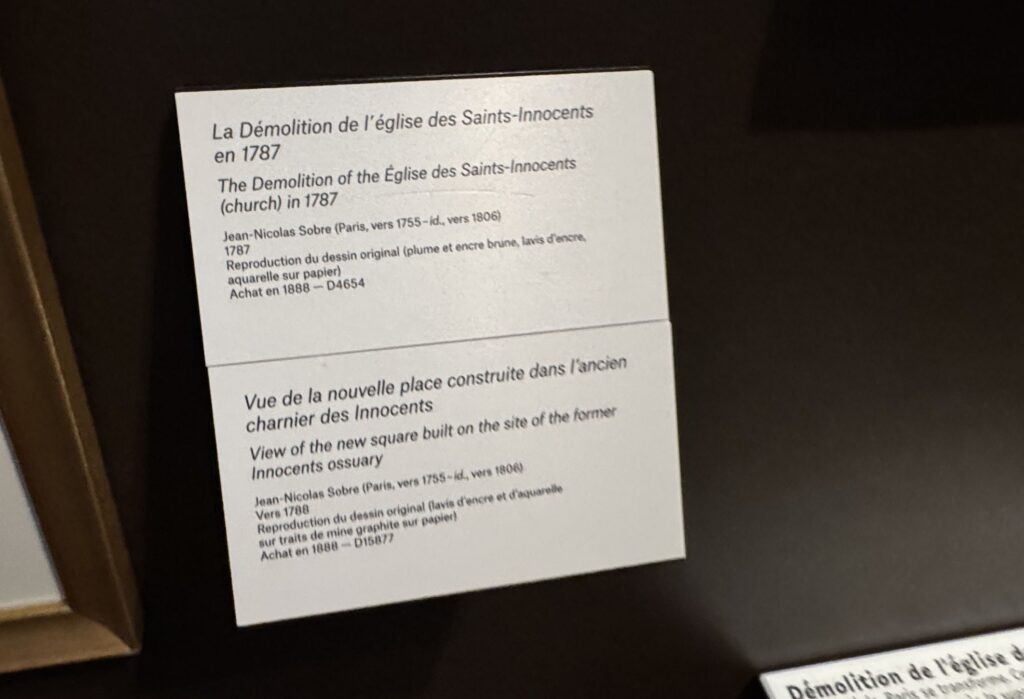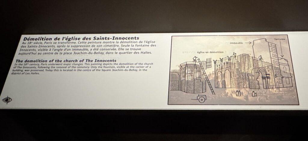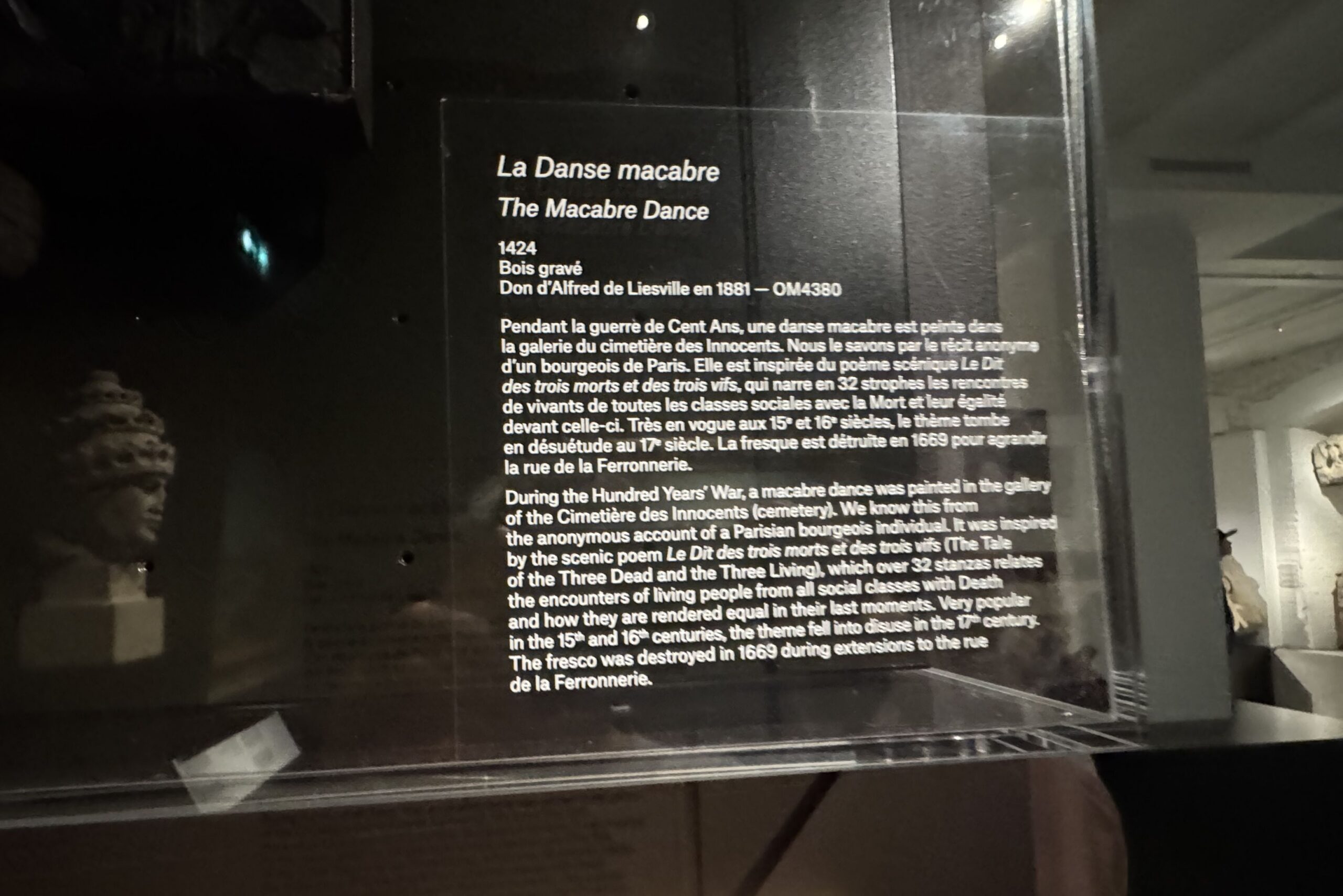 Во время Столетней войны в галерее Кладбища невинных была написана «Пляска смерти». Нам известно об этом из анонимного рассказа парижского буржуа. Она была вдохновлена ​​сценической поэмой «Разговор трёх мёртвых и трёх живых», которая в 32 строфах повествует о встречах живых всех сословий со Смертью и об их равенстве перед ней. Эта тема, чрезвычайно популярная в XV и XVI веках, в XVII веке вышла из употребления. Фреска была уничтожена в 1669 году при расширении улицы Ферроннери.