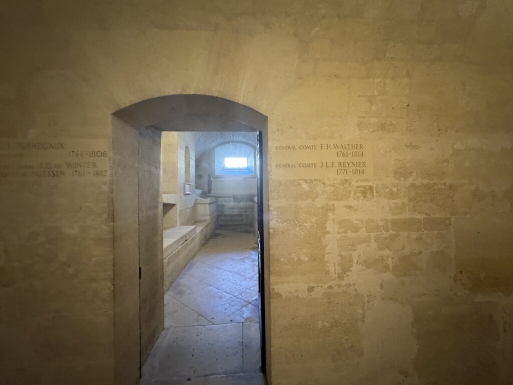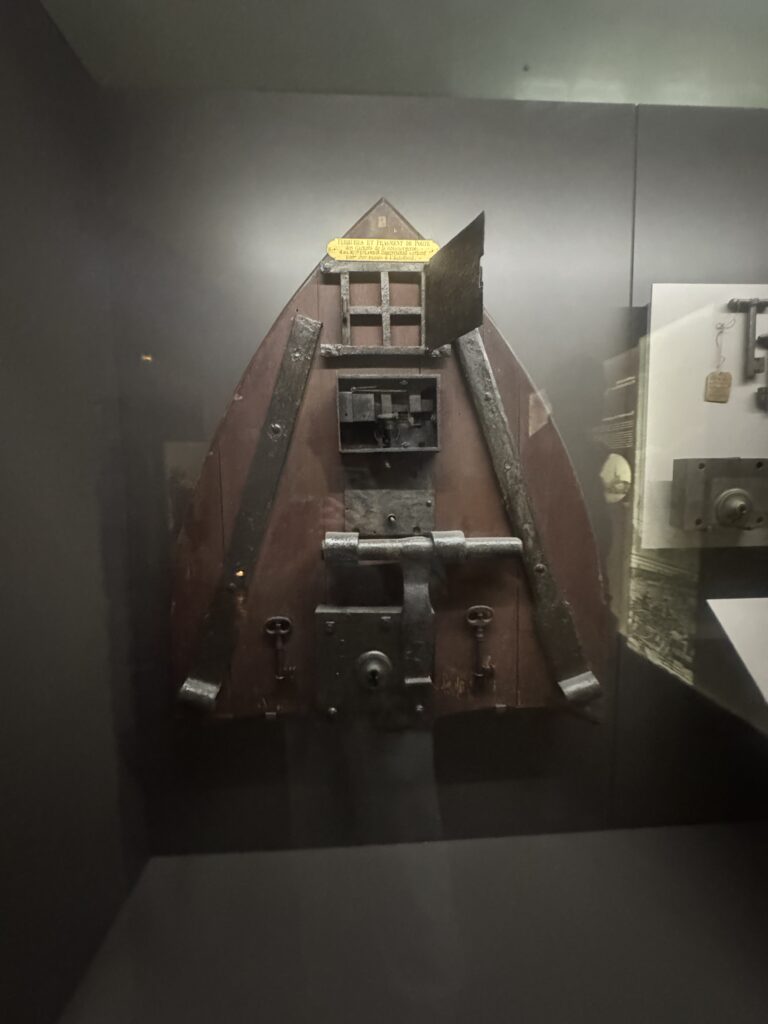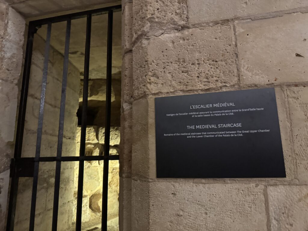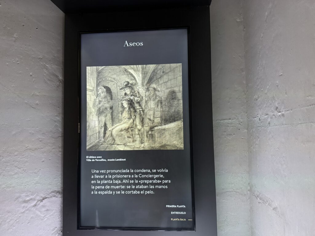 Вход и выход из Консьержери. Три камеры, которые вы видите в этом коридоре, являются реконструкциями. Они были сделаны в 1989 году, во время двухсотлетия Французской революции, на месте бывшего коридора. Слева находится стол клерка. Последний, в частности, отвечал за регистрацию имён заключённых, поступающих в тюрьму и покидающих её, в тюремном журнале «Registr d’Ecrouc» – журнале, который позволял ежедневно отслеживать количество заключённых в Консьержери. В центре – кабинет консьержа, директора тюрьмы. Справа — комната для стрижки: в день казни приговоренным приходилось стричь волосы, чтобы облегчить прохождение лезвия гильотины.