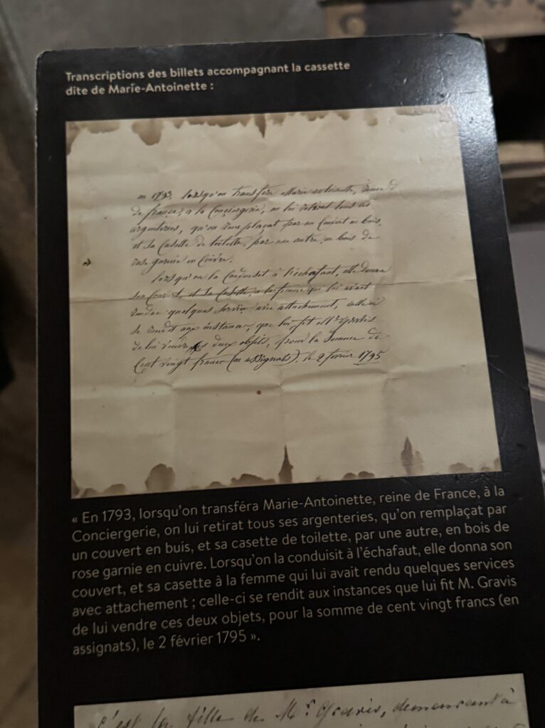 «В 1793 году, когда Мария-Антуанетта, королева Франции, была переведена в Консьержери, все её столовые приборы были изъяты и заменены набором столовых приборов из самшита, а несессер – другим, из розового дерева с медной отделкой. Когда её вели на эшафот, она отдала свои столовые приборы и несессер женщине, которая оказала ей некоторые любезные услуги. Последняя выполнила просьбу господина Грависа продать ей эти два предмета за сто двадцать франков (ассигнациями) 2 февраля 1795 года.»