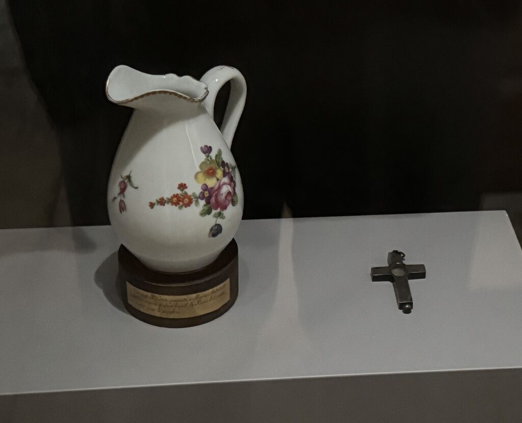Флакон для святой воды. 4-я четверть XVIII века Фарфор. Говорят, что этот флакон со святой водой использовалась королевой в её келье в Консьержери. Её подарила ей дочь, герцогиня Ангулемская. (на стене около платья)
