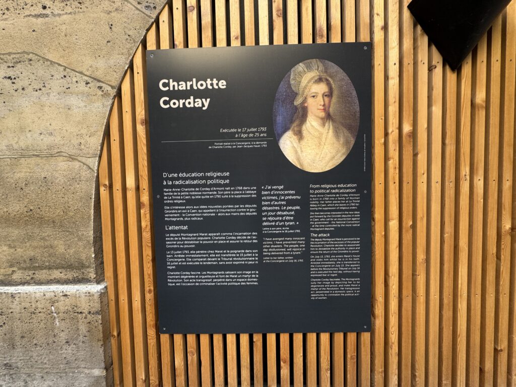 Правнучка драматурга Корнеля, Шарлотта Корде в камере. Шарлотту Корде заключили в тюрьму Консьержери и судили там после того, как она убила (по её мнению — виновника гражданской войны, «убила одного, чтобы спасти сто тысяч») Жан-Поля Марата, а затем она была казнена на гильотине 17 июля 1793 года. Одним из необъяснимых вариантов памями о Корде является шляпка «Шарлотта», как у Рины Зелёной в роли черепахи Тортиллы.