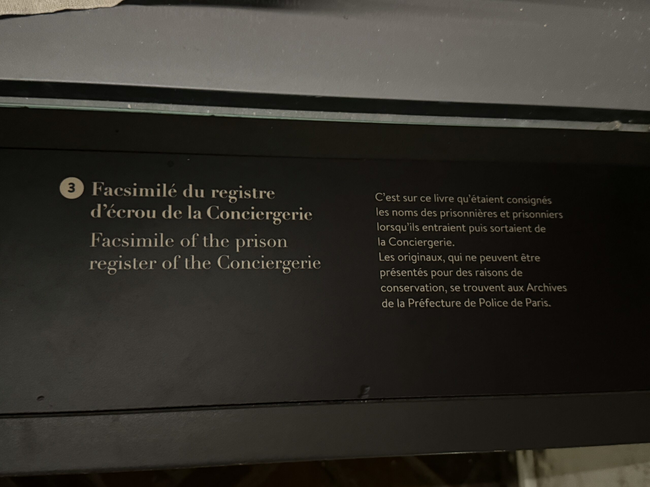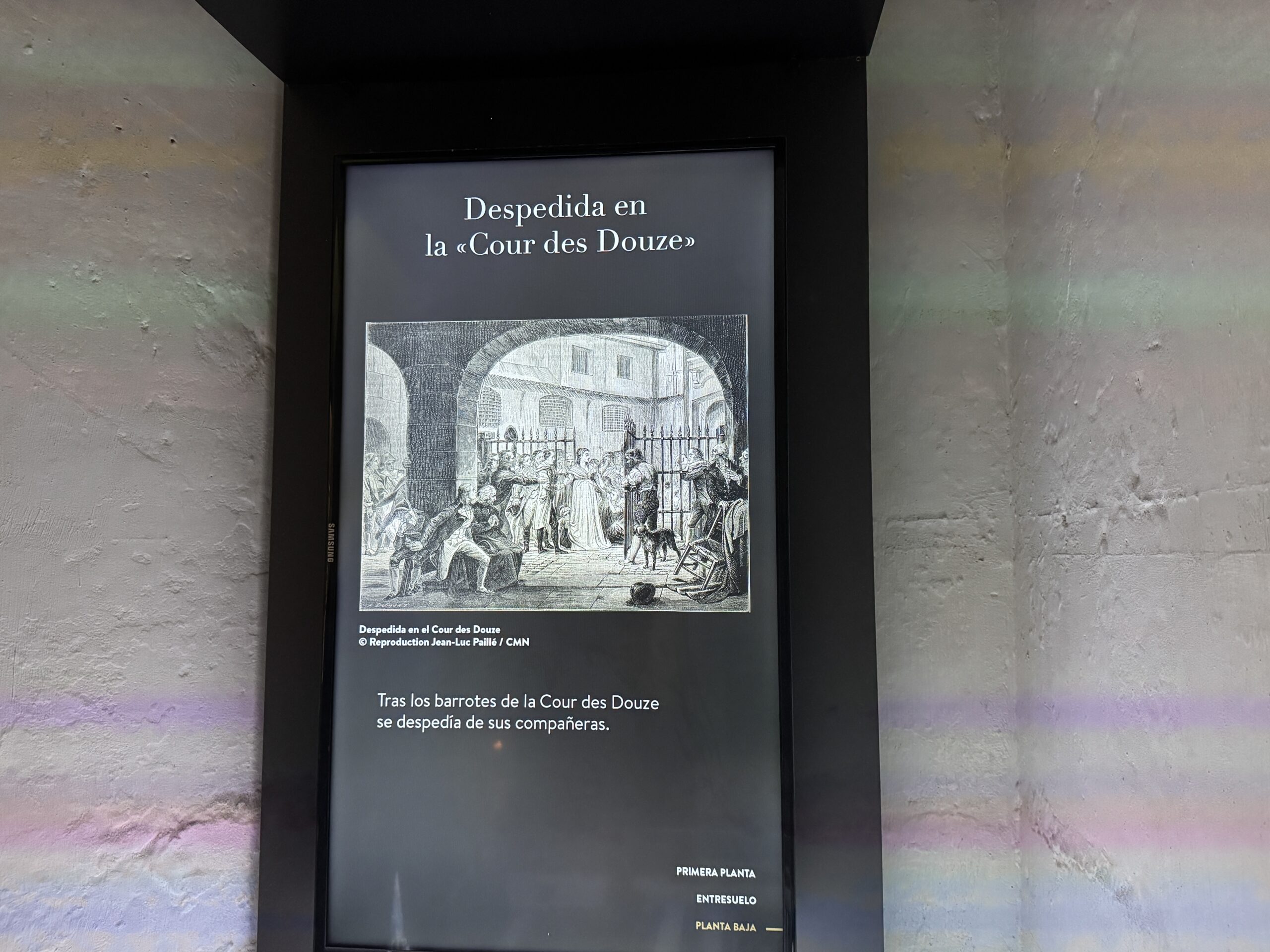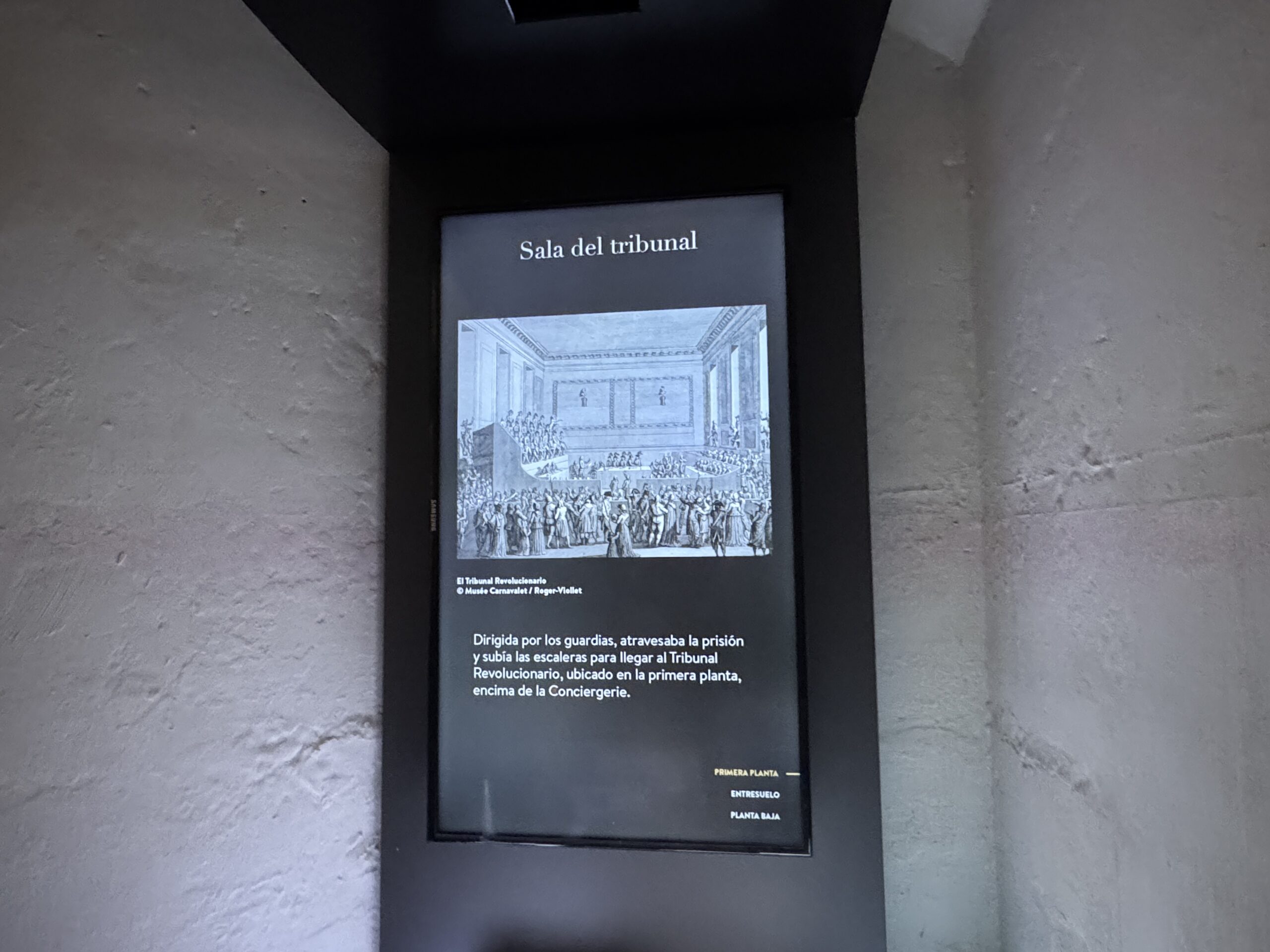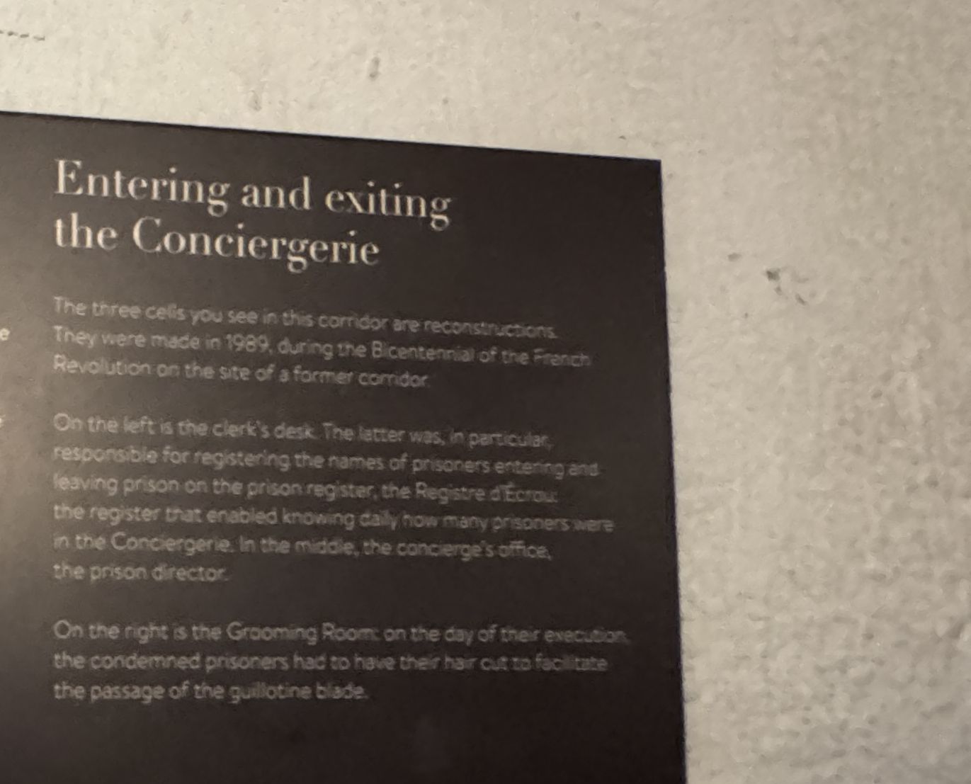 Вход и выход из Консьержери. Три камеры, которые вы видите в этом коридоре, являются реконструкциями. Они были сделаны в 1989 году, во время двухсотлетия Французской революции, на месте бывшего коридора. Слева находится стол клерка. Последний, в частности, отвечал за регистрацию имён заключённых, поступающих в тюрьму и покидающих её, в тюремном журнале «Registr d’Ecrouc» – журнале, который позволял ежедневно отслеживать количество заключённых в Консьержери. В центре – кабинет консьержа, директора тюрьмы. Справа — комната для стрижки: в день казни приговоренным приходилось стричь волосы, чтобы облегчить прохождение лезвия гильотины.