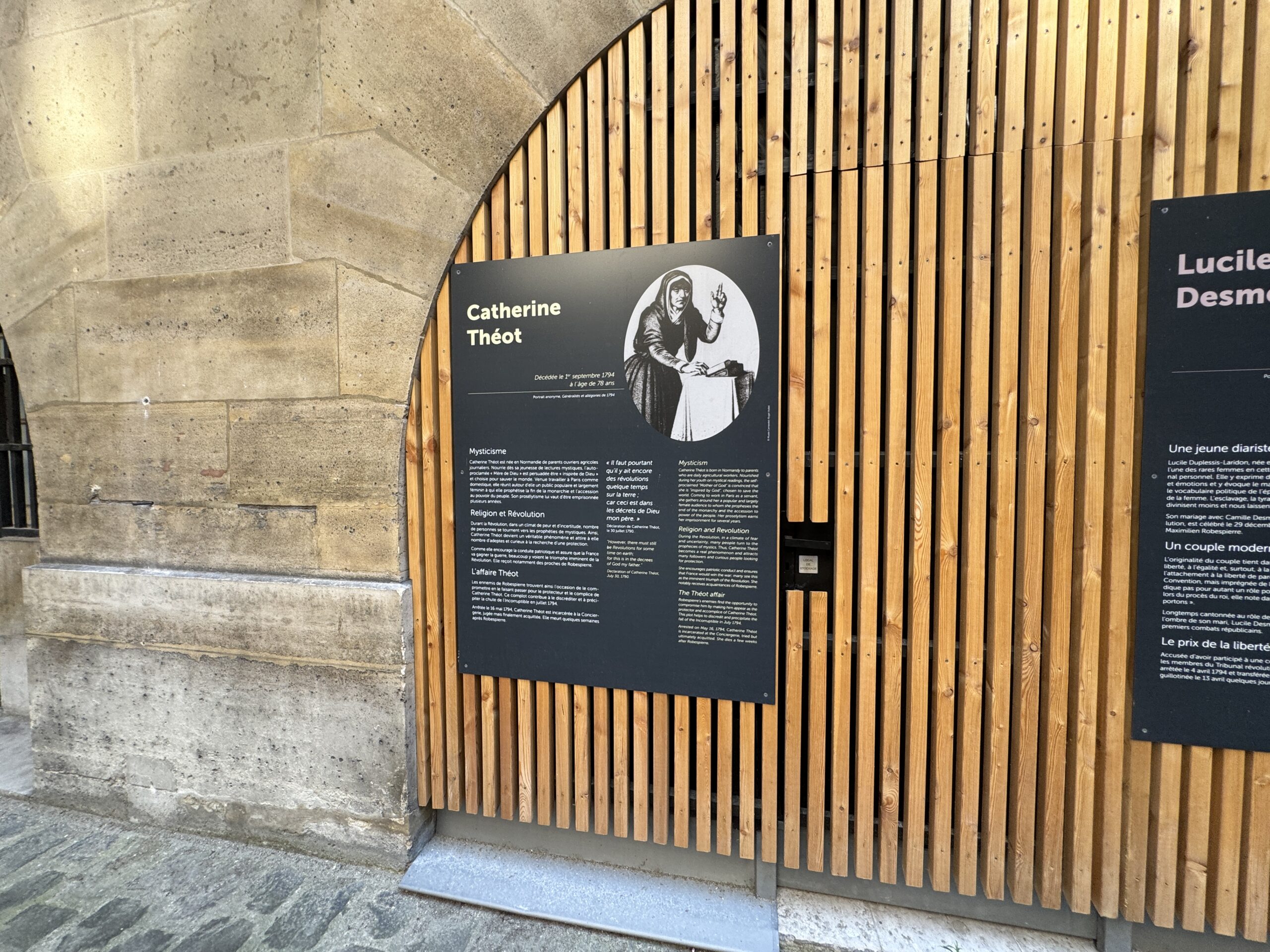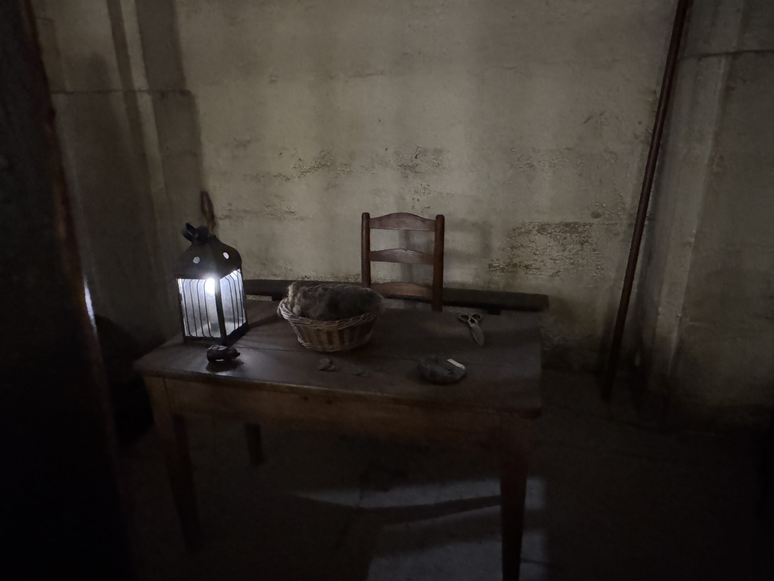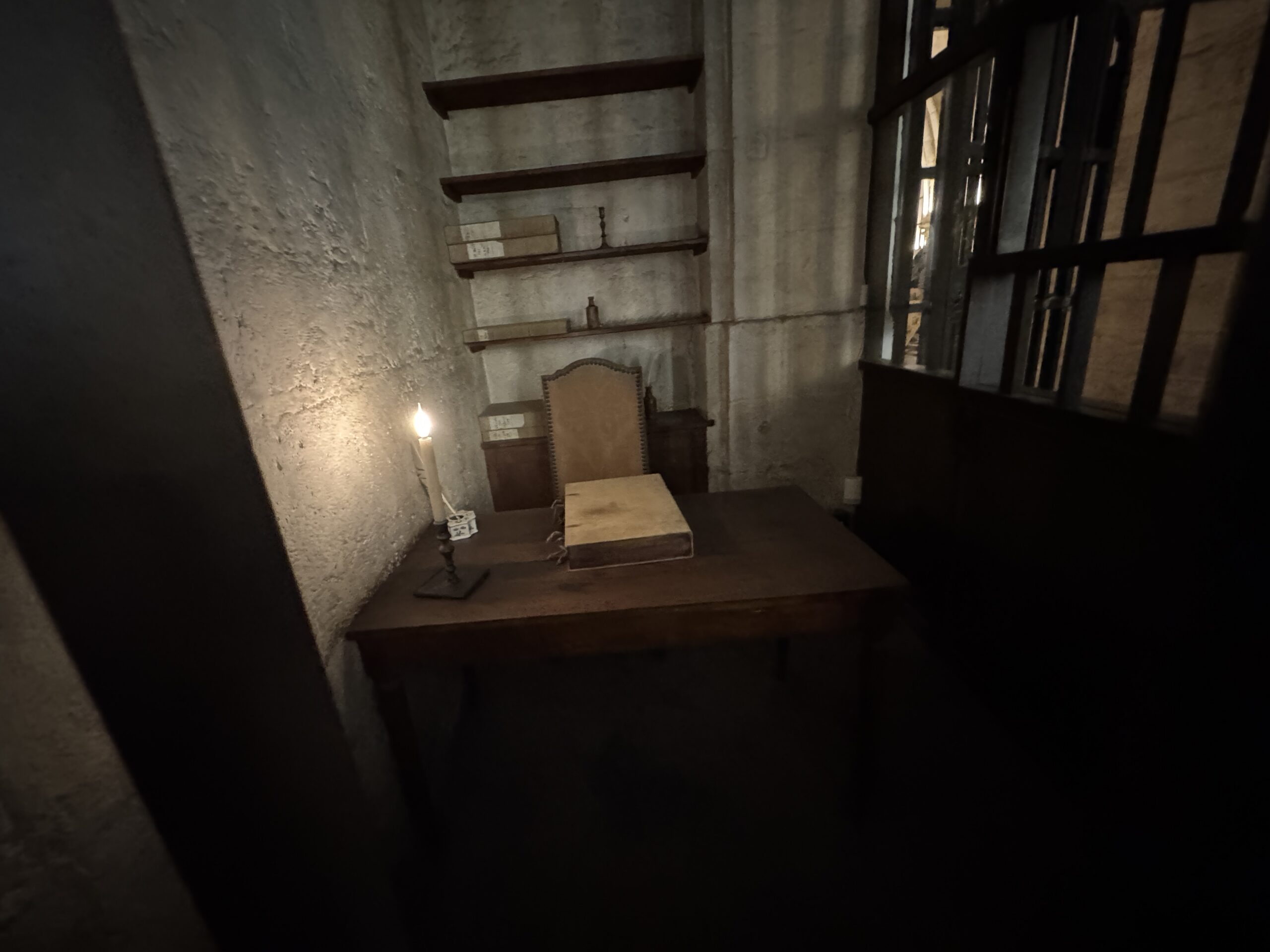Вход и выход из Консьержери. Три камеры, которые вы видите в этом коридоре, являются реконструкциями. Они были сделаны в 1989 году, во время двухсотлетия Французской революции, на месте бывшего коридора. Слева находится стол клерка. Последний, в частности, отвечал за регистрацию имён заключённых, поступающих в тюрьму и покидающих её, в тюремном журнале «Registr d’Ecrouc» – журнале, который позволял ежедневно отслеживать количество заключённых в Консьержери. В центре – кабинет консьержа, директора тюрьмы. Справа — комната для стрижки: в день казни приговоренным приходилось стричь волосы, чтобы облегчить прохождение лезвия гильотины.