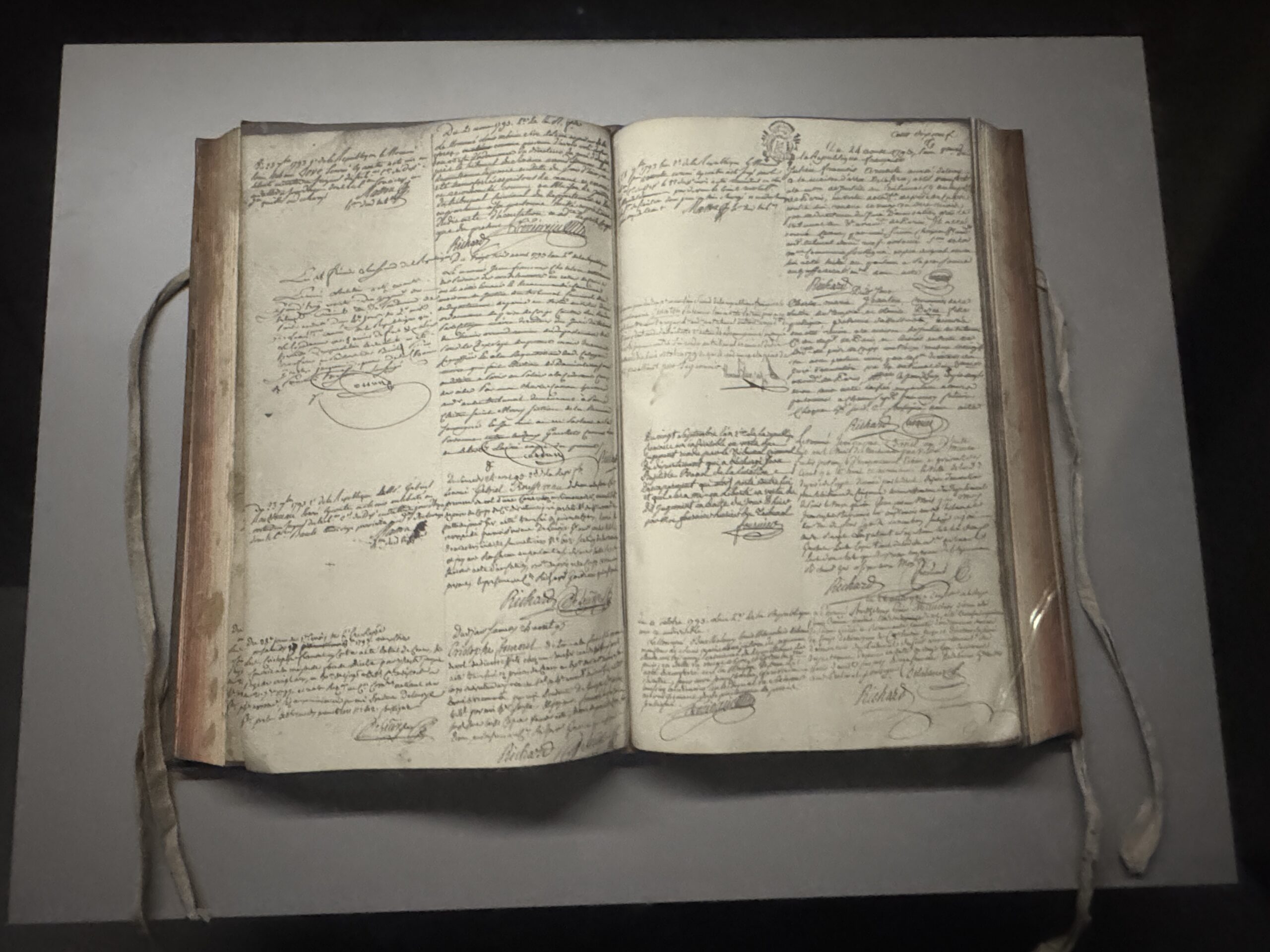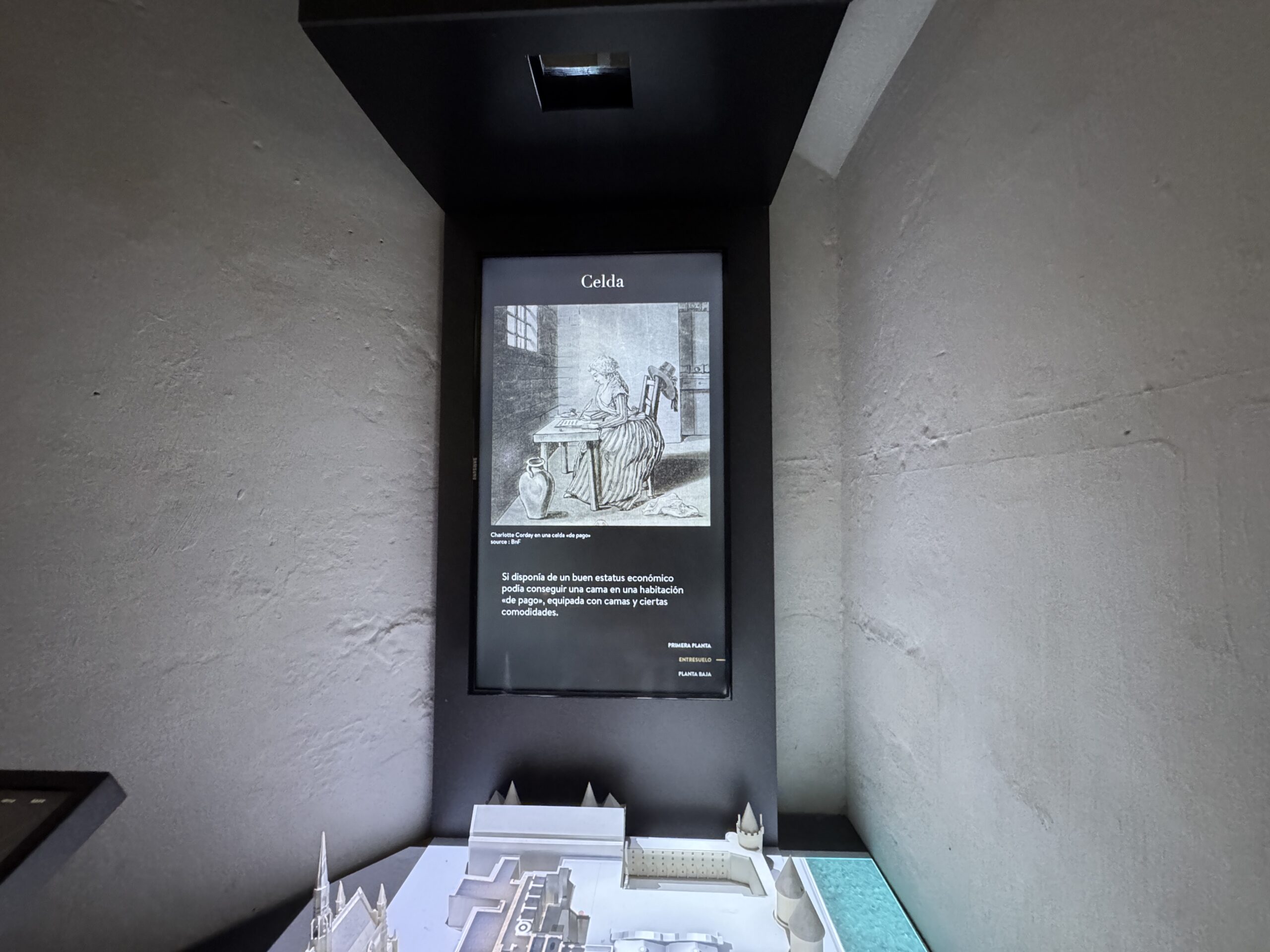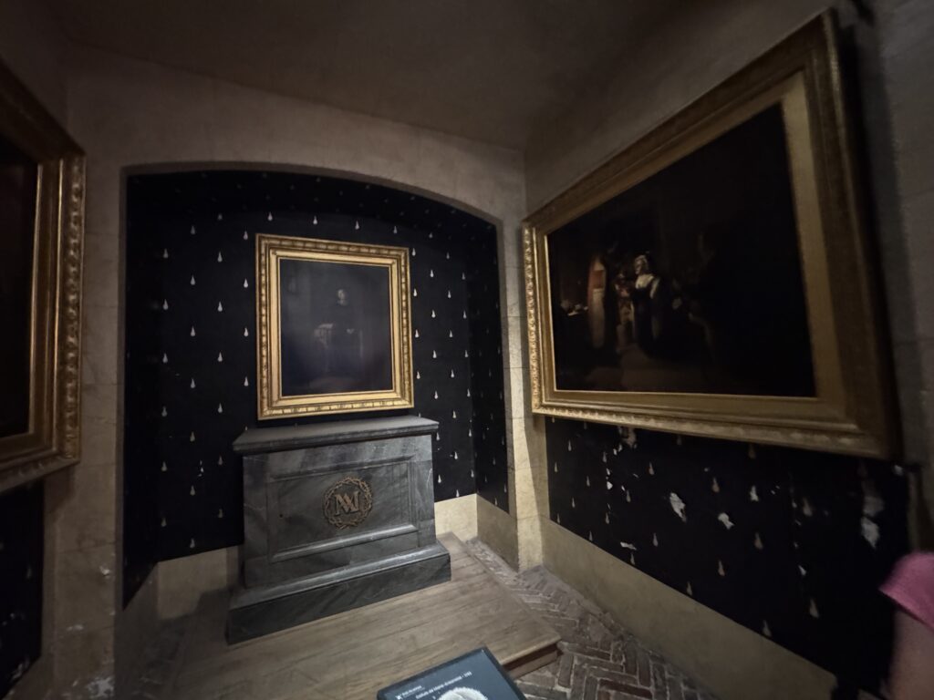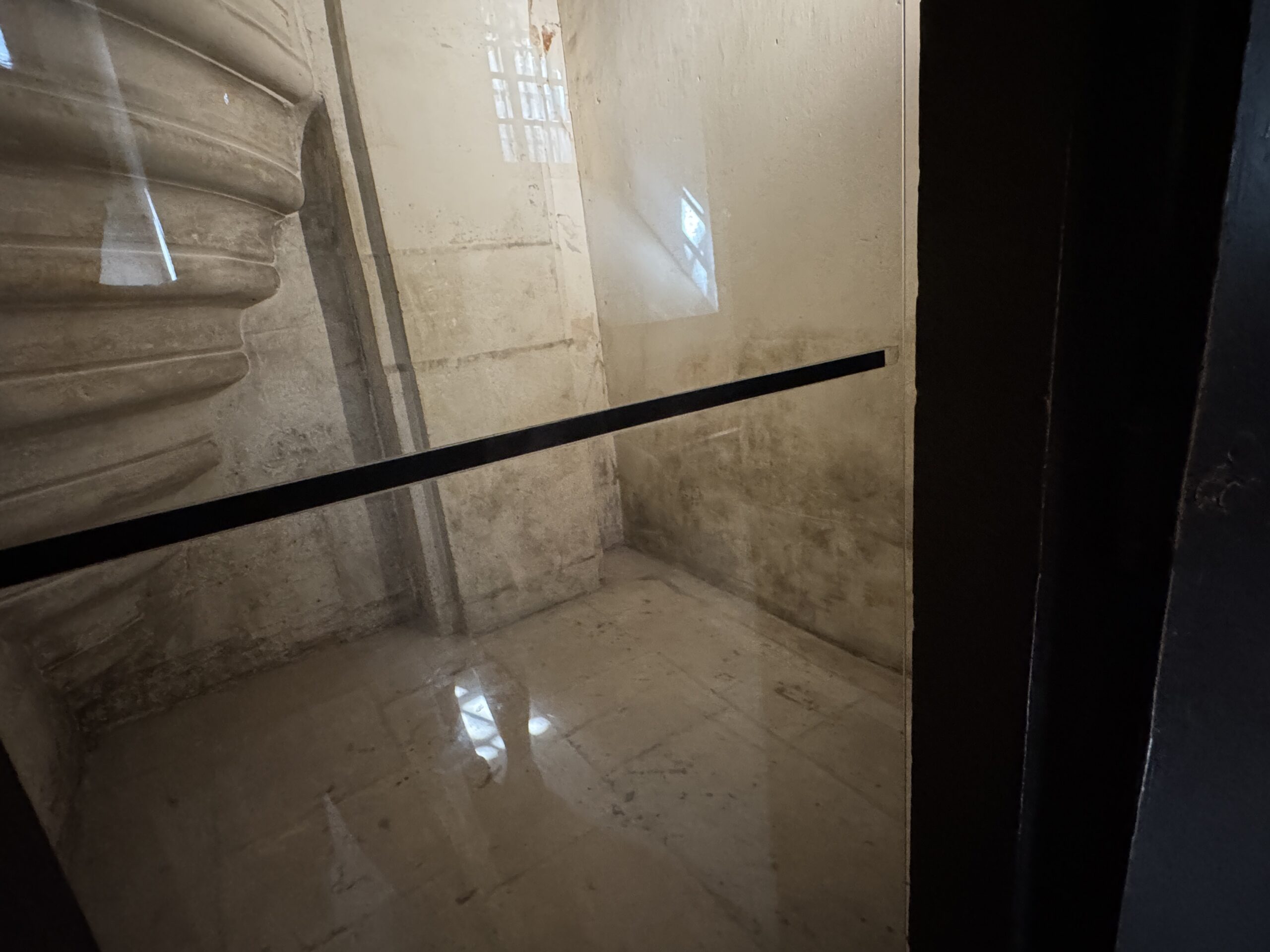 Вход и выход из Консьержери. Три камеры, которые вы видите в этом коридоре, являются реконструкциями. Они были сделаны в 1989 году, во время двухсотлетия Французской революции, на месте бывшего коридора. Слева находится стол клерка. Последний, в частности, отвечал за регистрацию имён заключённых, поступающих в тюрьму и покидающих её, в тюремном журнале «Registr d’Ecrouc» – журнале, который позволял ежедневно отслеживать количество заключённых в Консьержери. В центре – кабинет консьержа, директора тюрьмы. Справа — комната для стрижки: в день казни приговоренным приходилось стричь волосы, чтобы облегчить прохождение лезвия гильотины.