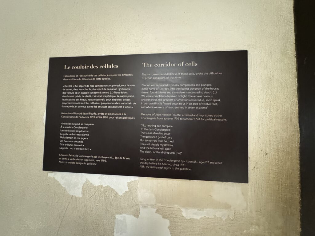 «Вскоре меня разлучили с товарищами и, во имя секретности, бросили в самое грязное подземельеа; там я нашёл воров и убийцу, приговорённого к смертной казни. (…) Мы были совершенно лишены света. Воздух был спертым, нечистота, величайшее из несчастий покрывали нас, так сказать, нашей собственной грязью. Она стекала к нам по площади в двенадцать футов, и нас часто содержали по семь человек одновременно». Мемуары Жана Оноре Риуффа, арестованного и заключенного в Консьержери с осени 1793 года по лето 1794 года по политическим мотивам.