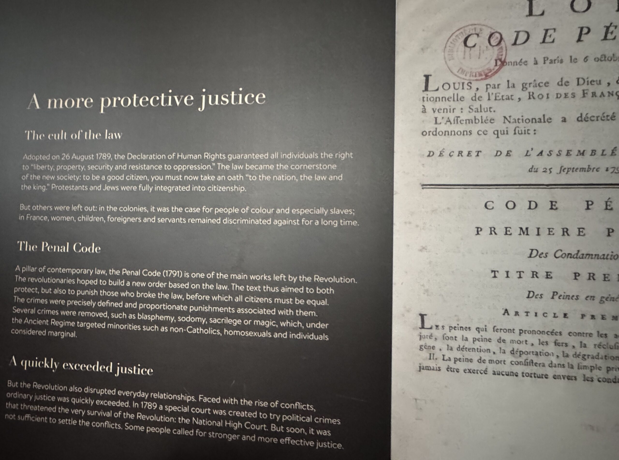 Уголовный кодекс. Один из столпов современного права, Уголовный кодекс (1791 г.) – один из главных документов, оставленных Революцией. Революционеры надеялись построить новый порядок, основанный на законе. Таким образом, текст был призван как защищать, так и наказывать нарушителей закона, перед которым все граждане равны. Преступления были точно определены, и наказания за них были соразмерны. Некоторые преступления, такие как богохульство, содомия, святотатство или магия, были исключены из списка, которые при Старом режиме преследовали меньшинства, такие как не-католики, гомосексуалы и лица, считавшиеся маргиналами.